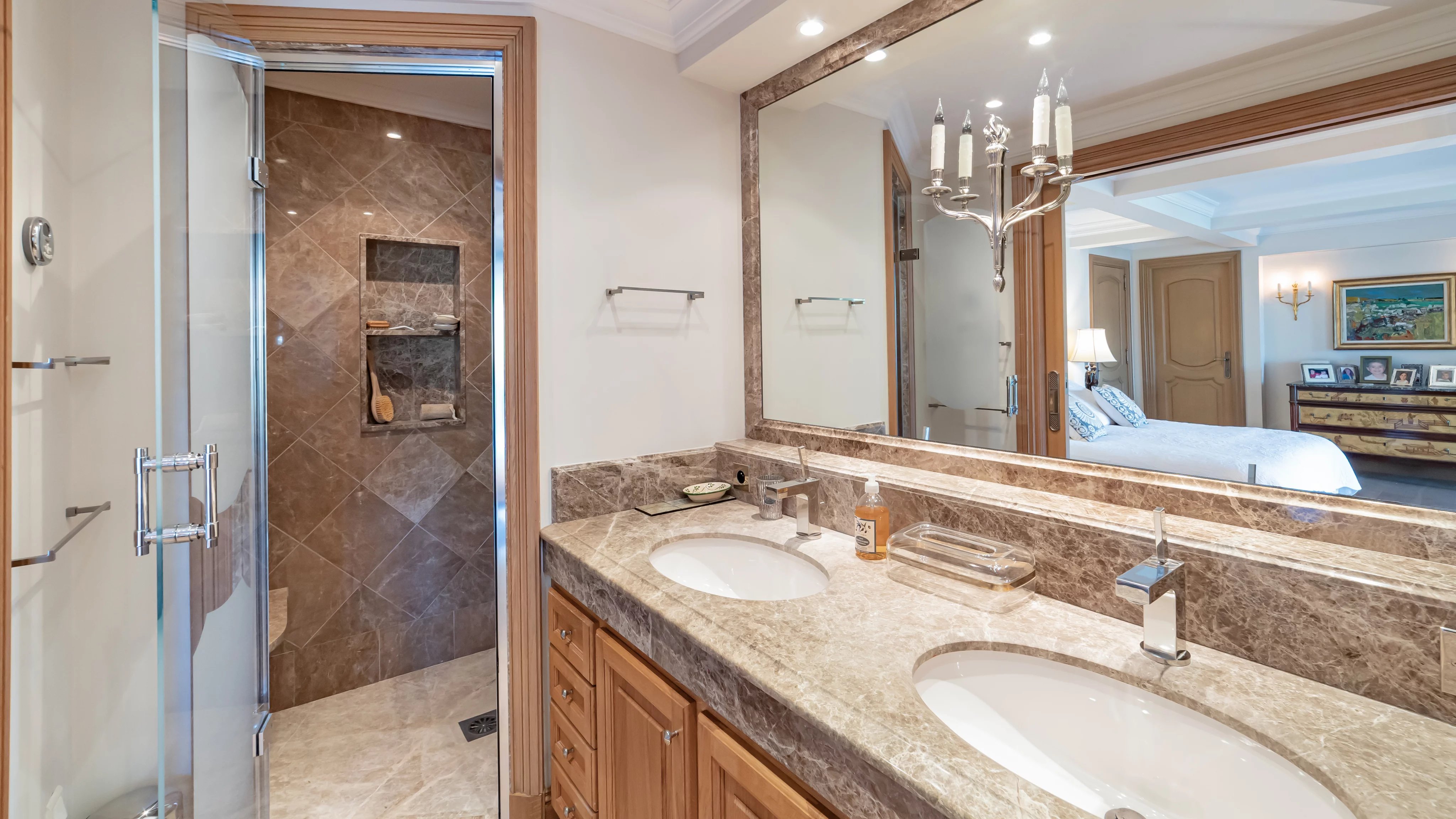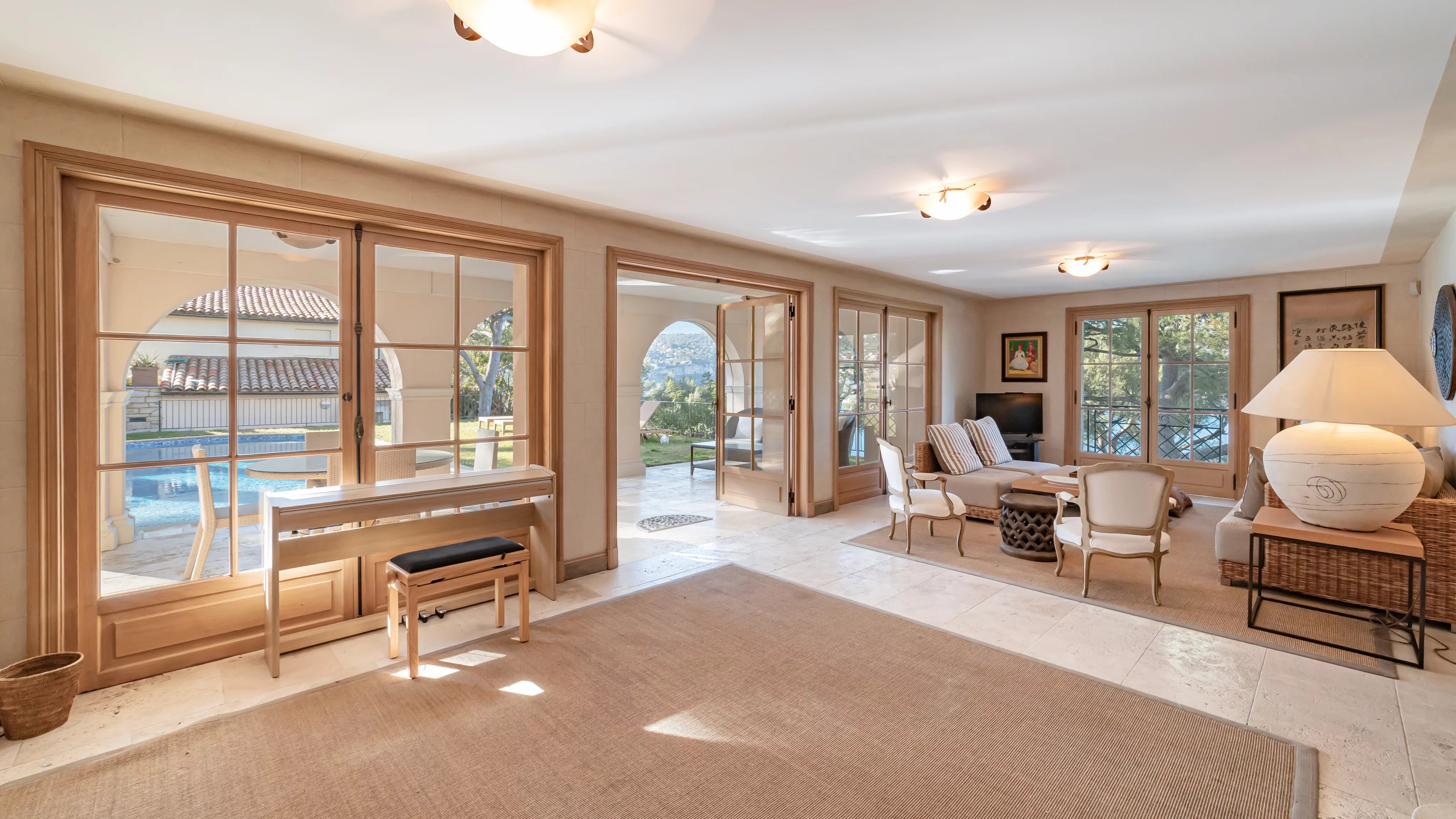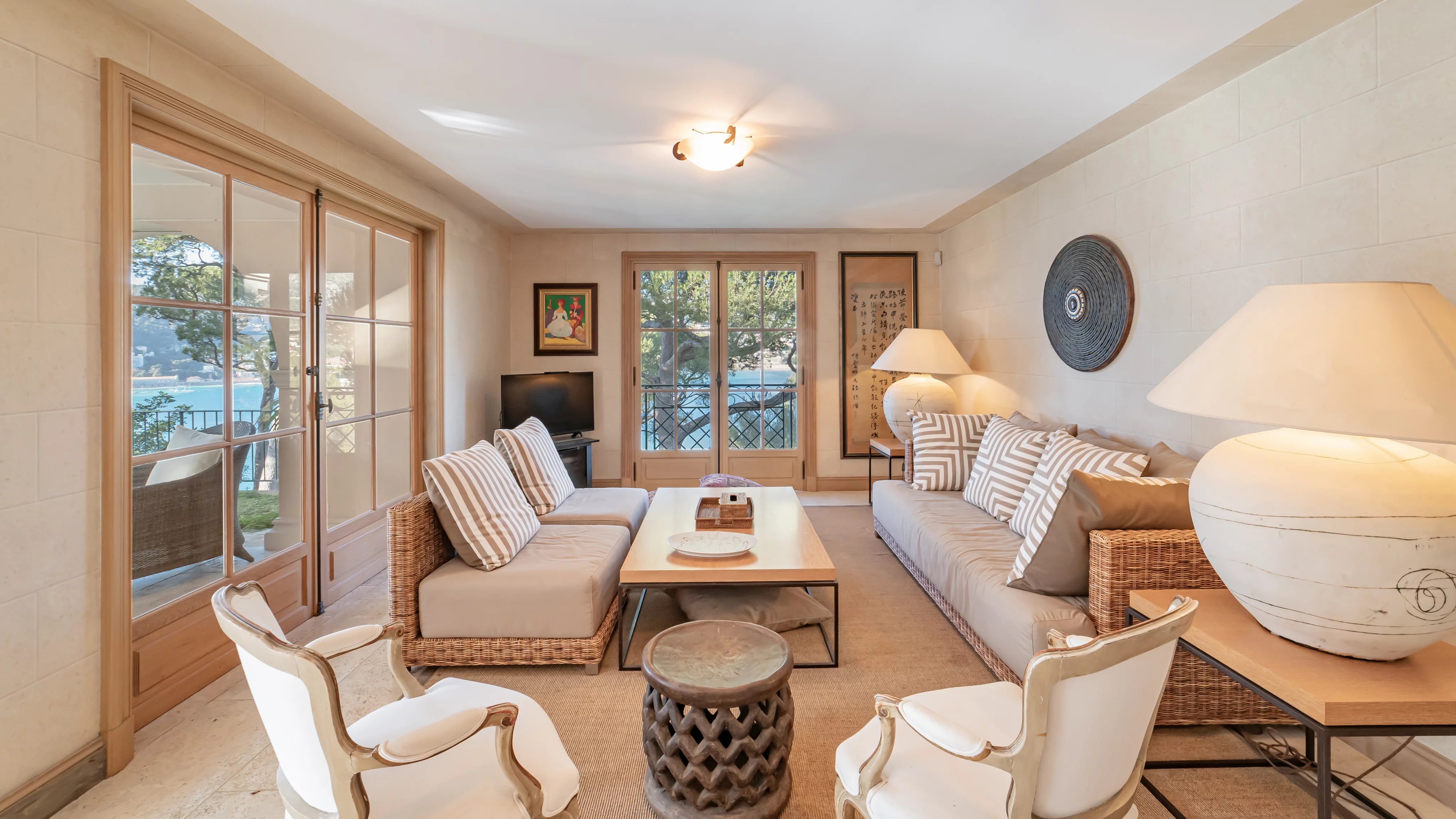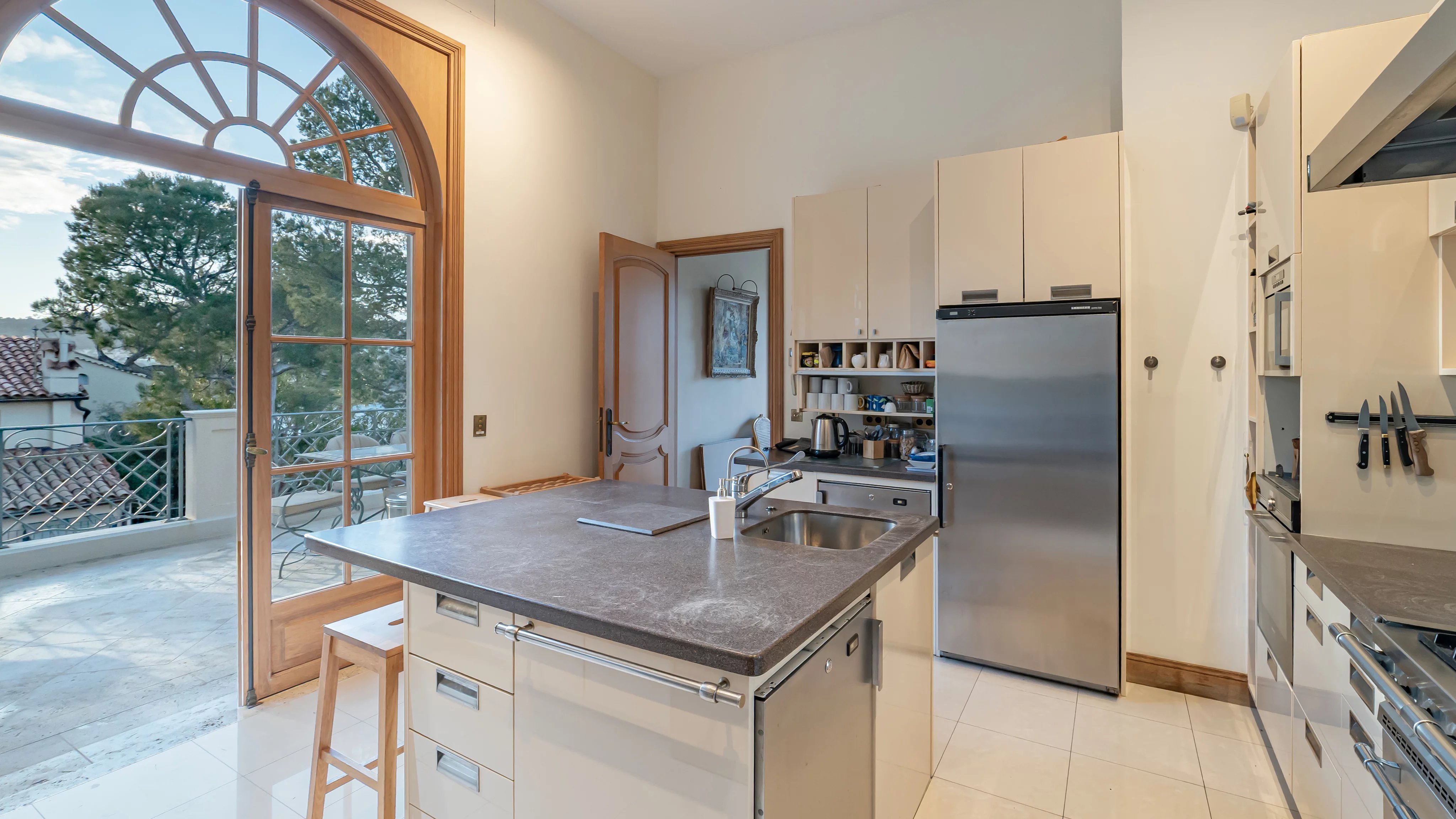 Вход на виллу расположен на двух уровнях и ведет в двойную гостиную с террасой, откуда открывается вид на старый город Вильфранш. На этом этаже расположены официальная столовая, большая кухня и спальня с ванной комнатой.