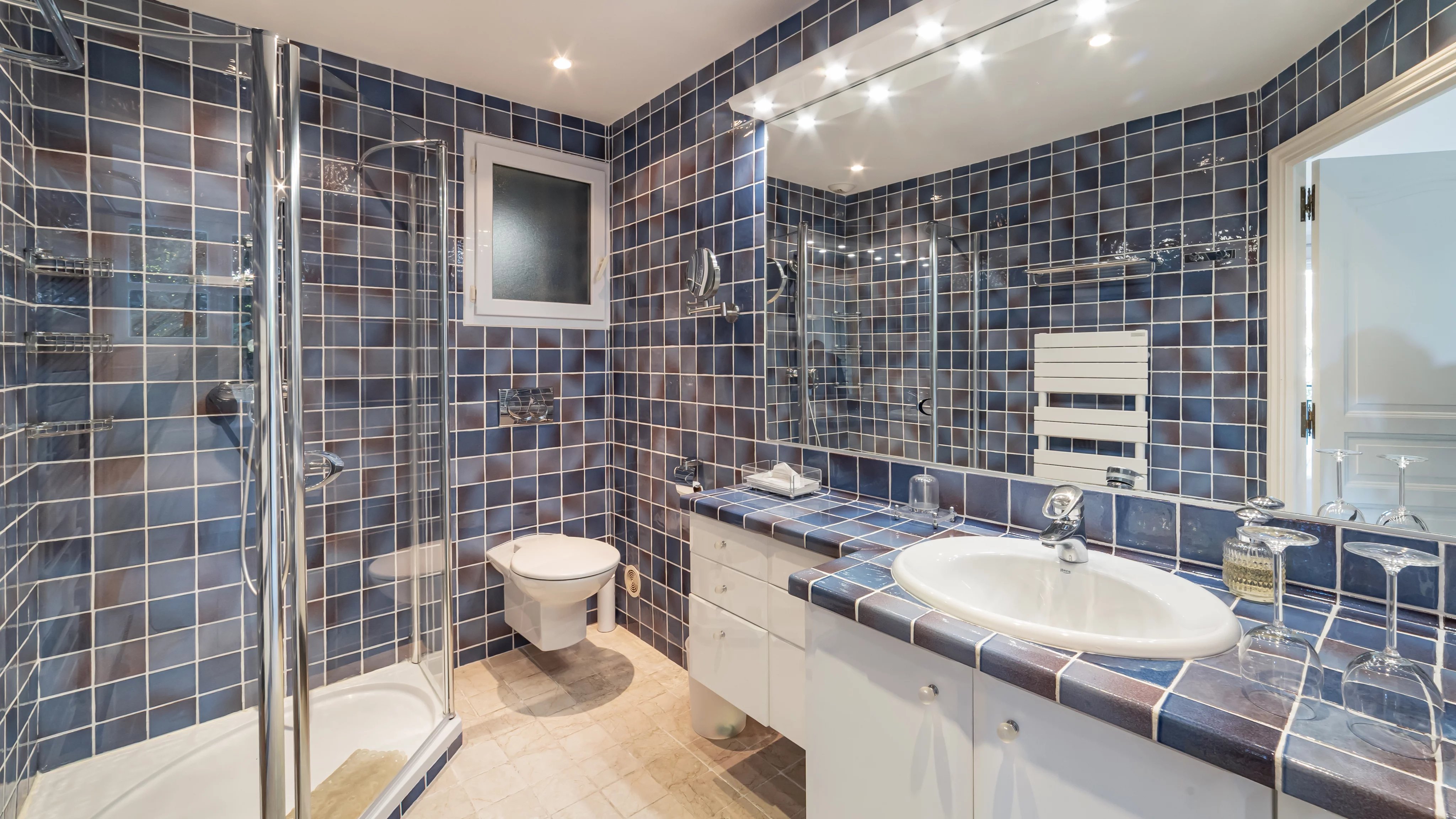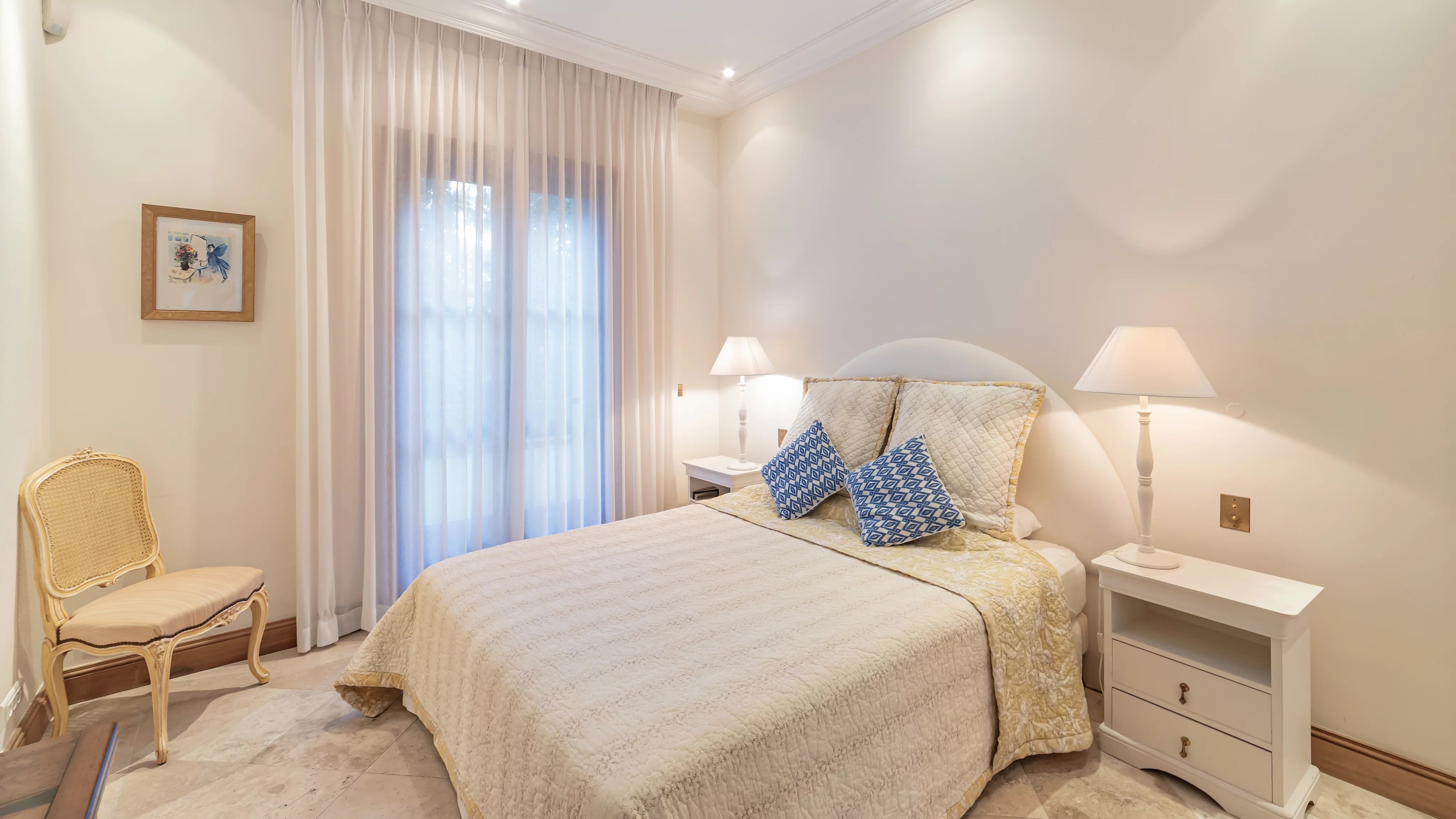 На уровне сада расположены большая летняя гостиная с кухней, выходящая на просторную террасу и бассейн, три спальни с ванными комнатами и подсобное помещение.
