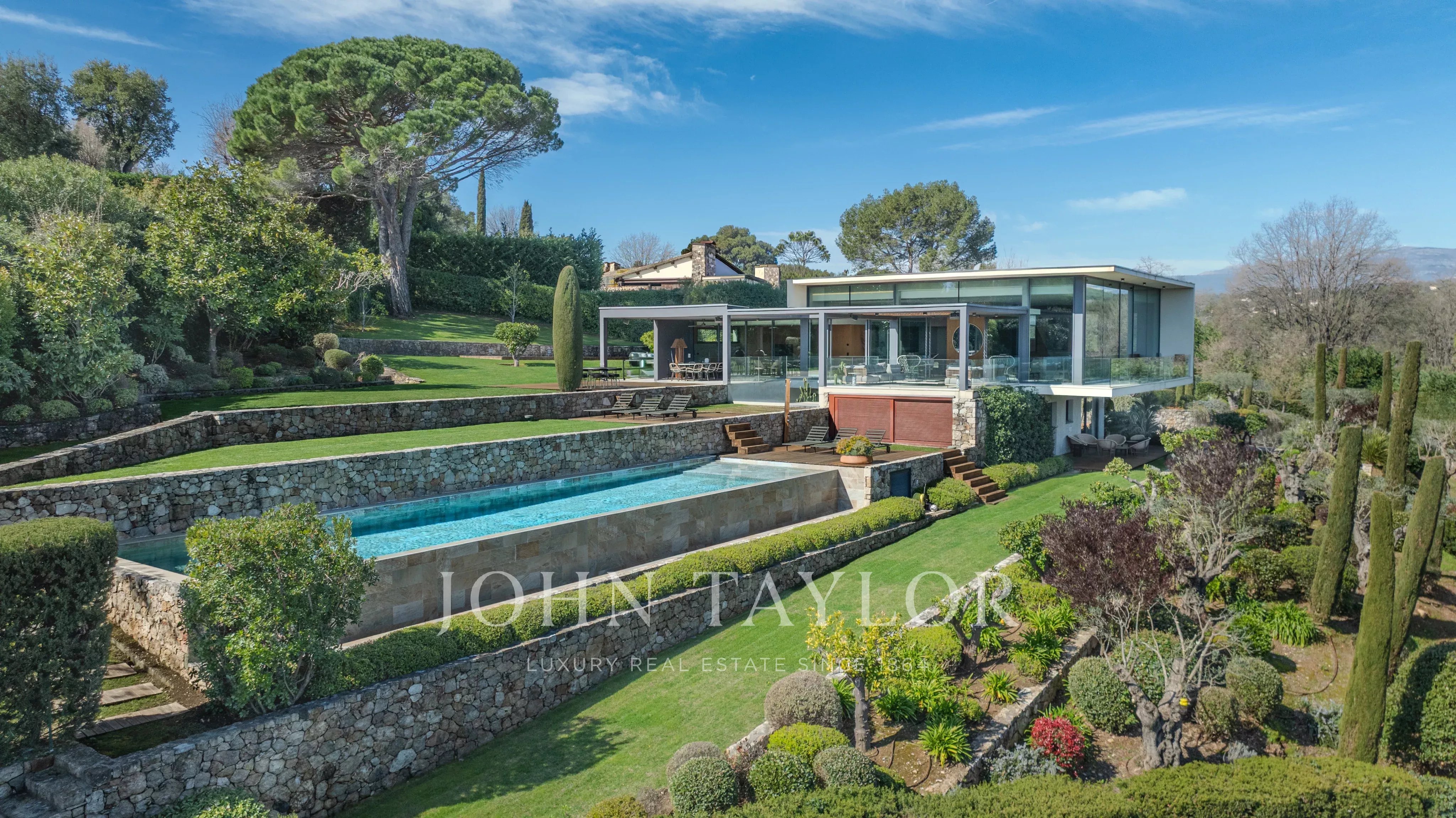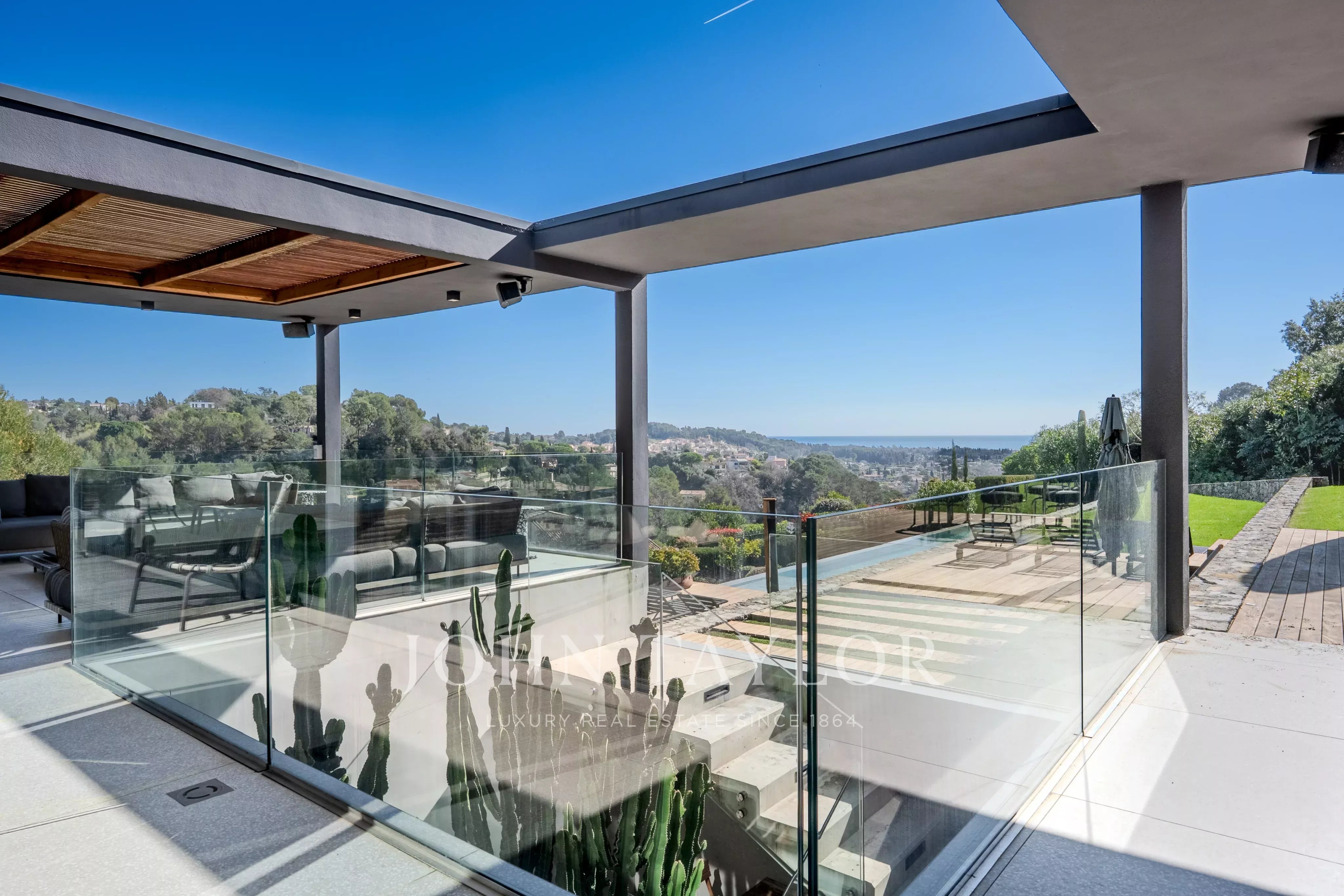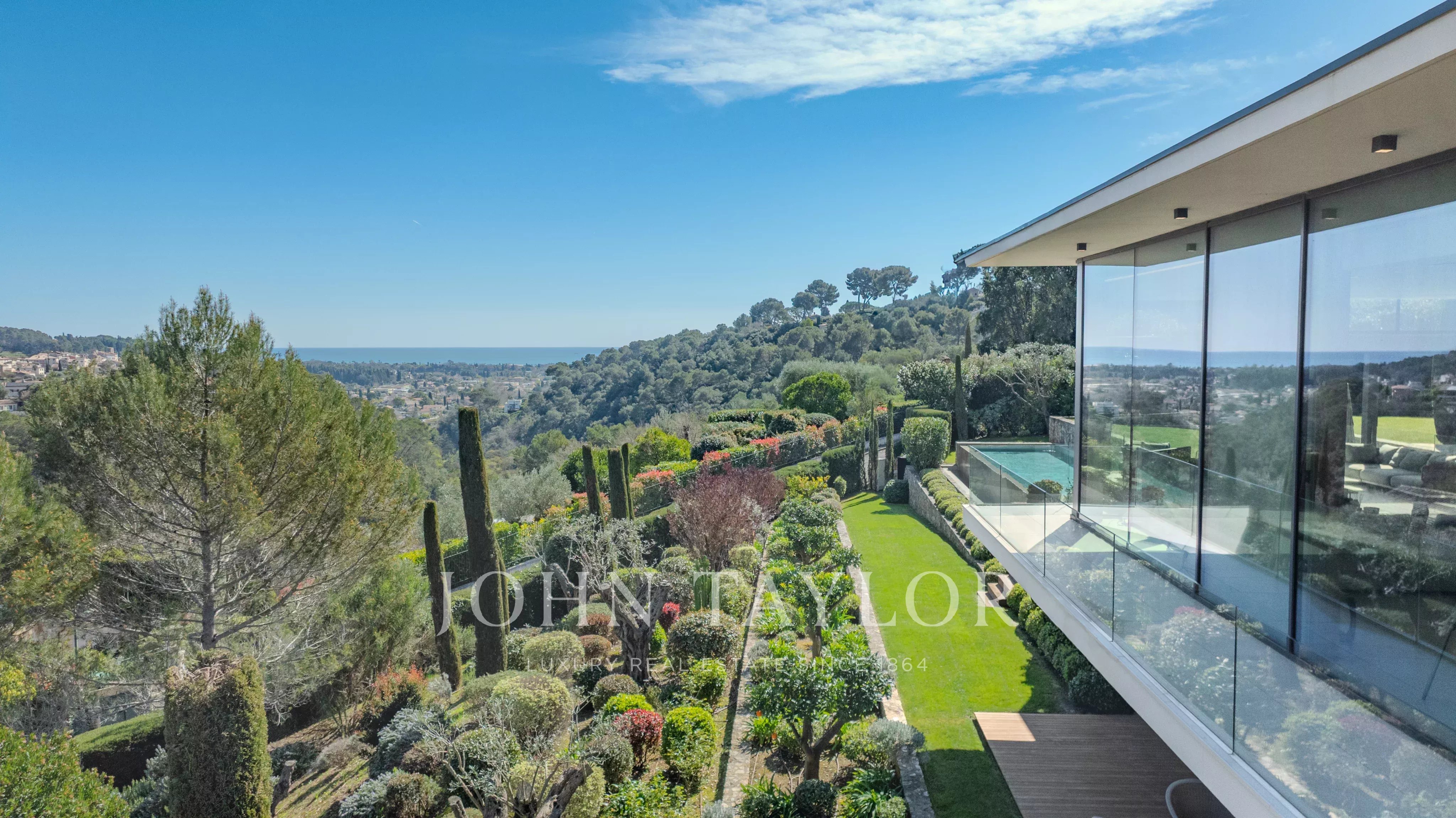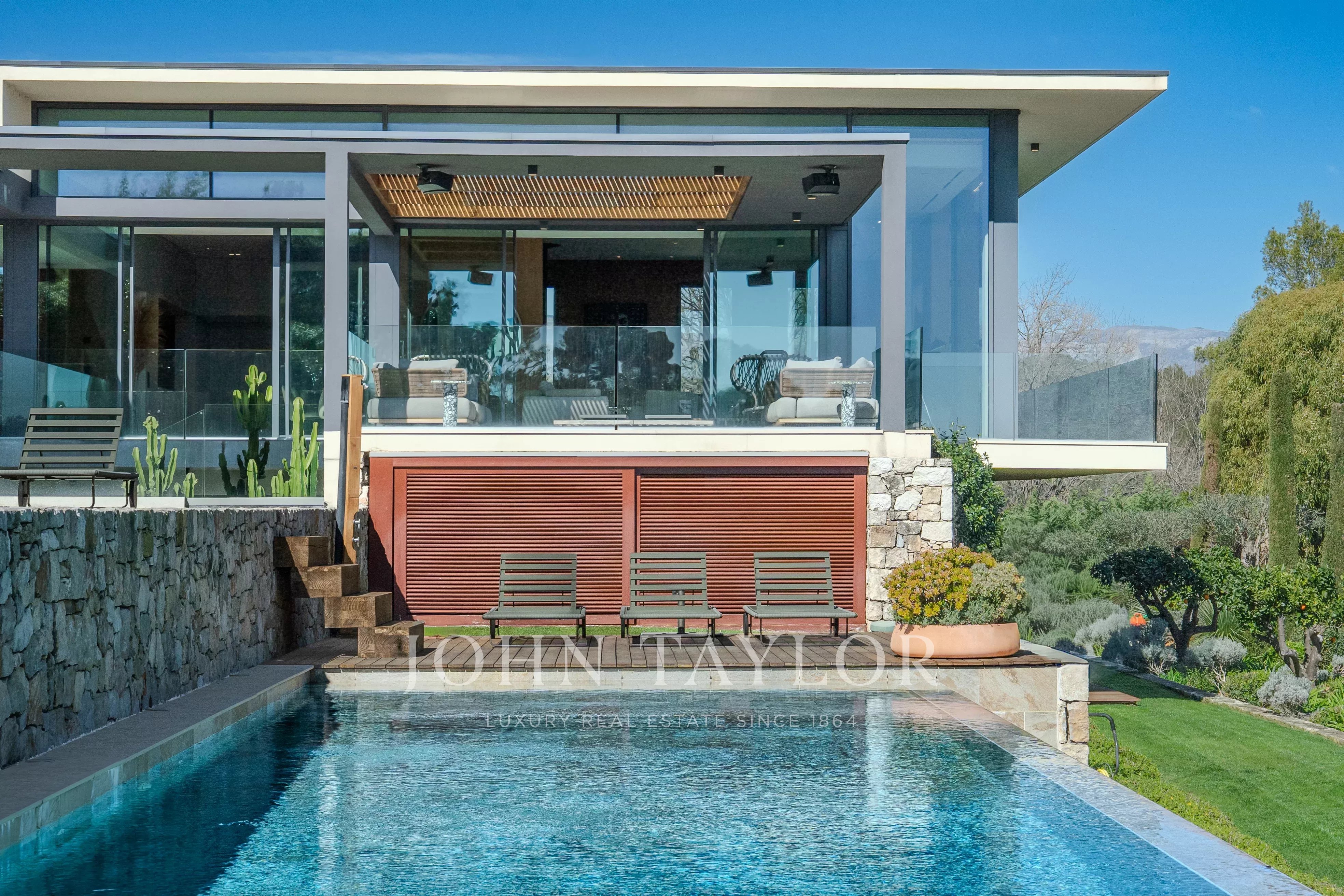 В престижном районе, в абсолютной тишине, великолепная современная вилла с видом на море и деревню, расположенная на ухоженной территории площадью около 4000 м2 с подогреваемым бассейном с переливом 18x4 м.