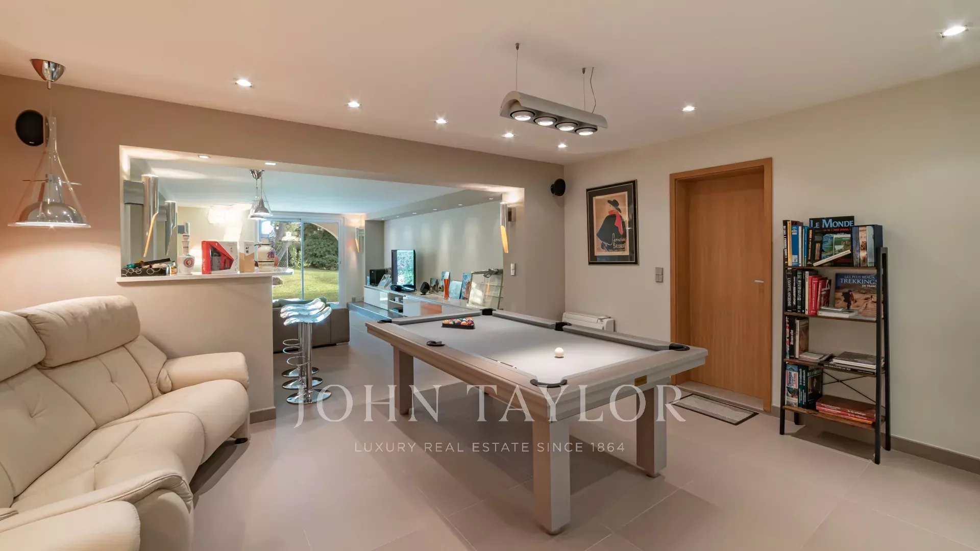 На уровне сада находится огромное пространство, предназначенное для проведения досуга: тренажерный зал, зона отдыха с джакузи и сауной, кинозал, а также гостиная, выходящая в сад, с бильярдным столом, баром и винным погребом.
