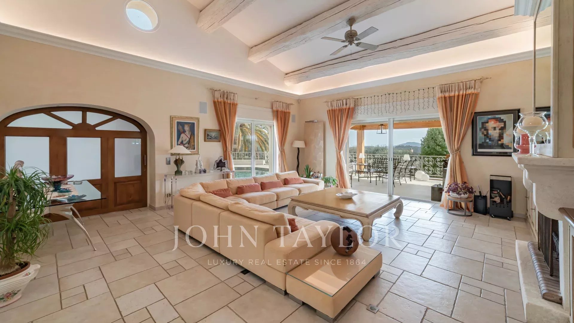 Из гостиной есть выход к бассейну и на большую террасу, частично покрытую деревянным каркасом и оборудованную печью для пиццы, где можно расслабиться и насладиться отдыхом на свежем воздухе.