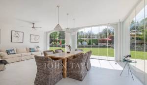 Гостиная открытой планировки переходит в столовую и просторную гостиную с камином, большими картинными окнами и прекрасным видом на бассейн и плоский сад, создавая легкую и воздушную атмосферу.