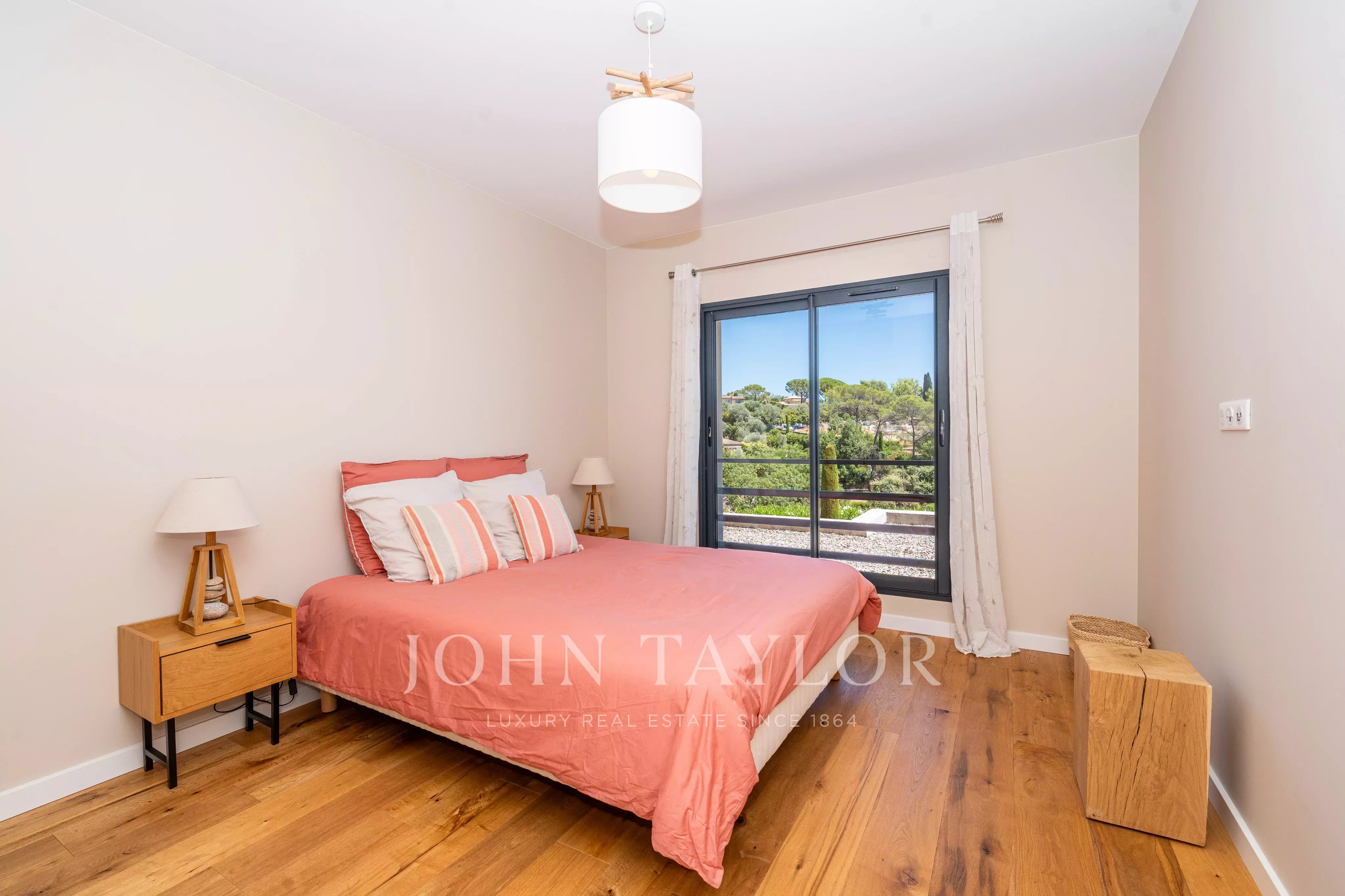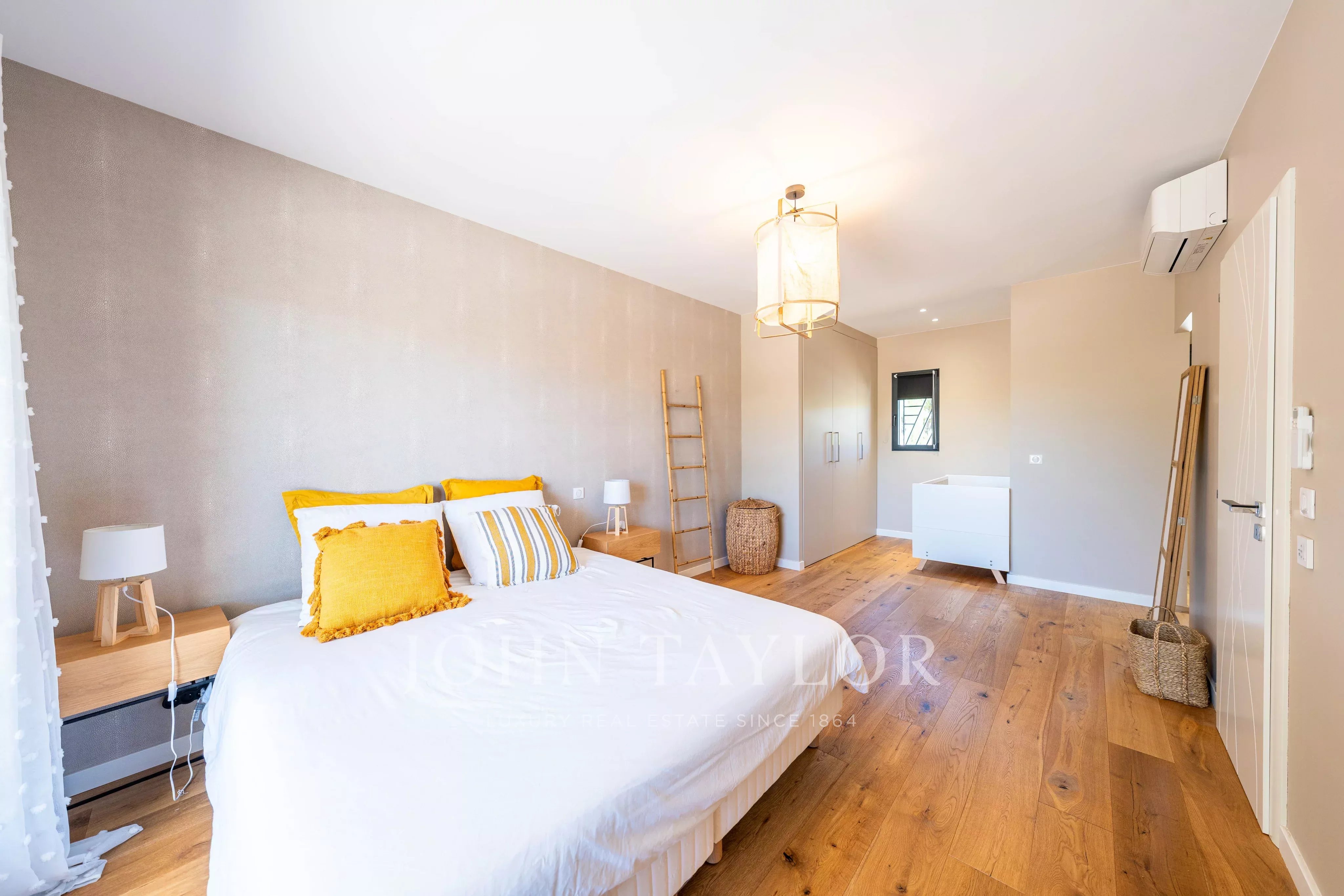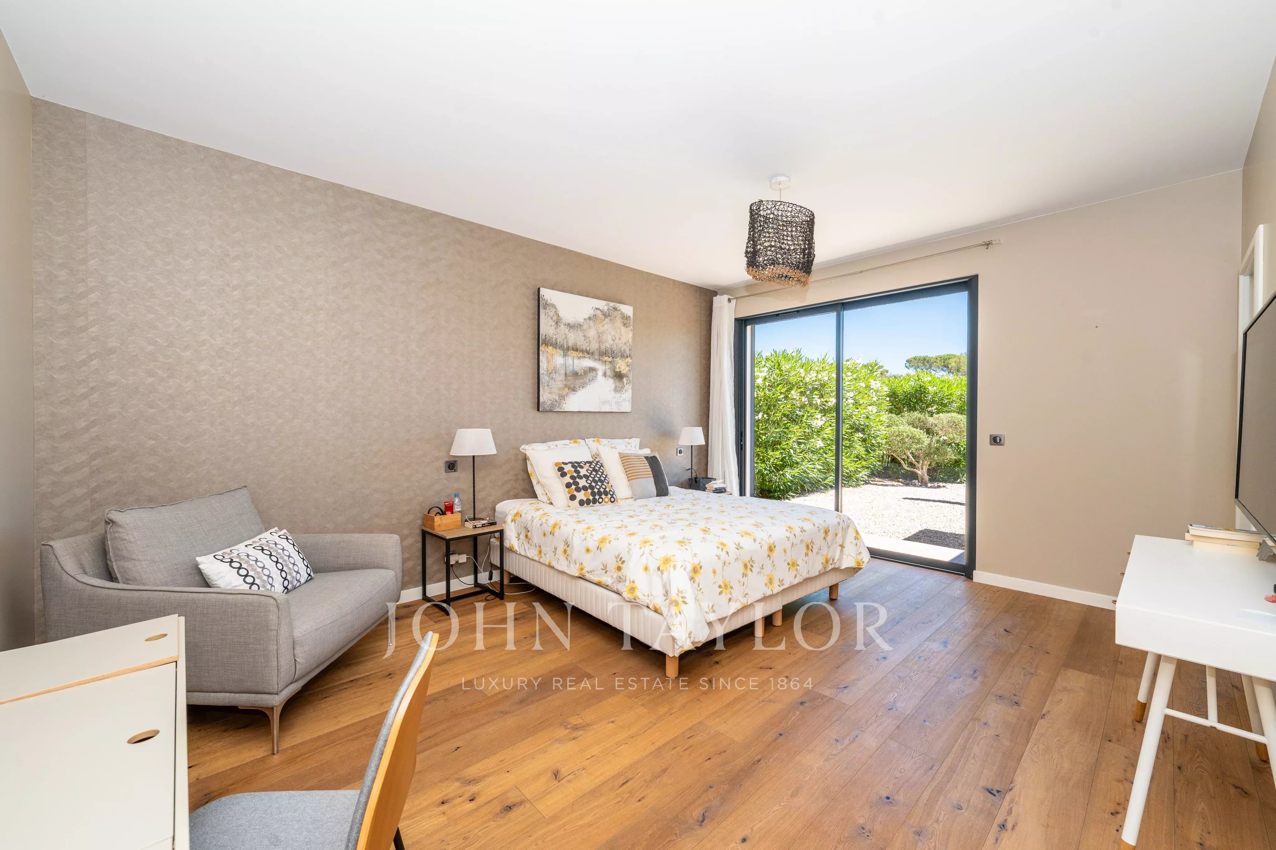 На уровне сада: вход, ведущий в светлую гостиную, кухня, открытая к столовой, прачечная, мастер-сьют около 37 м² с ванной комнатой и гардеробной, отдельный туалет.