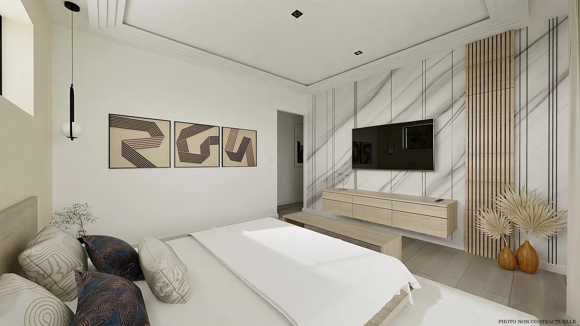 Большая зона отдыха площадью 70 м² с гостиной/столовой и кухней открытого плана; спальня с душевой комнатой, туалетом и гардеробной.