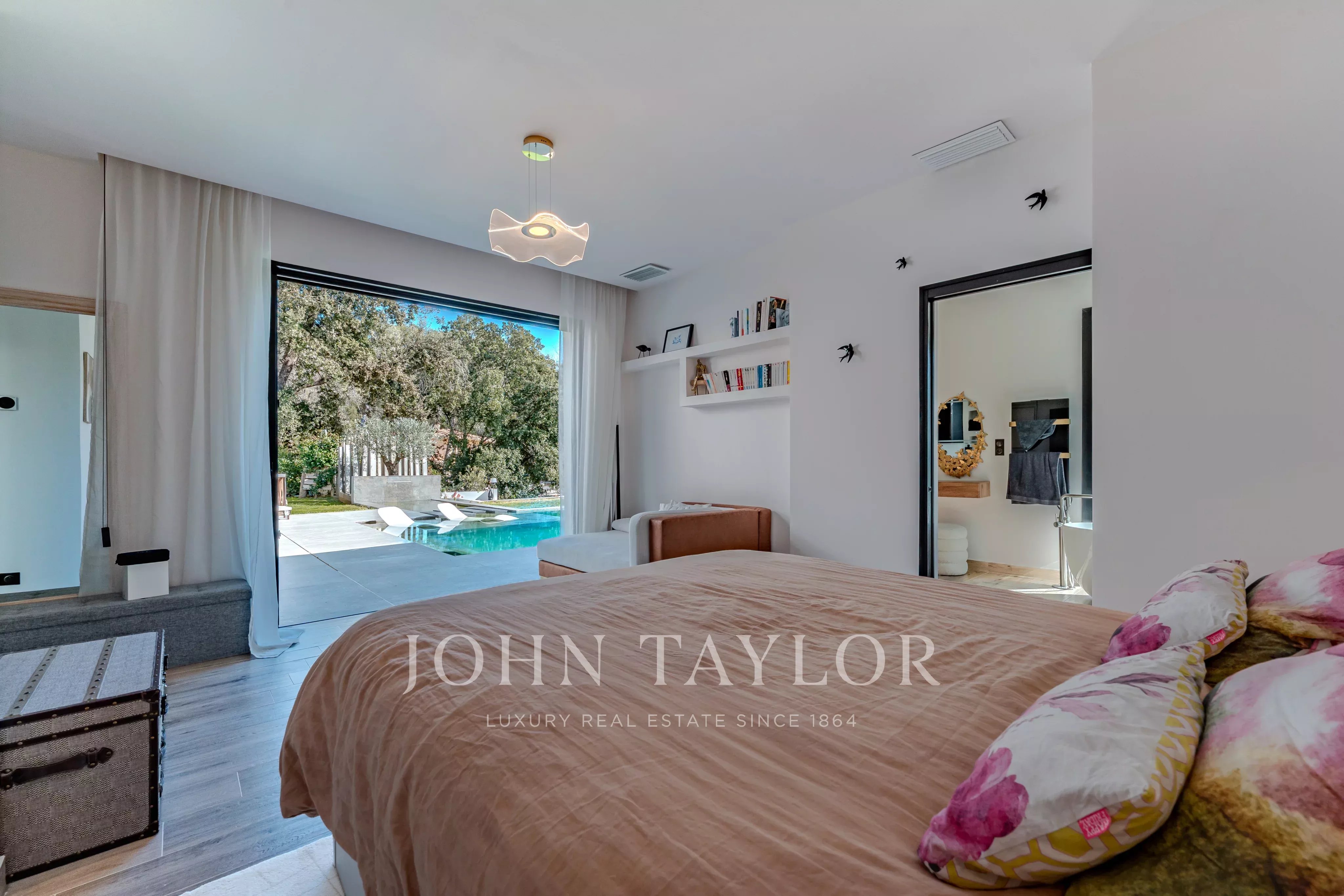 На участке площадью 3 115 кв. м с ландшафтным дизайном находится бассейн с бесконечным видом, полностью оборудованный домик у бассейна (душ и туалет), уютный мангал и площадка для игры в петанк.