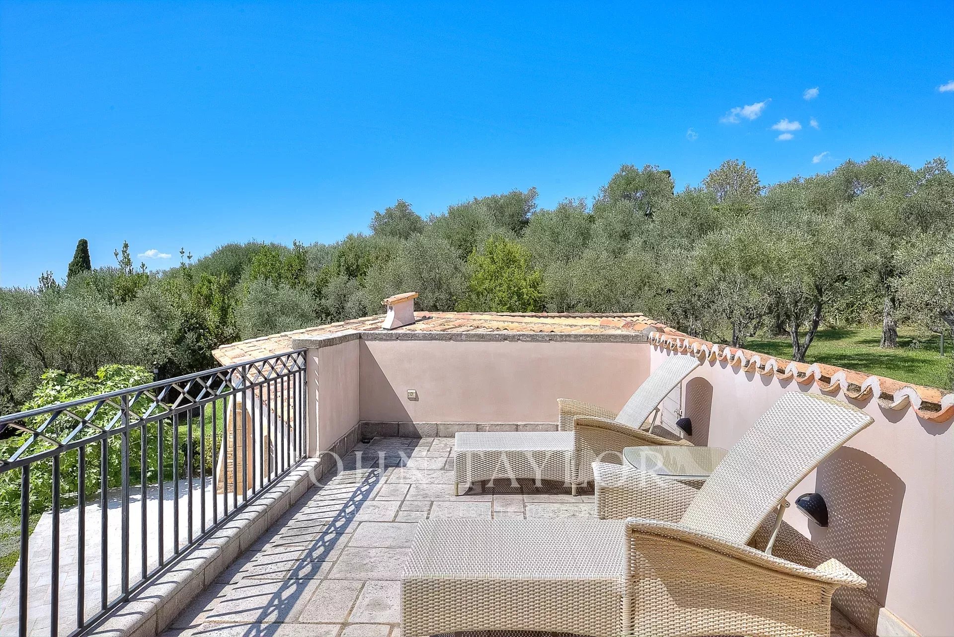 На территории площадью 10 000 м², оформленной по проекту Жана Муса, расположены пологие террасы, каменные стены и 160 оливковых деревьев.