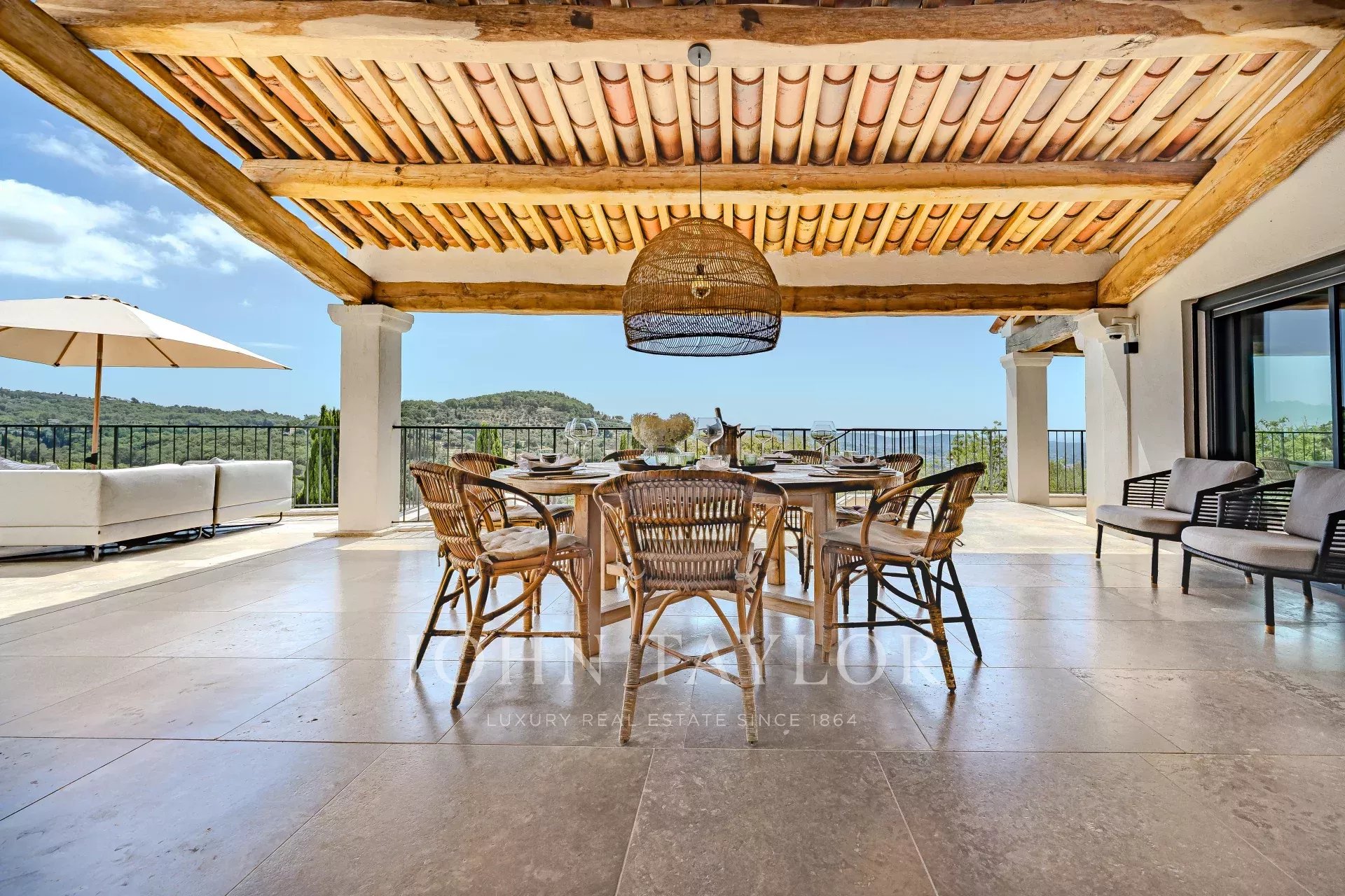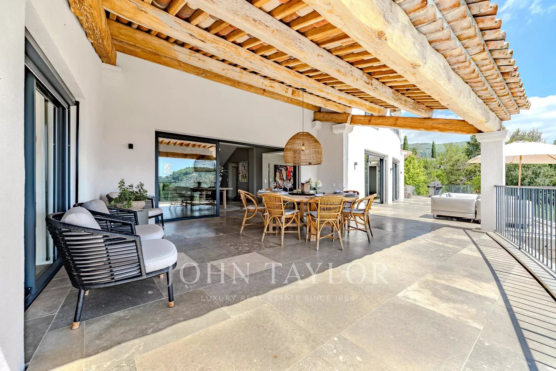 Рядом находится большая романтическая летняя гостиная с впечатляющими потолочными балками и большими раздвижными дверями, которые создают впечатление, что вы находитесь на свежем воздухе.
