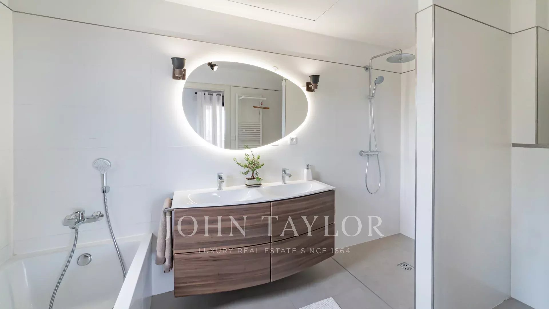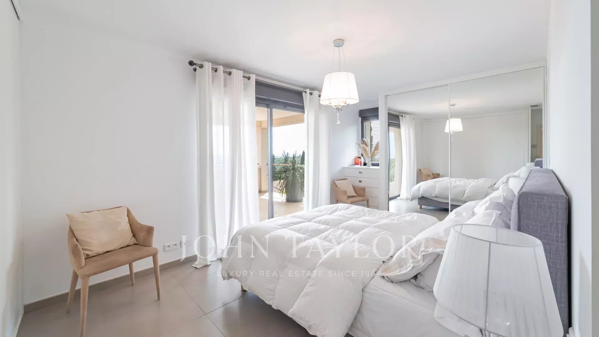 1 этаж: главная спальня, выходящая на крытую террасу с 2 гардеробными, 1 ванная комната с душевой кабиной, отдельный туалет - 1 кабинет, выходящий на террасу - 1 спальня с ванной комнатой, душем и туалетом FR.