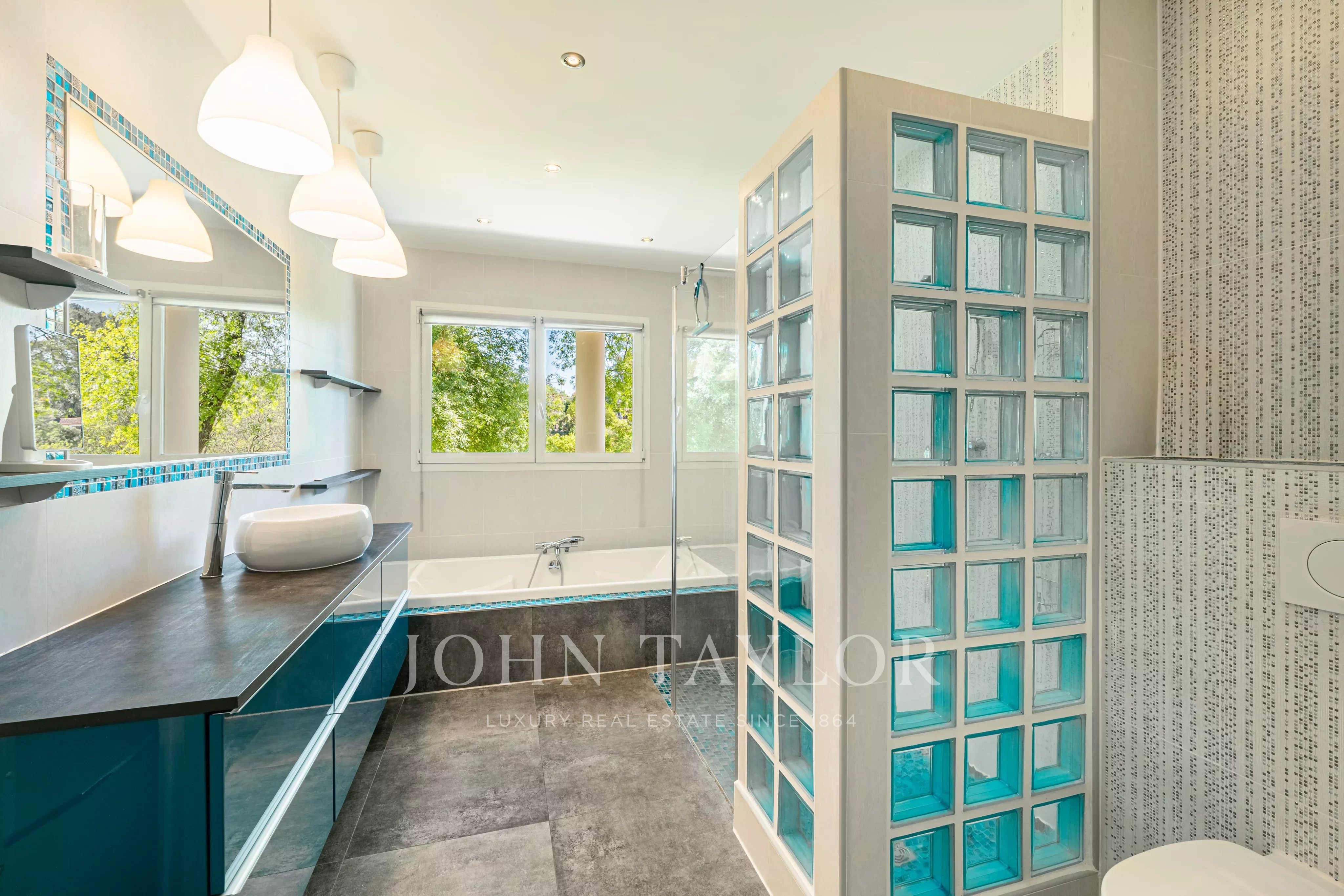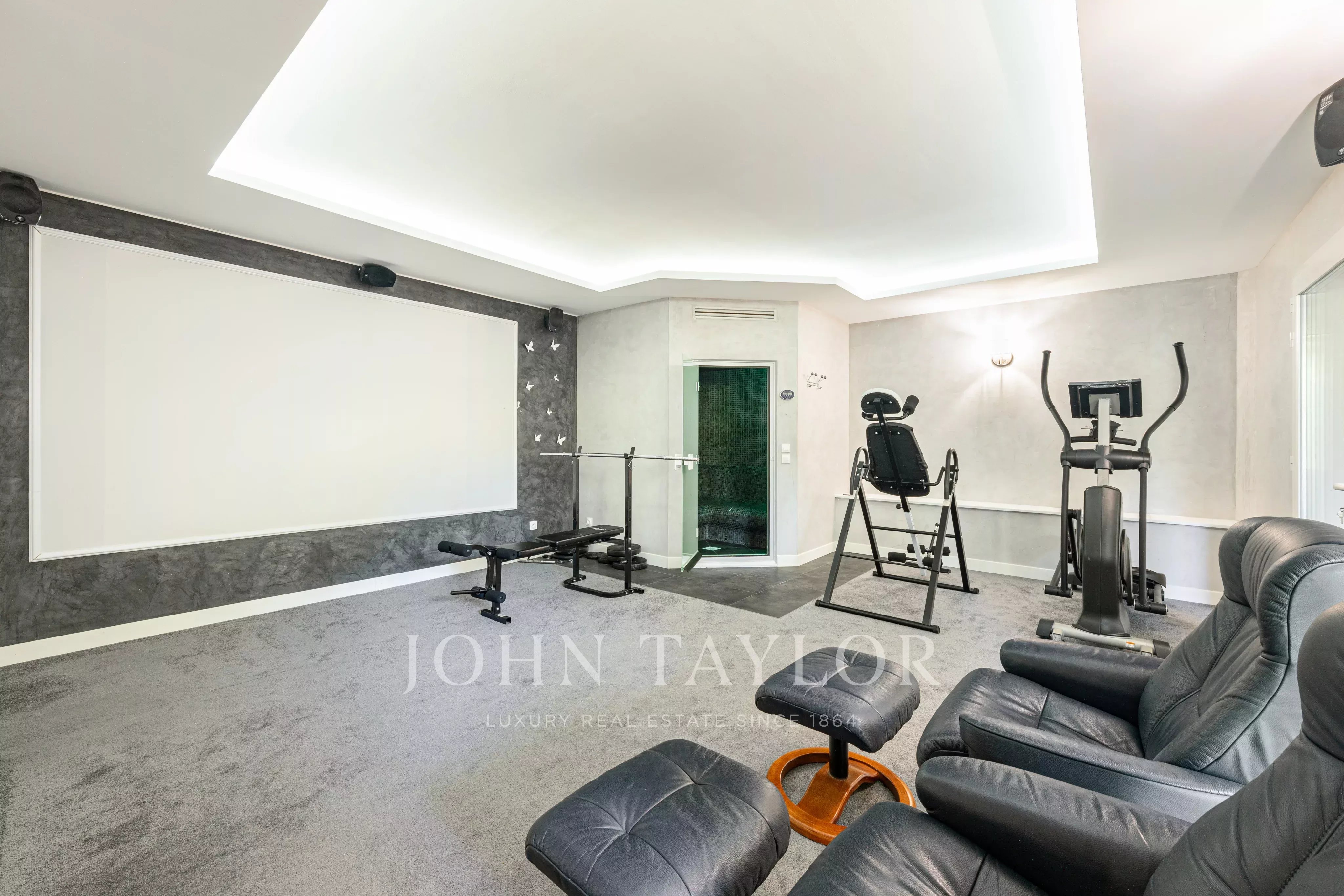 На цокольном этаже: большая мастер-спальня с ванной комнатой и гардеробной, третья спальня с душевой, спортзал и хамам.