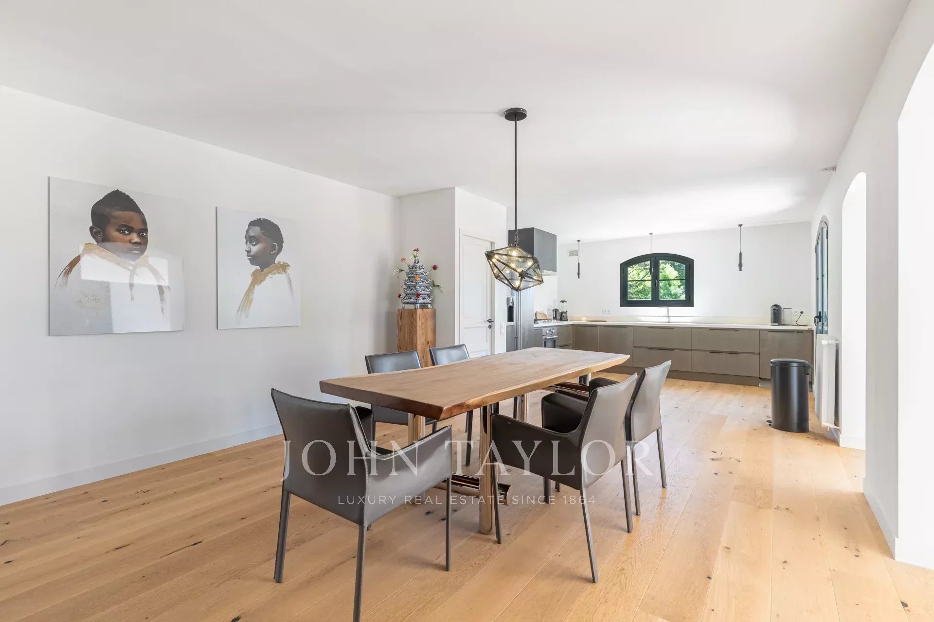 Прихожая ведет в современную, полностью оборудованную кухню открытой планировки, продолженную большой столовой.