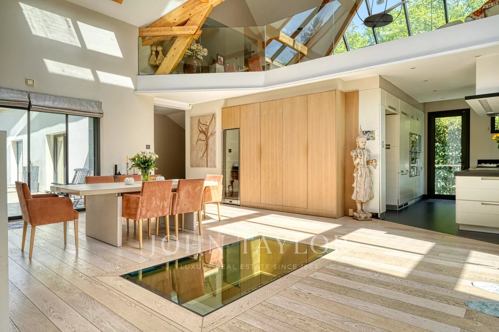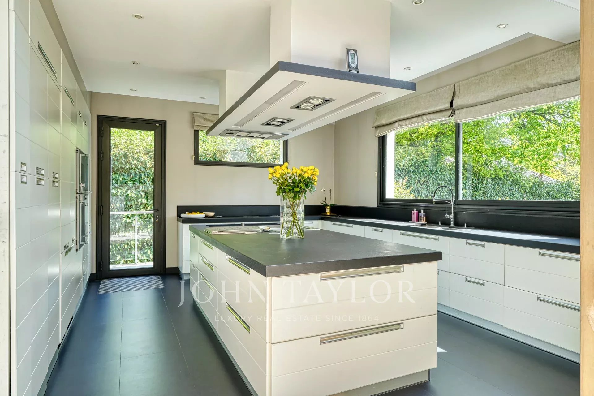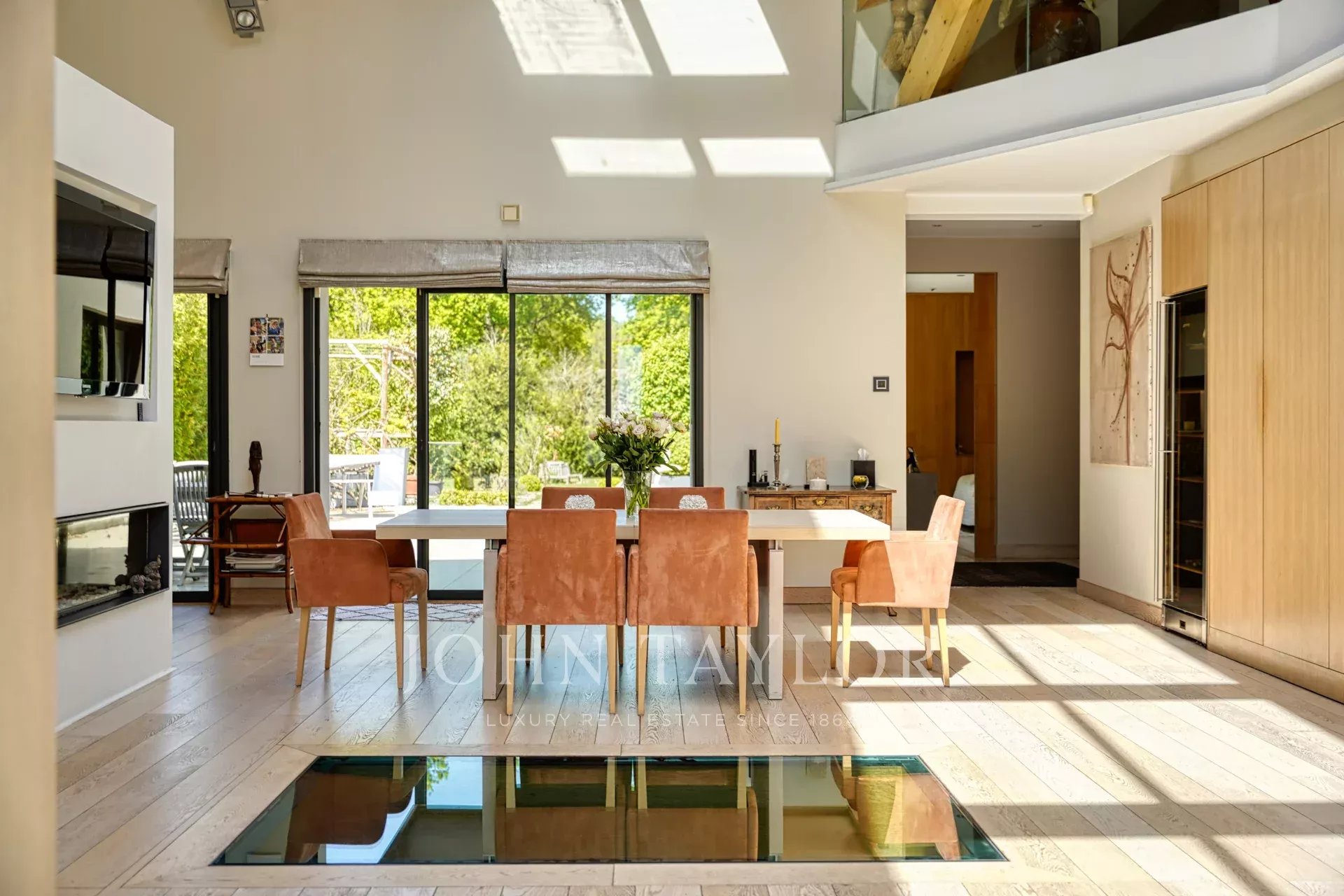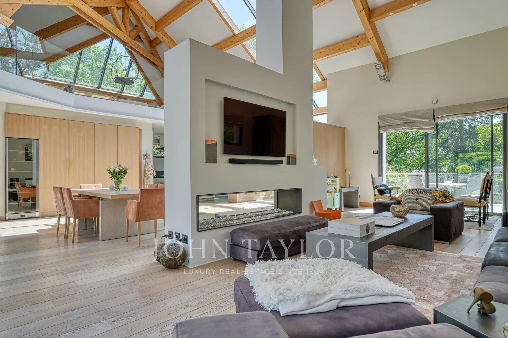 Эта элегантная современная вилла площадью 566 м² расположена в престижном и уединенном районе Ламорлее, Франция. Дом состоит из 7 просторных комнат, включая 4 светлые спальни, выполненные с использованием высококачественных материалов и современных технологий. Просторная гостиная с камином и панорамными окнами создает атмосферу уюта и открывает прекрасный вид на ухоженный сад.