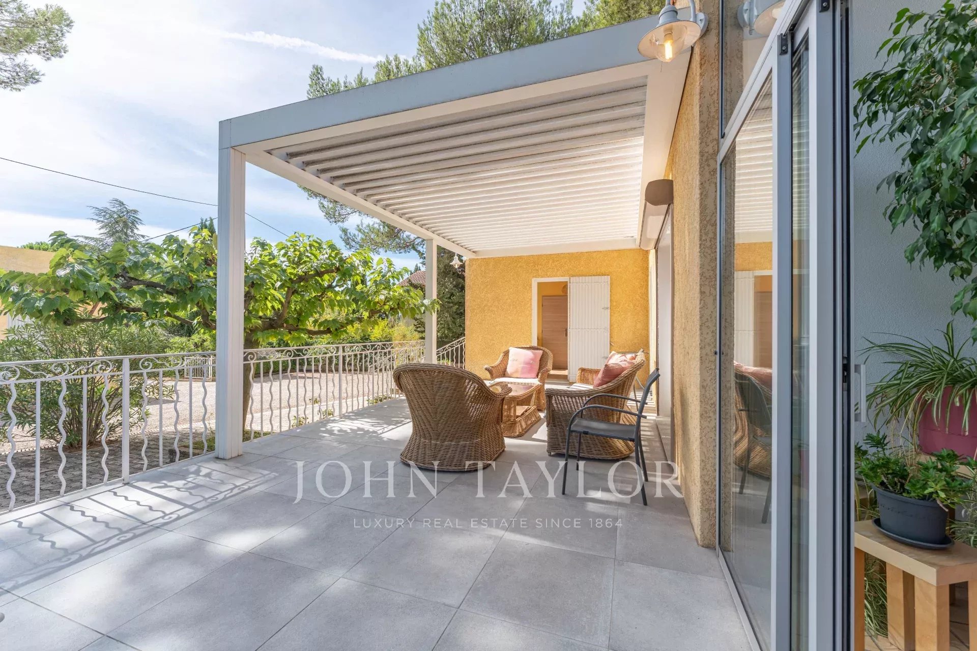 Он построен вокруг просторной гостиной площадью 55 м², выходящей на террасу с биоклиматической беседкой, продолженной верандой, которую можно использовать круглый год.