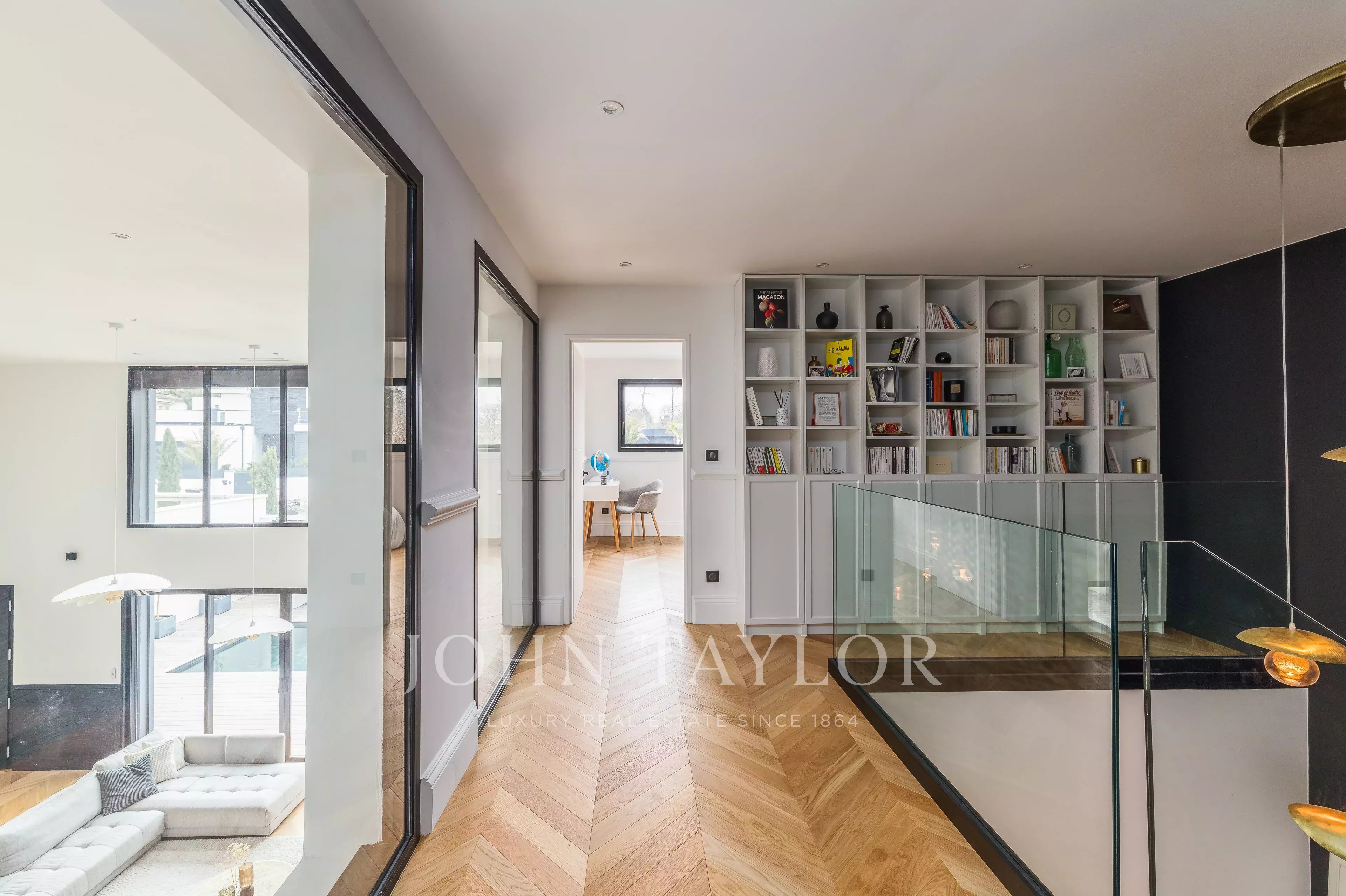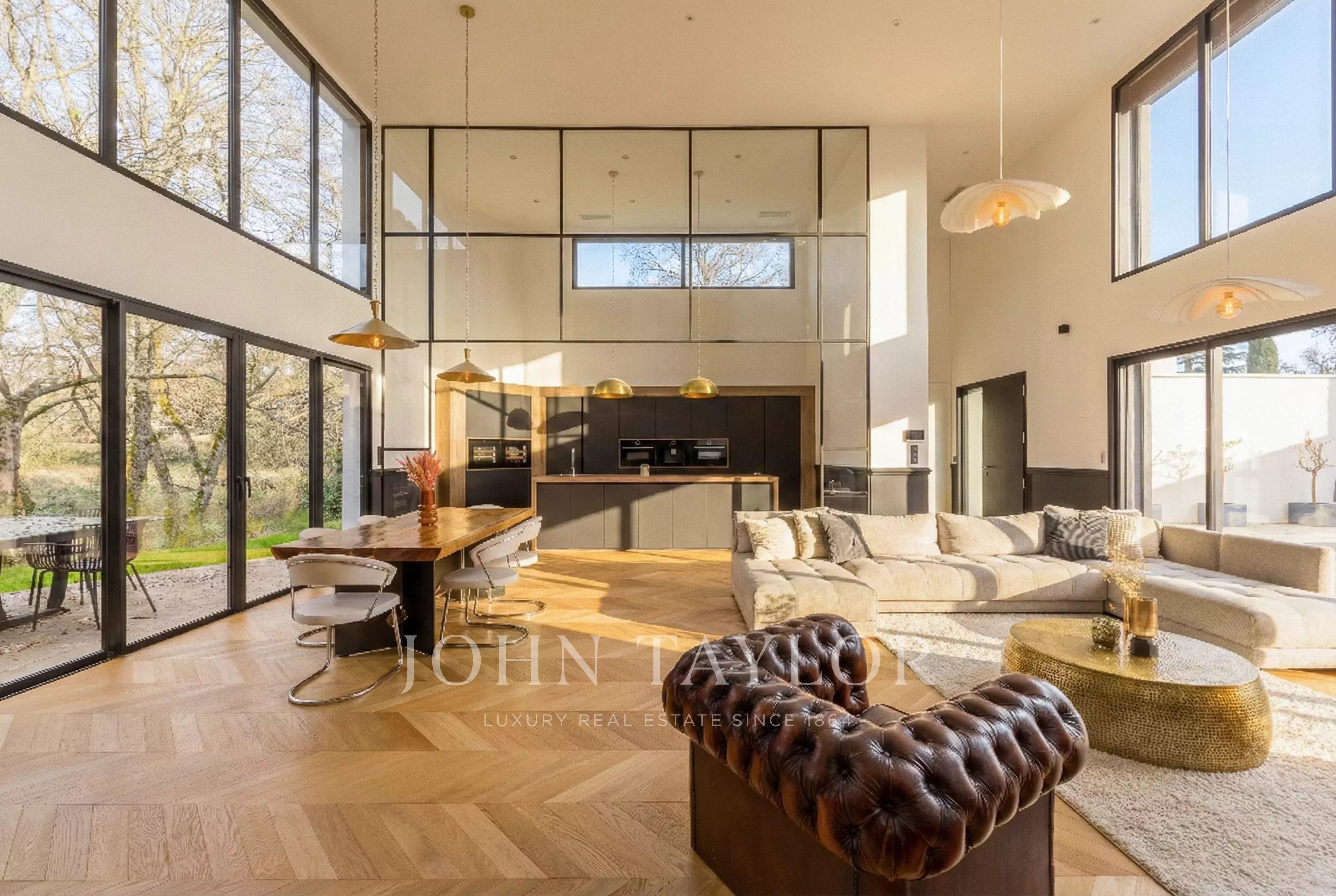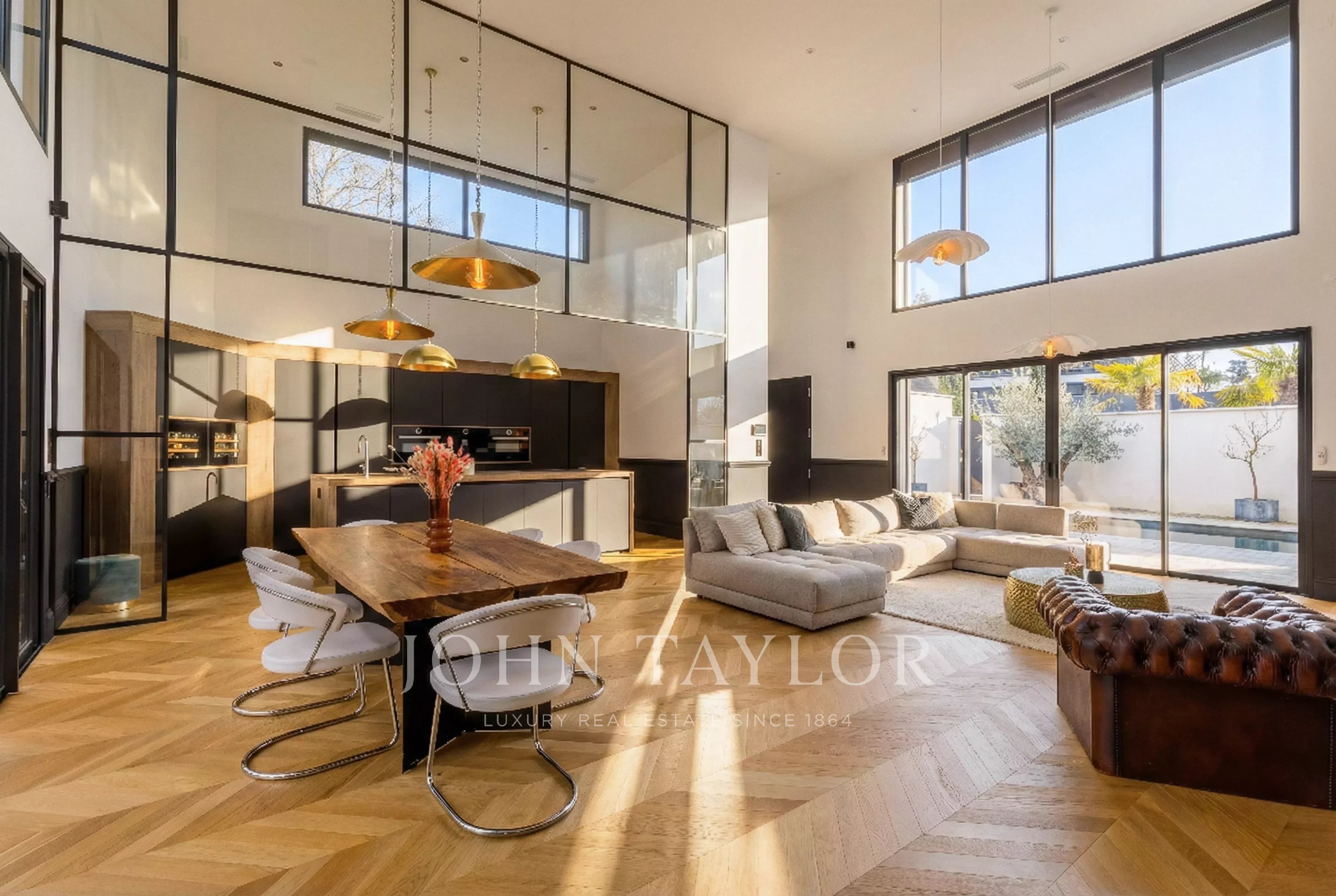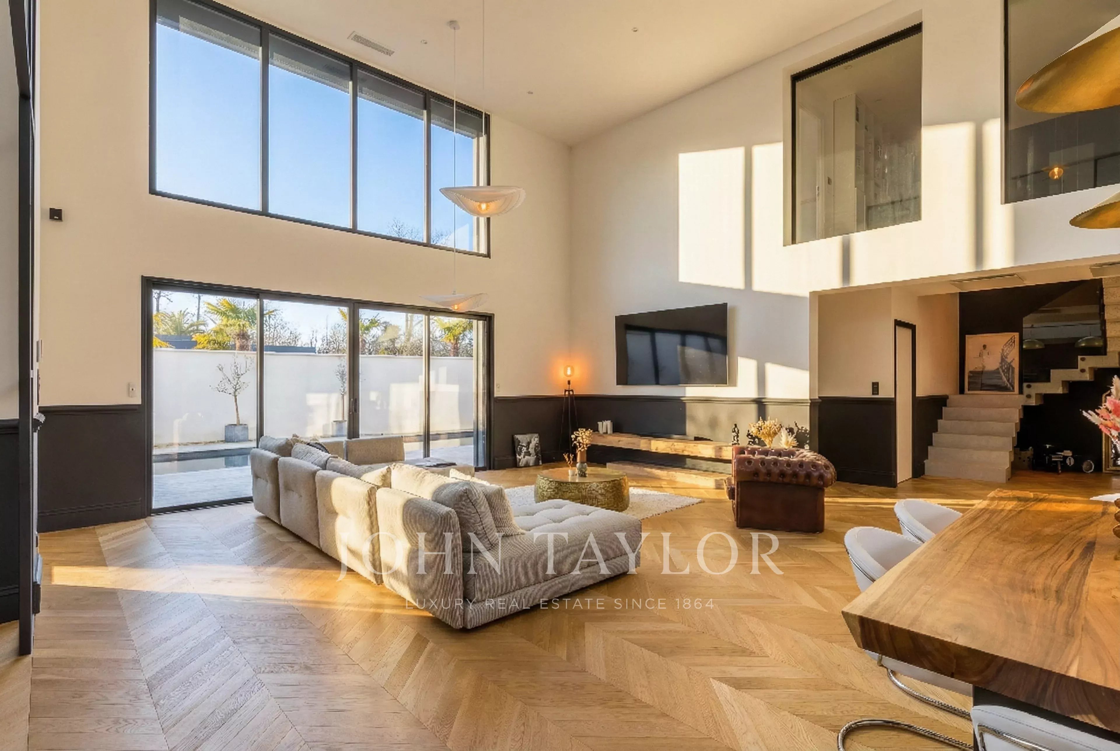 С момента входа в дом его объемы впечатляют. Гостиная, залитая естественным светом, может похвастаться высотой потолков более 5 м и теплой, гостеприимной атмосферой.