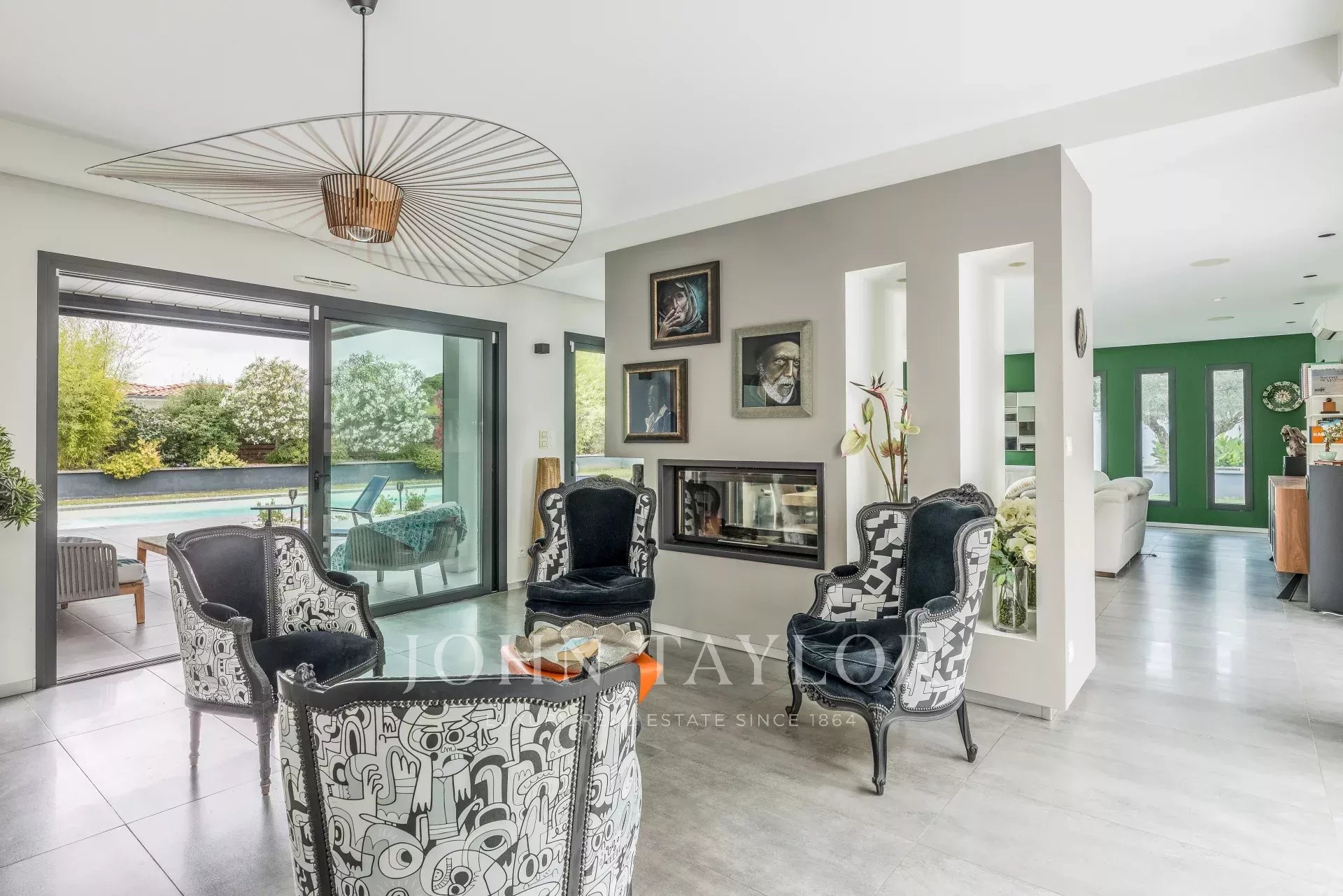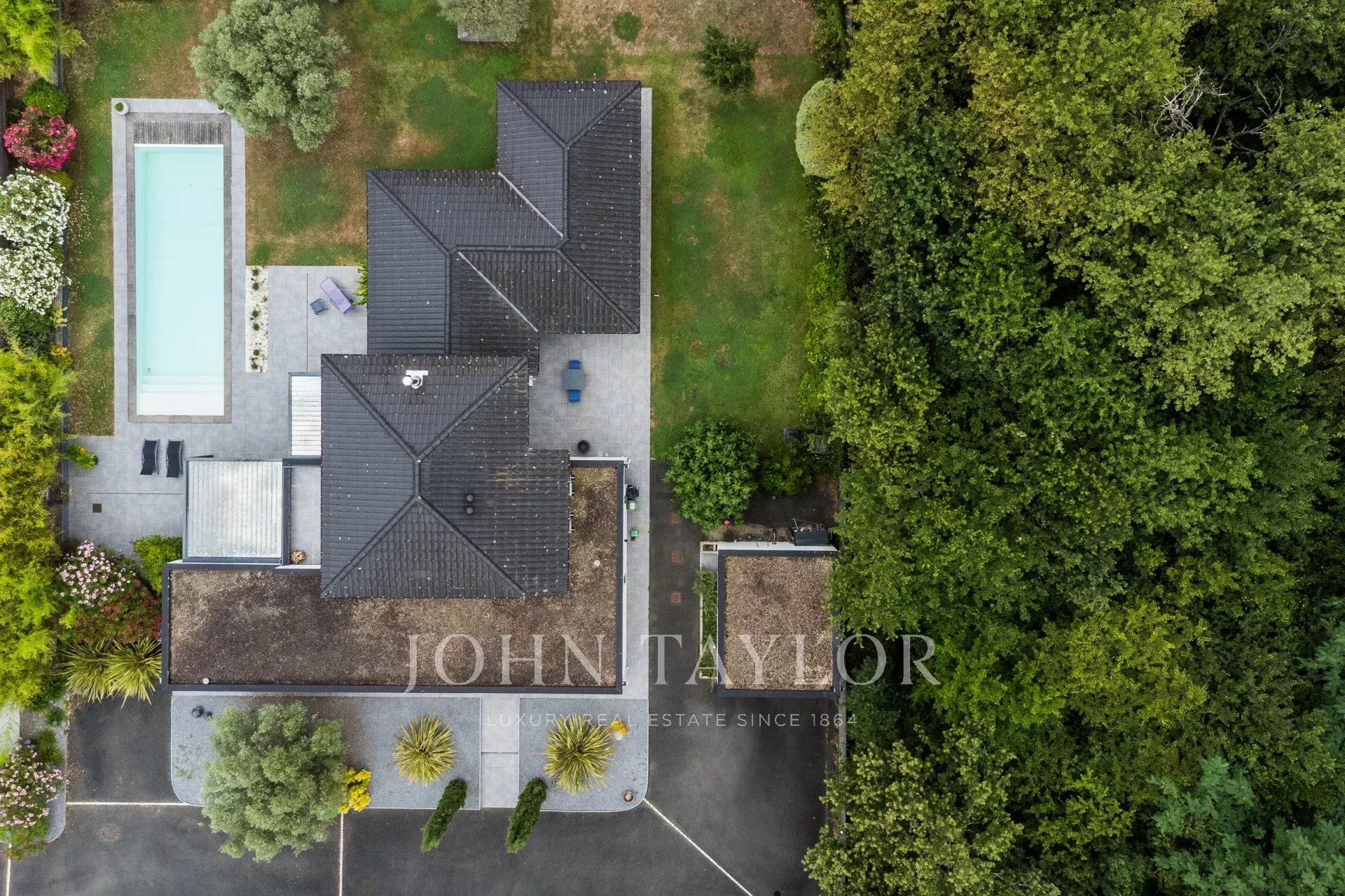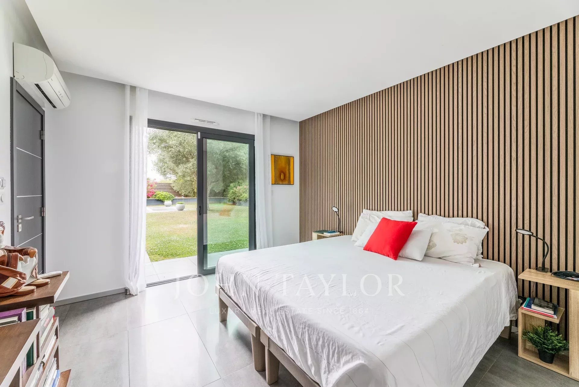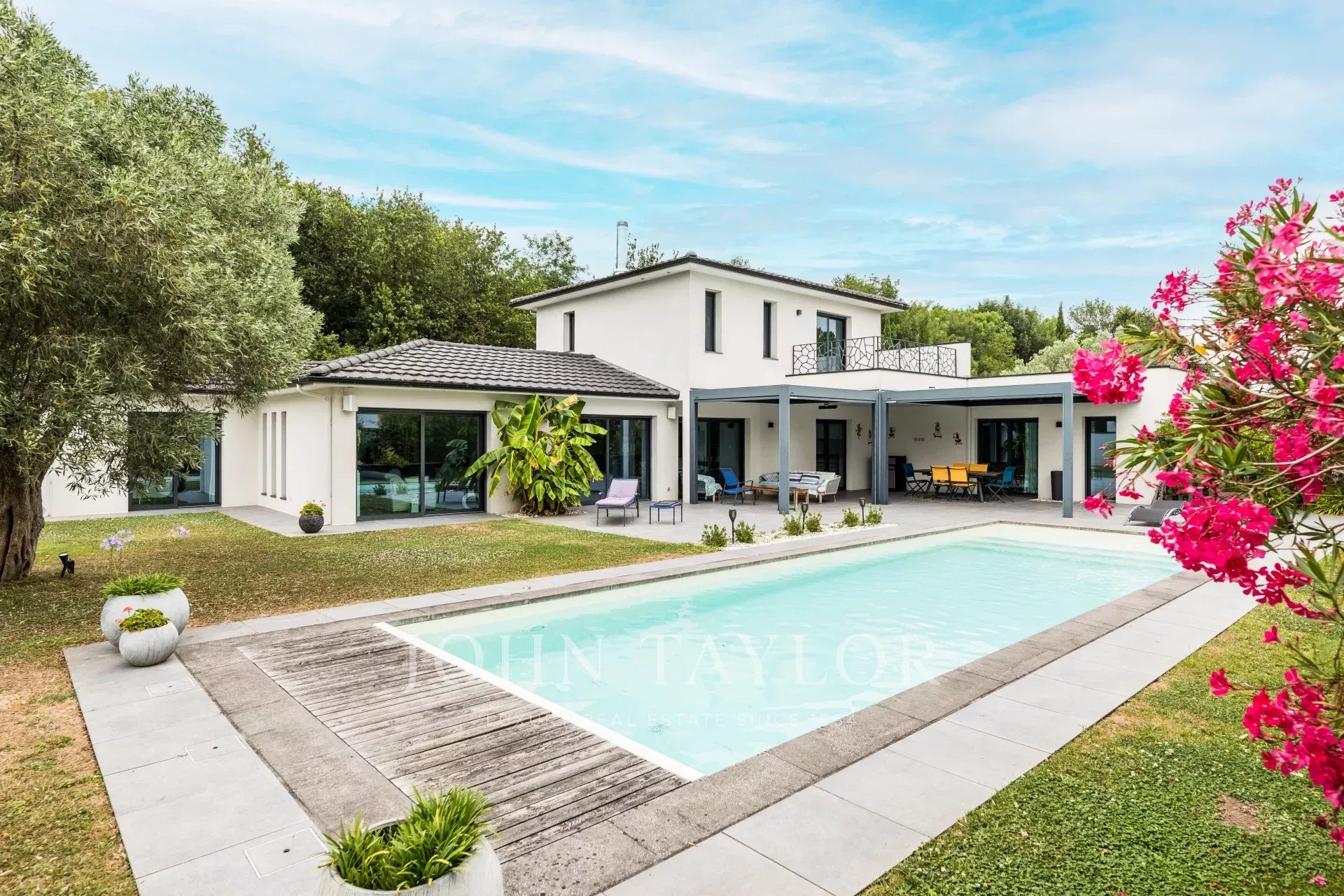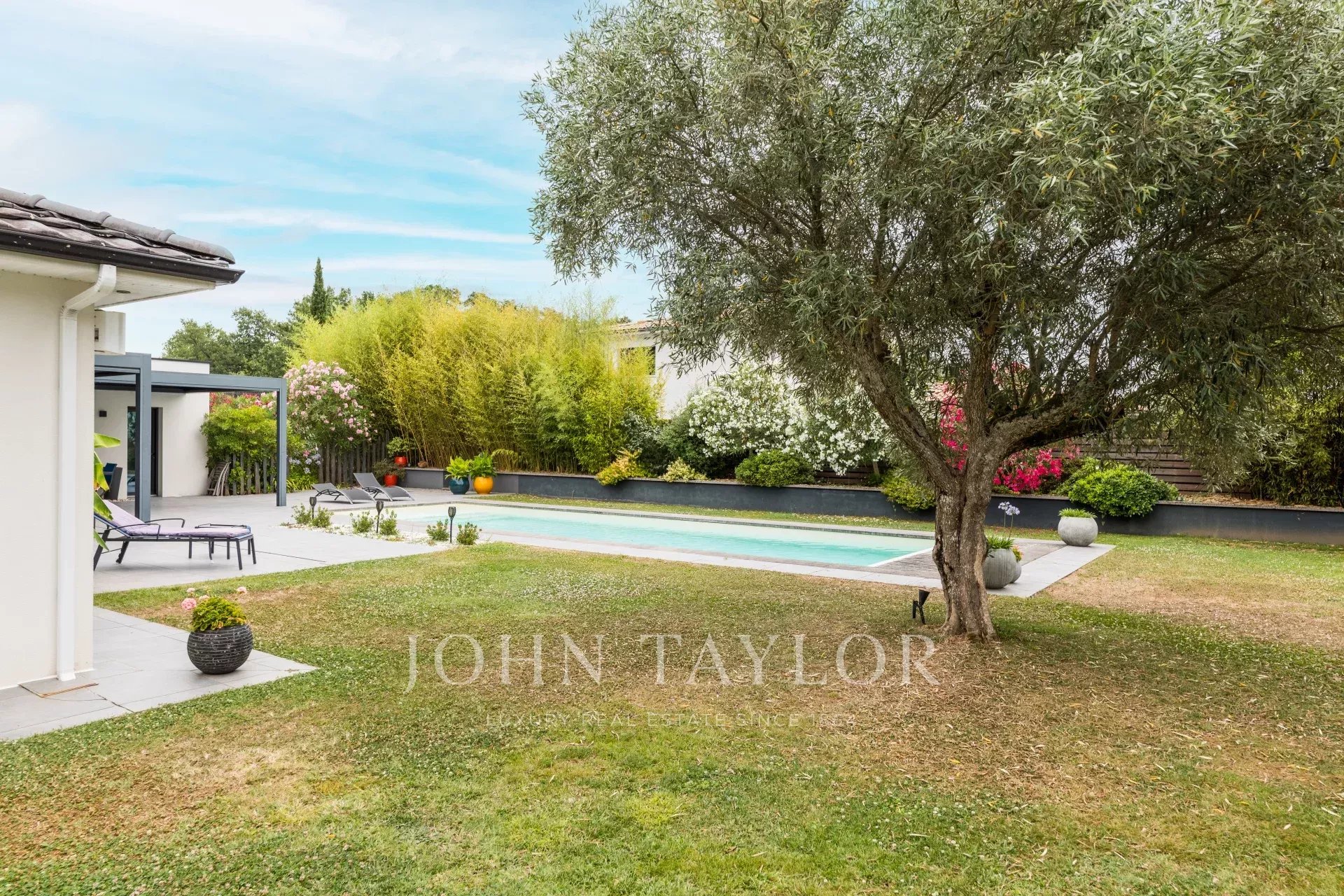 Укрытая от посторонних глаз в конце частной подъездной дороги, она расположена на великолепном ландшафтном участке площадью более 2 000 м², обращенном на юг, и дополнена бассейном 13 x 4 метра с подогревом соленой воды и погружным электрическим занавесом.