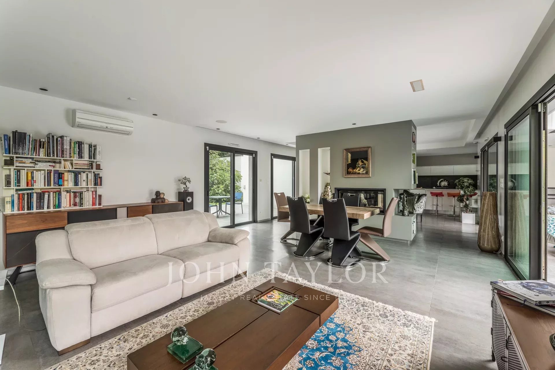 Большая часть виллы построена на одном уровне, а ее просторные, наполненные светом комнаты и абсолютно современный стиль привлекают внимание с первого взгляда. Гостиная площадью 90 м², залитая светом благодаря большим картинным окнам, выходит на несколько террас и оснащена элегантным камином с двойной горелкой. Полностью оборудованная кухня открытой планировки дополняет жилое пространство.