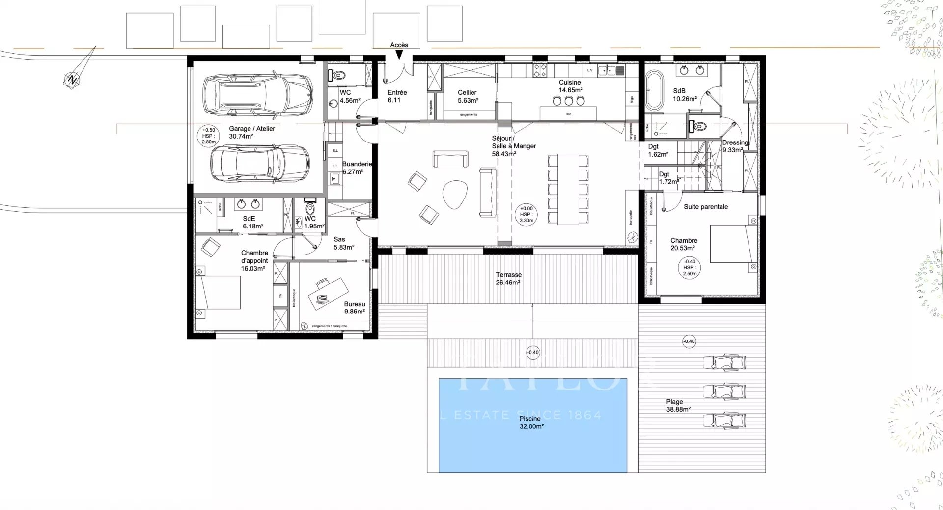 Этот дом, спроектированный для гармоничной семейной жизни, отличается просторными помещениями и оптимальной ориентацией. Просторная гостиная площадью 60 м² с потолками высотой 3,30 м выходит на террасу, откуда открывается вид на город, идеальный для развлечений или отдыха в полном уединении. Отсюда можно выйти к бассейну, чтобы максимально использовать окружающую природу.