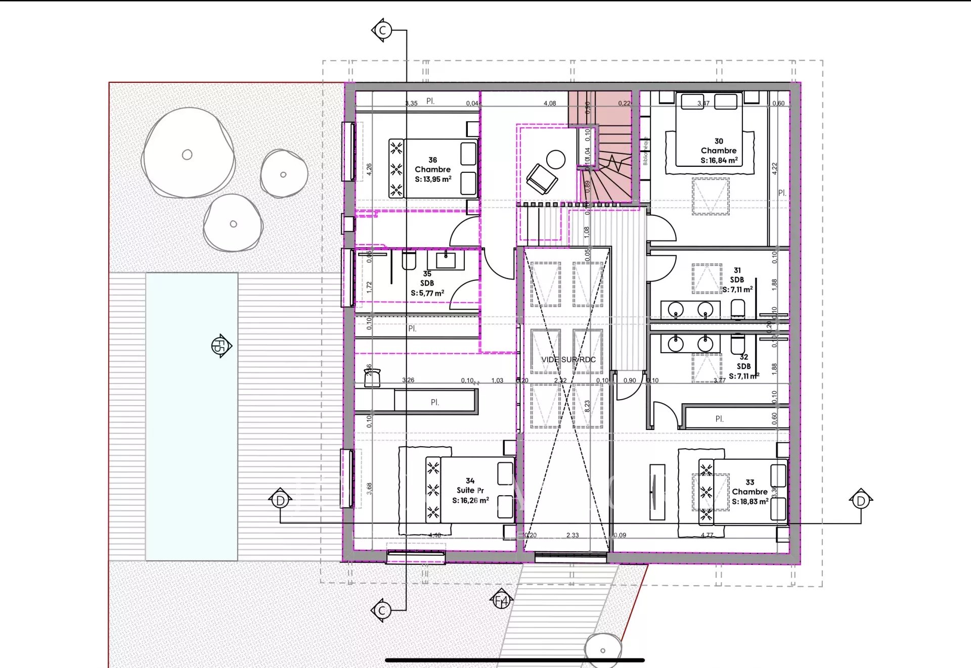 Этот дом площадью 245 м², расположенный во втором ряду тихой жилой улицы рядом с парком Борделе, имеет разрешение на реконструкцию и современный архитектурный проект, готовый к завершению.