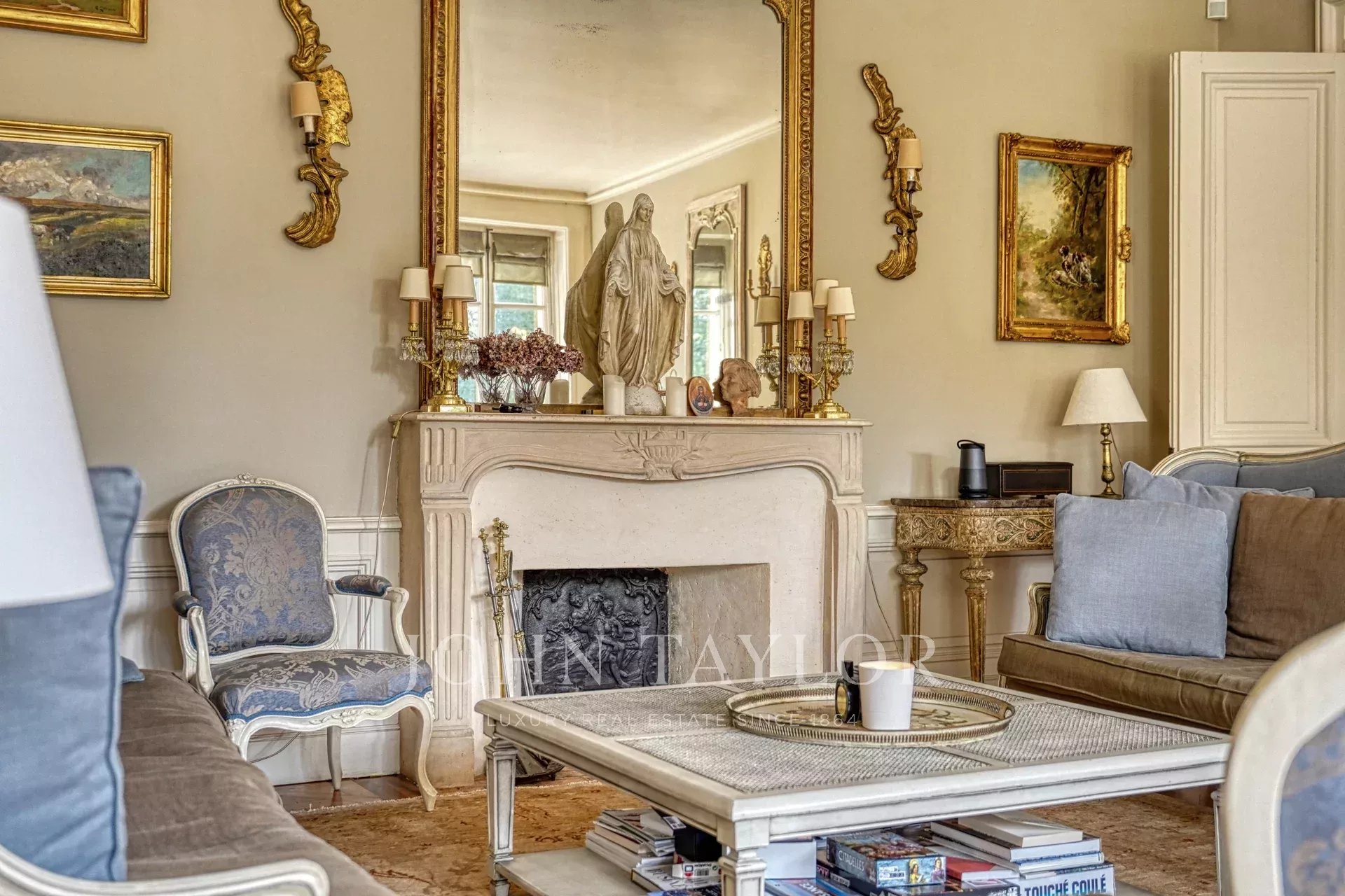 На первом этаже находится прихожая с тамбуром, красивые гостиные, включая гостиную с камином, выходящую в сад, столовую и отдельную кухню.