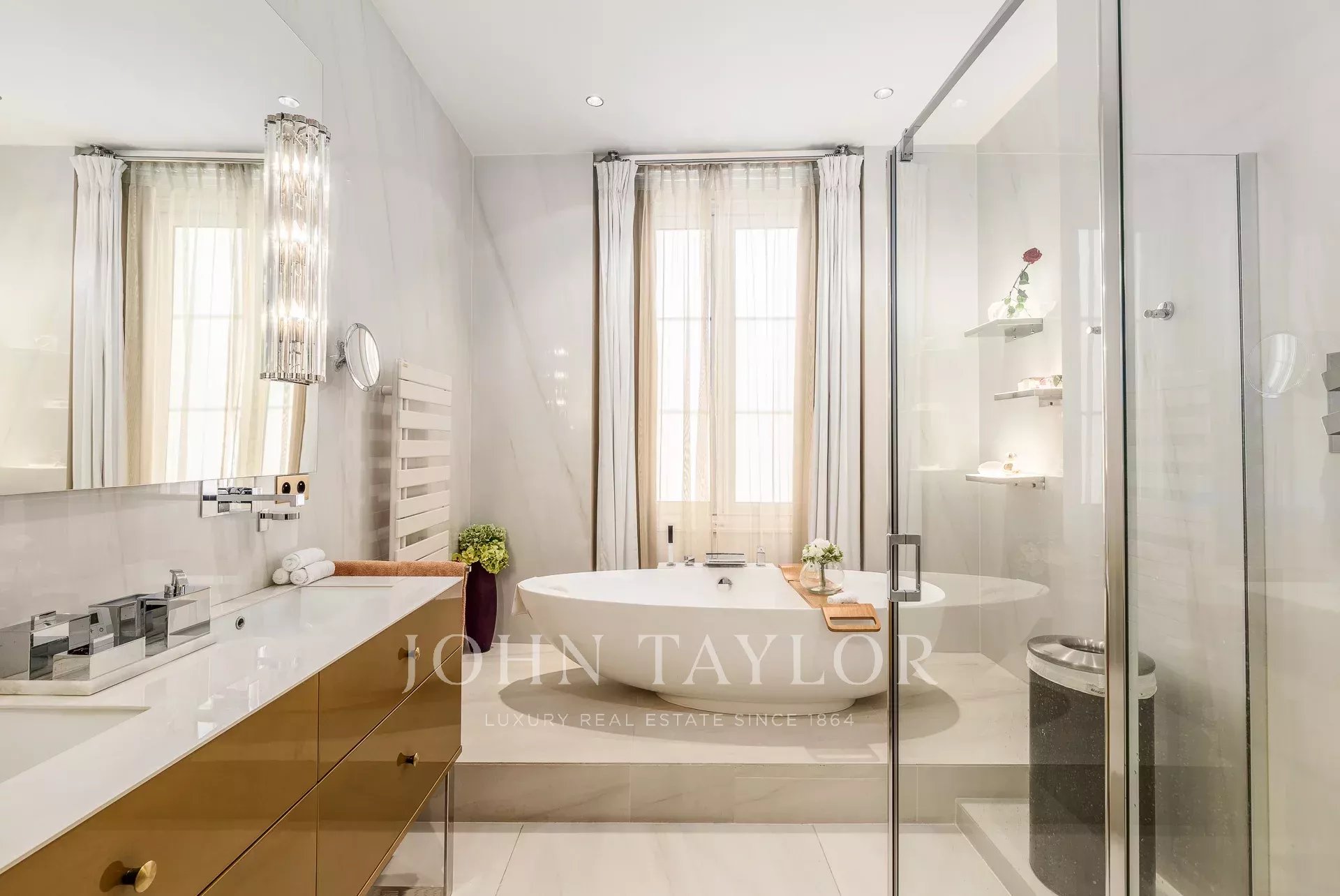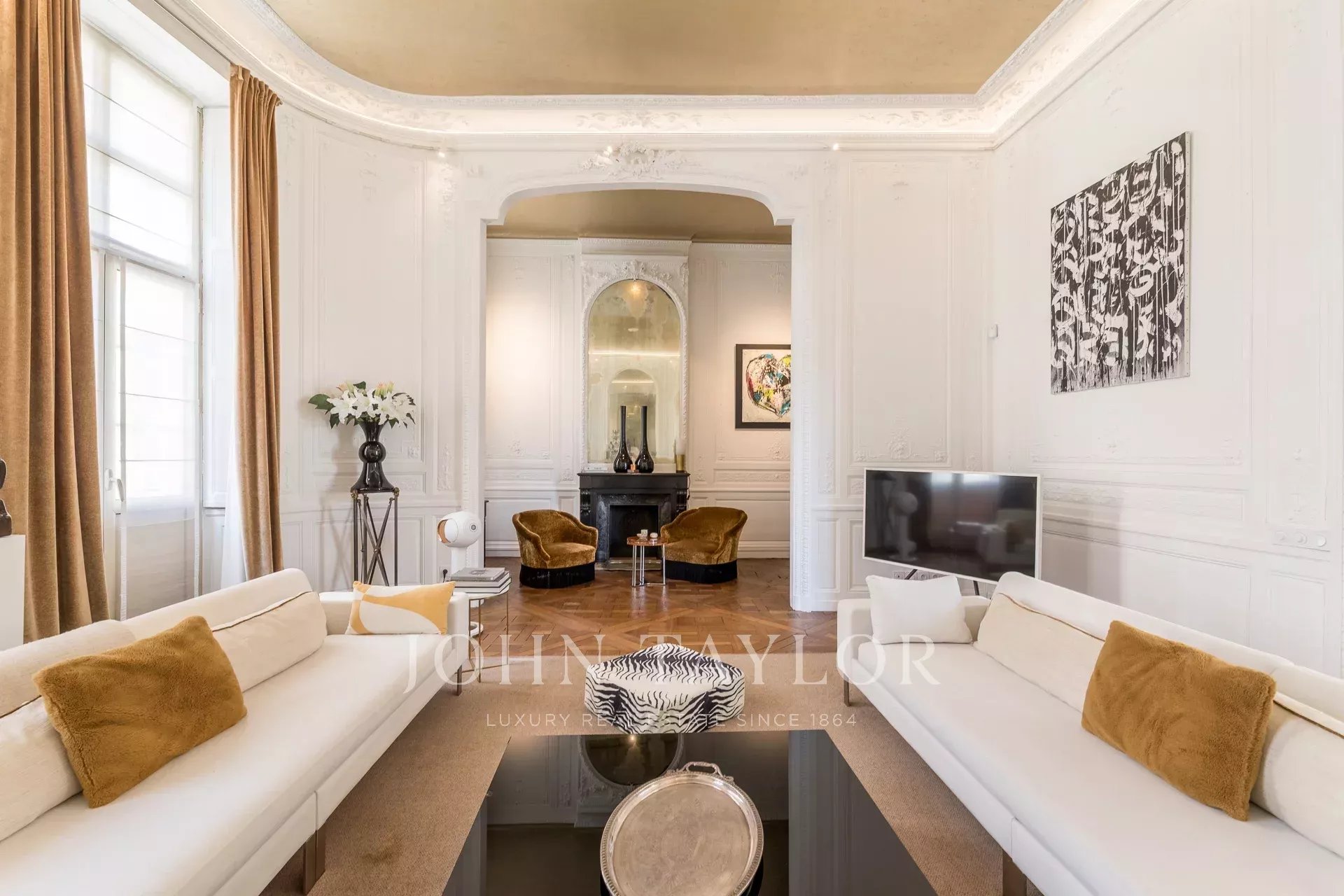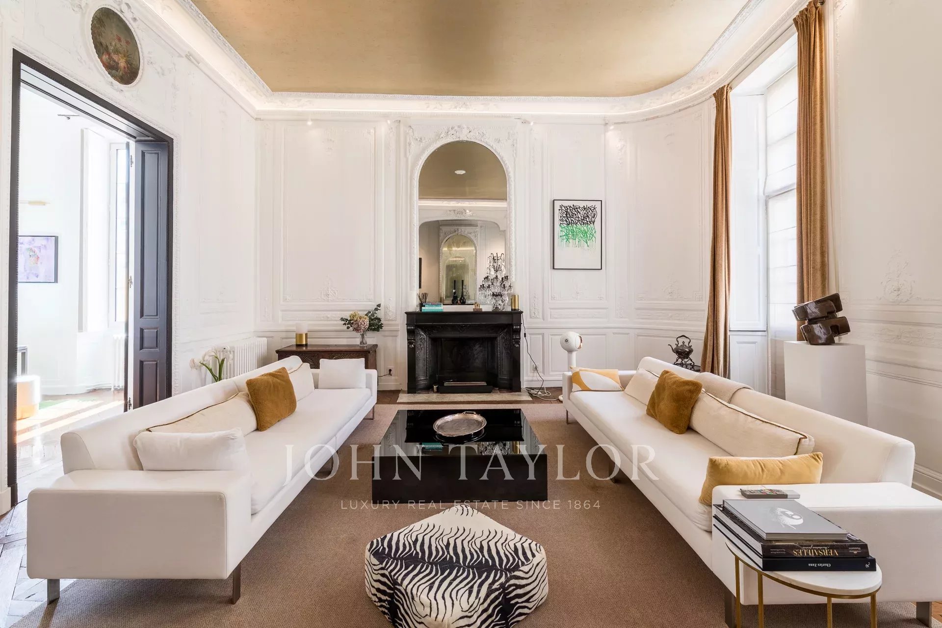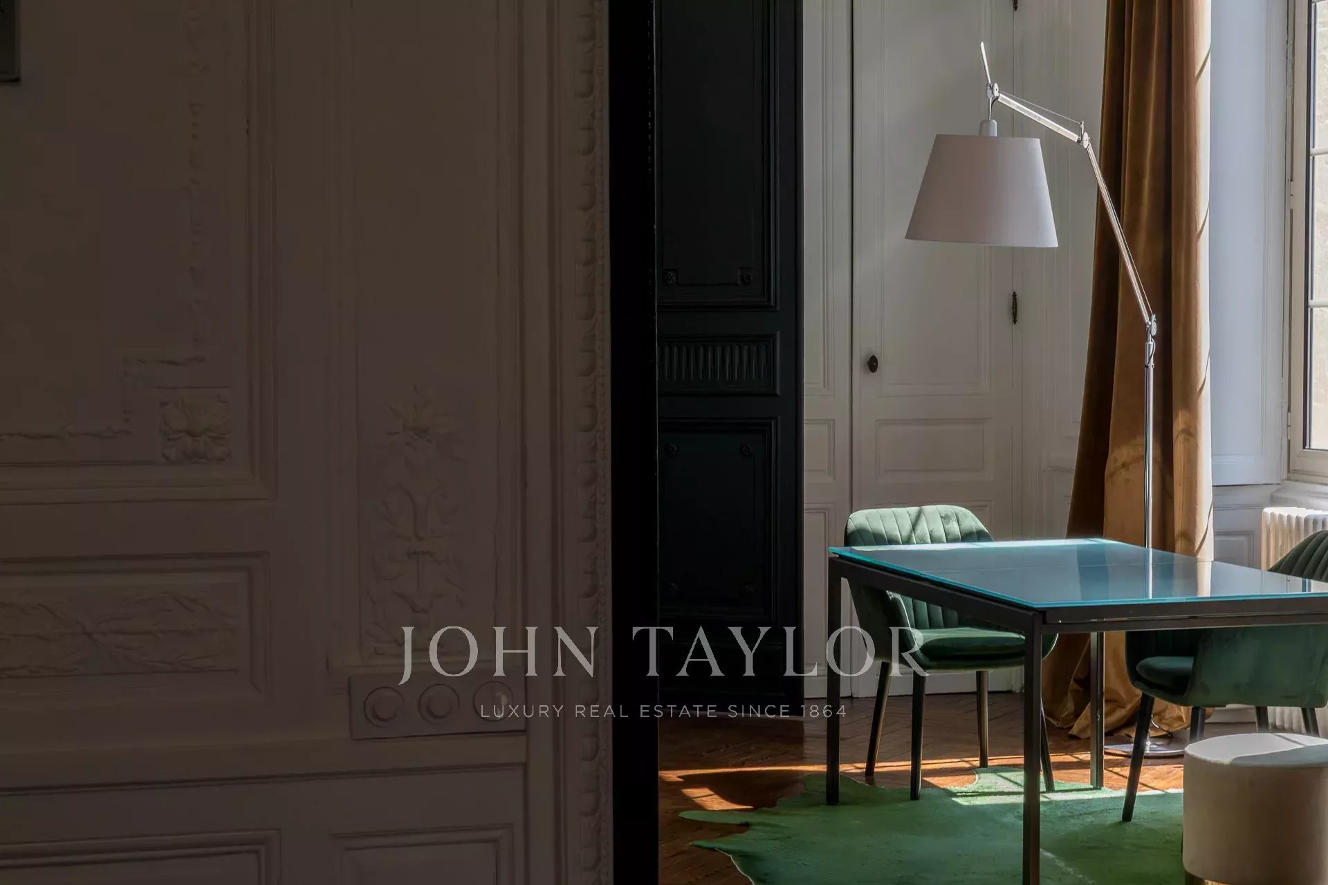 На втором этаже находятся великолепные приемные, украшенные изысканными деревянными панелями, старинным паркетом и удивительно высокими потолками. Элегантная прихожая ведет в двойную гостиную, столовую, выходящую на залитую солнцем террасу, и отдельную кухню.
