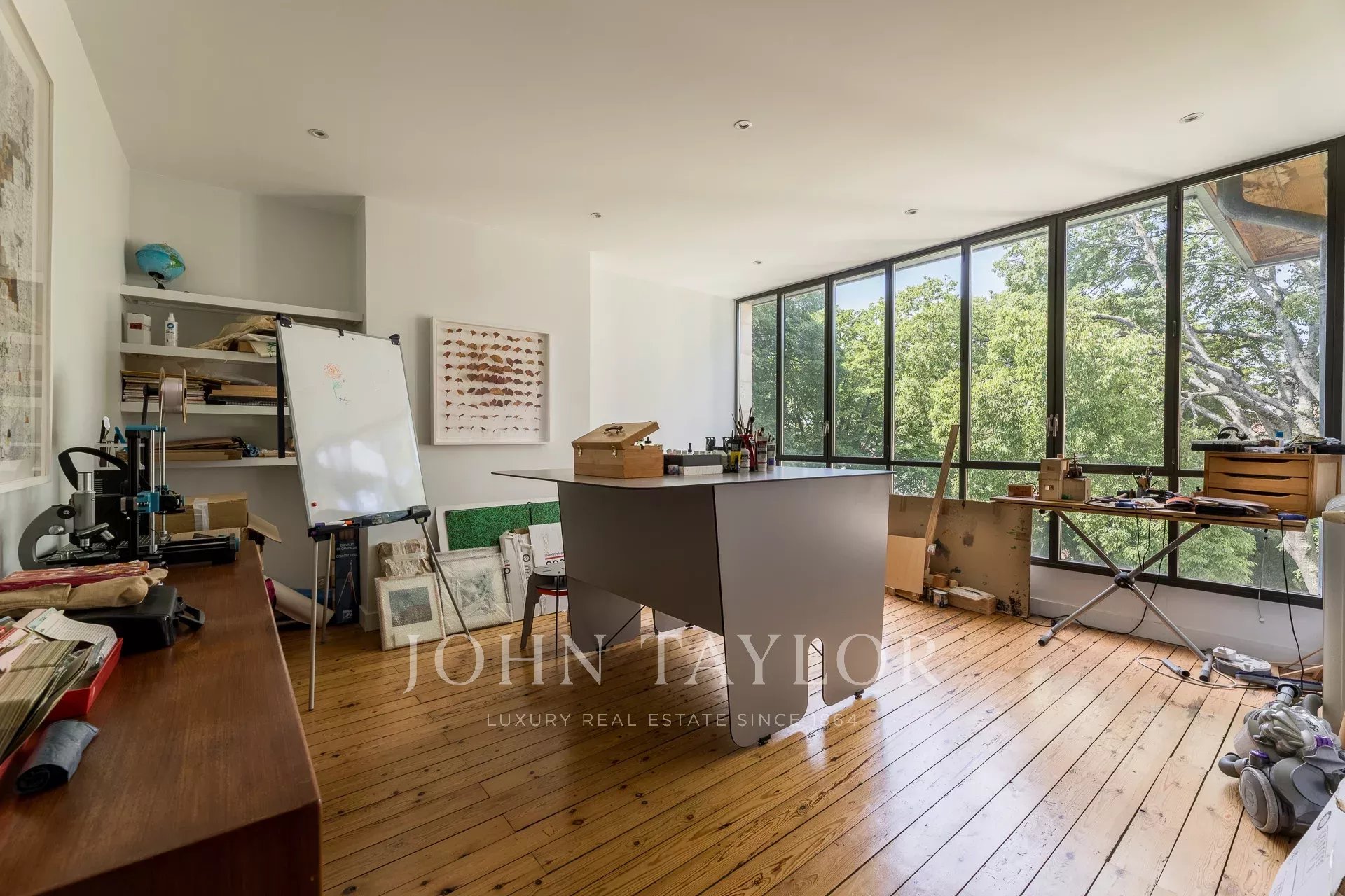 На втором этаже расположены три дополнительные спальни и мастерская, залитая светом благодаря стеклянной крыше с видом на сад.