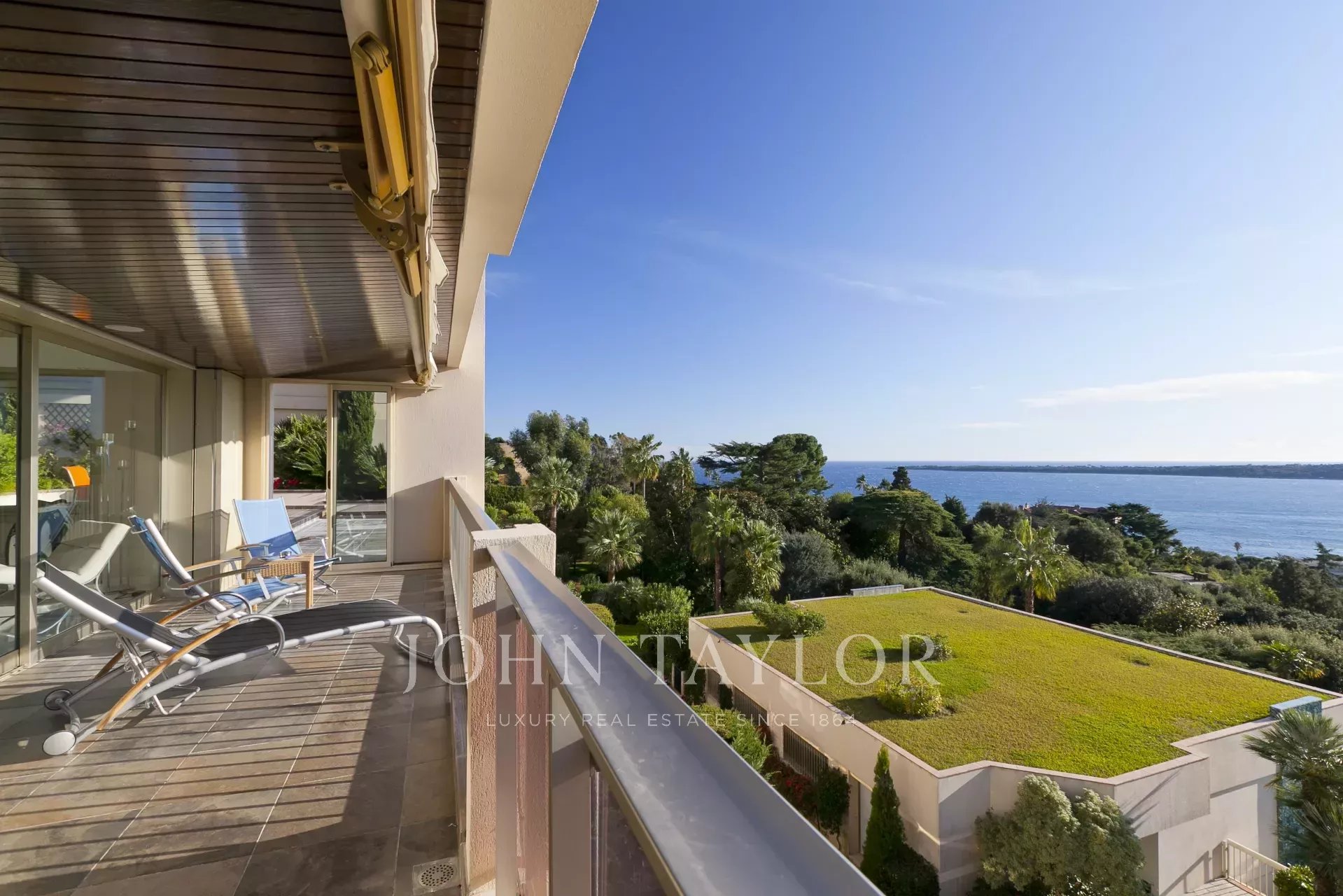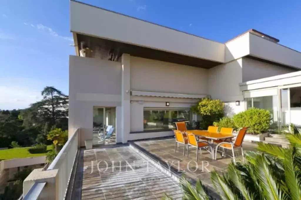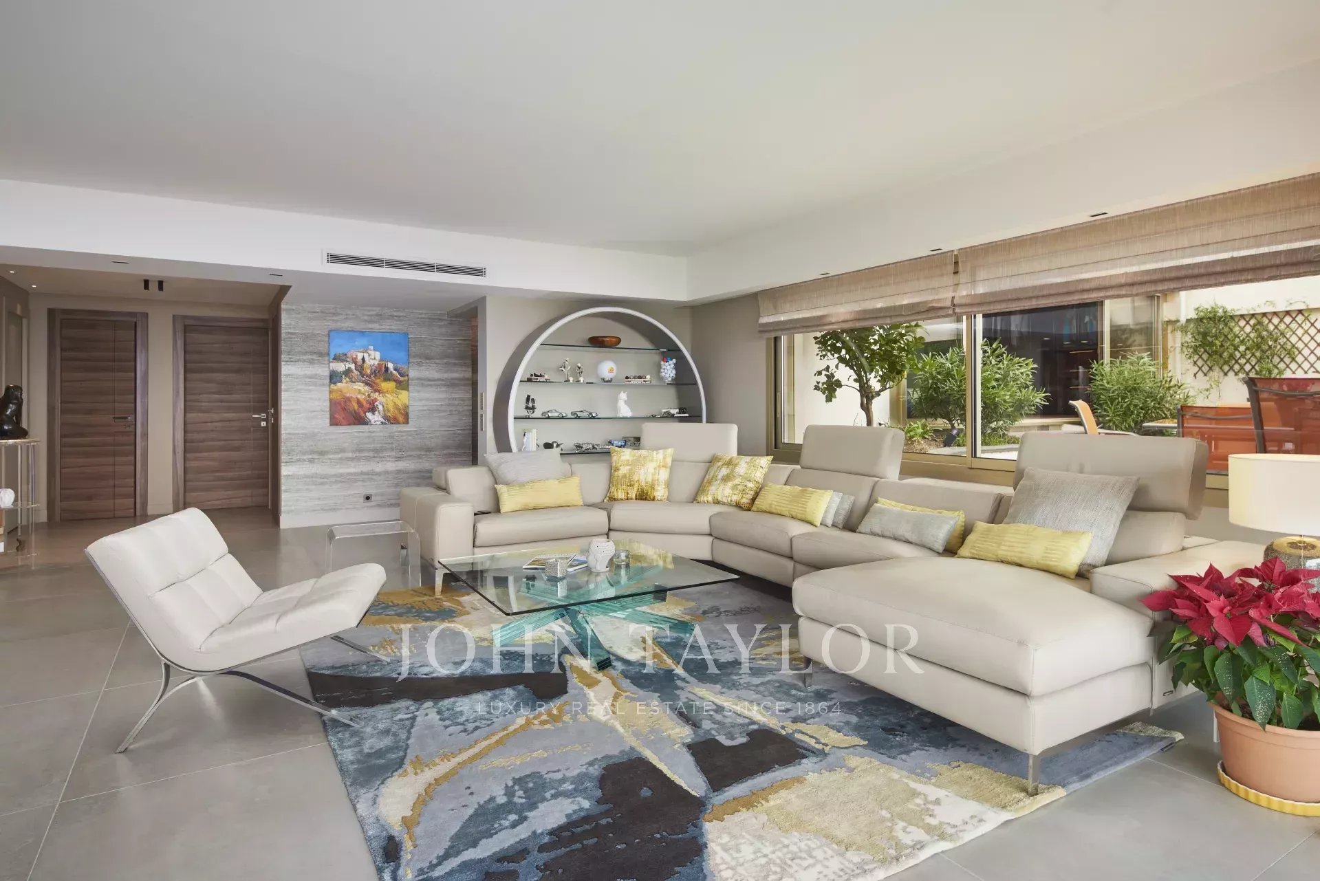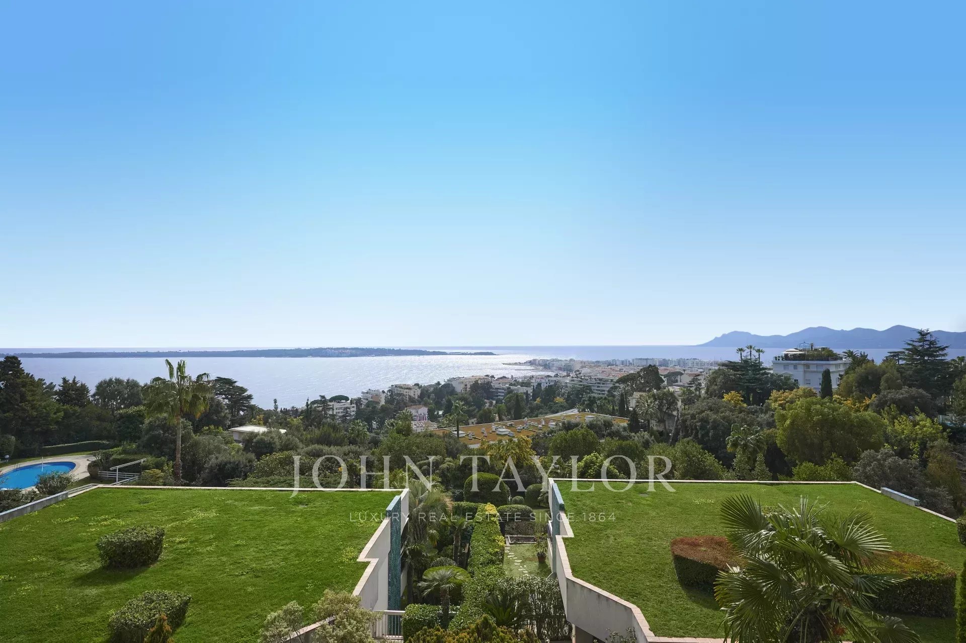 Эта красивая квартира площадью 180 м2 с кондиционером и террасой площадью 80 м2 с великолепным видом на море, Леринские острова и Каннский залив расположена в роскошной резиденции на возвышенности Канн, в районе Basse Californie.