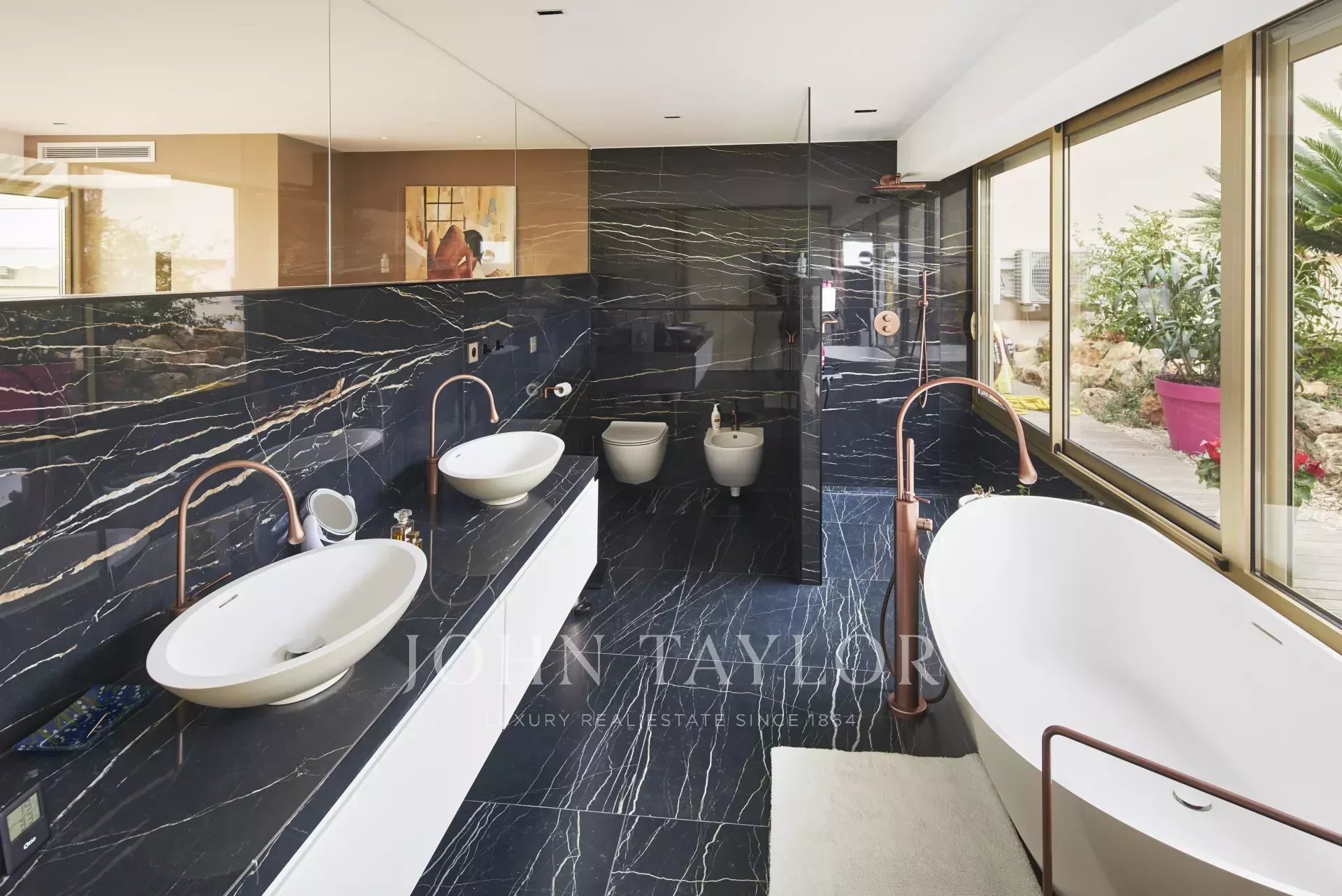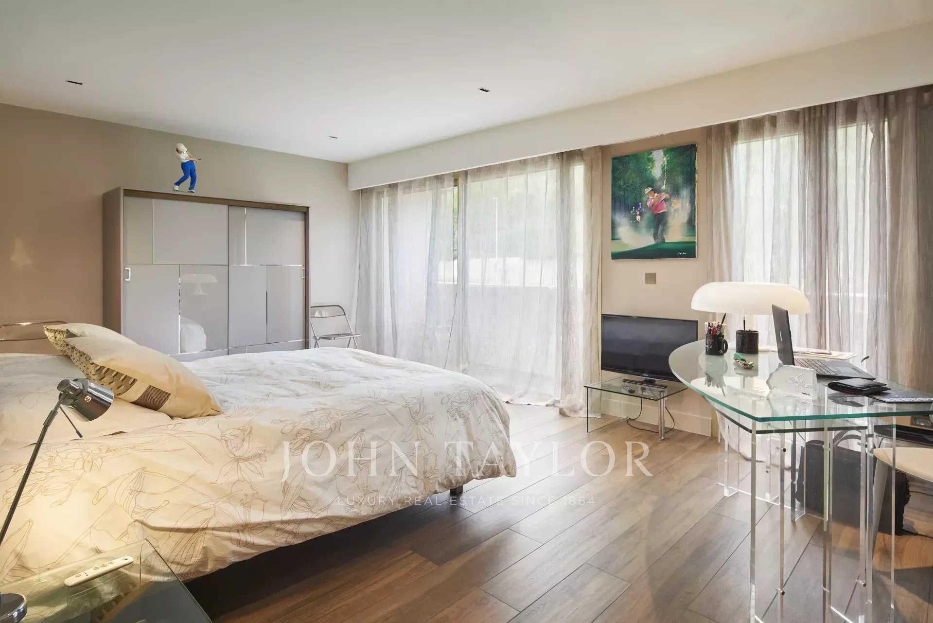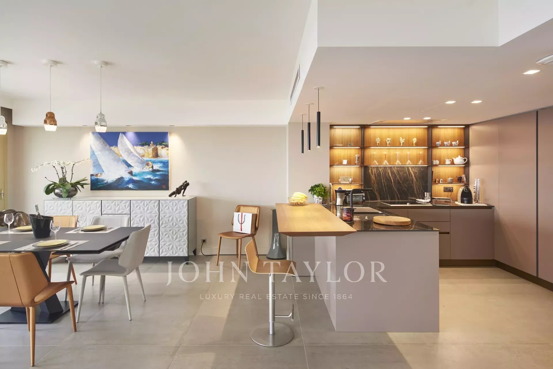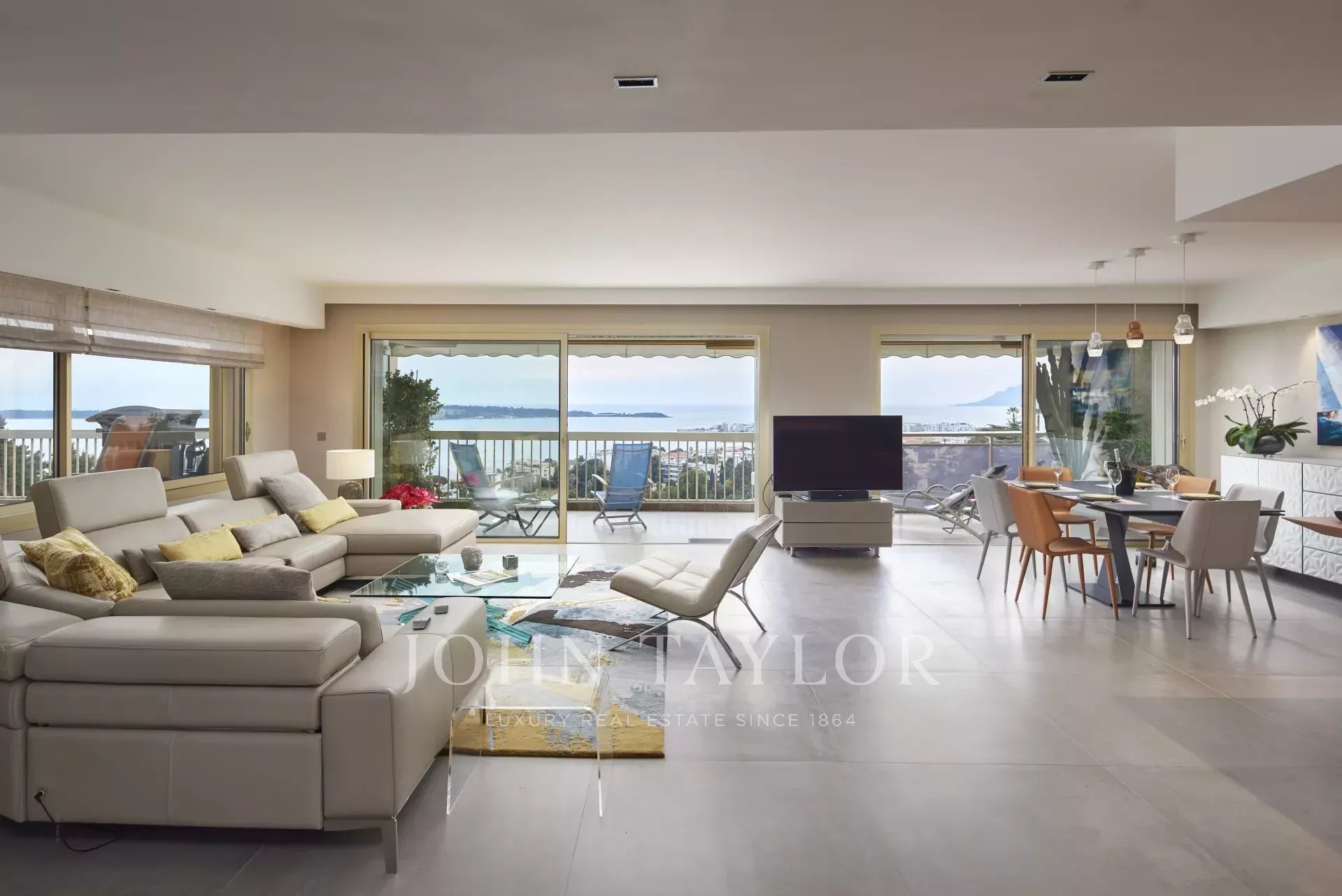 Эта красивая квартира площадью 180 м2 с кондиционером и террасой площадью 80 м2 с великолепным видом на море, Леринские острова и Каннский залив расположена в роскошной резиденции на возвышенности Канн, в районе Basse Californie.