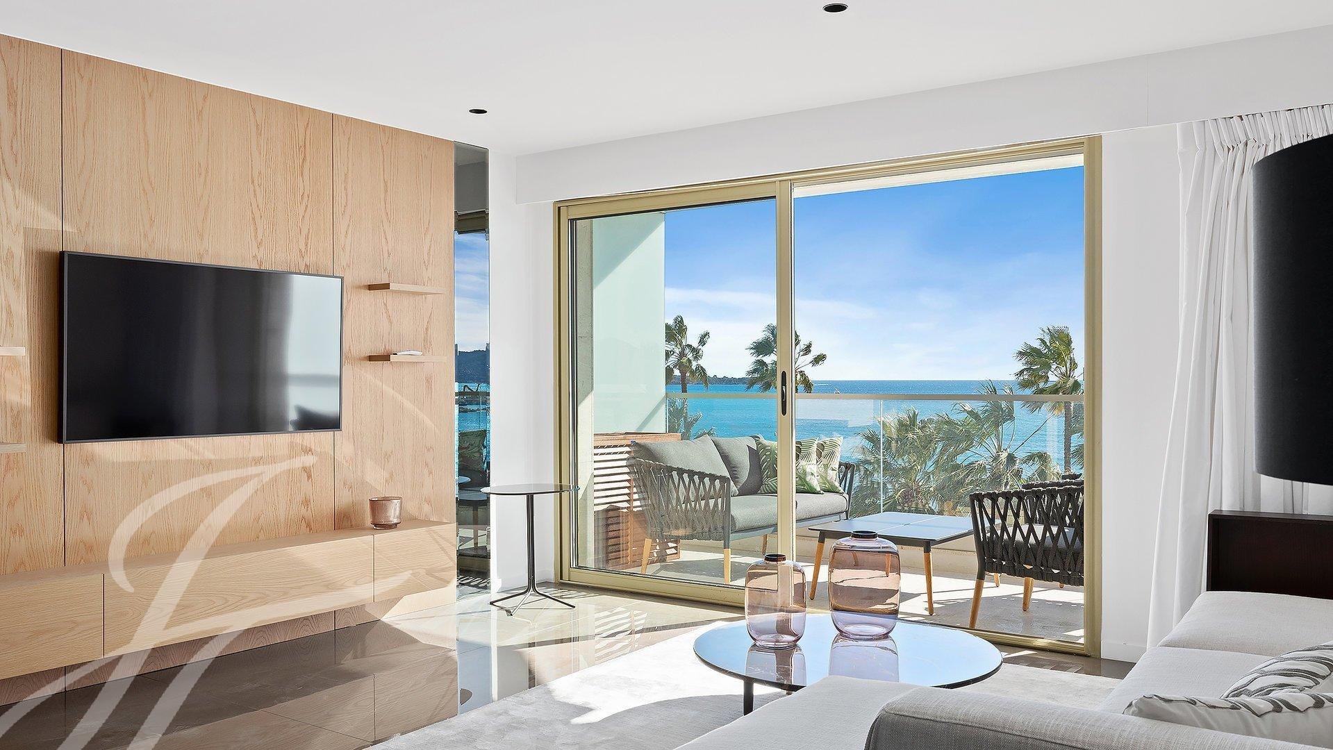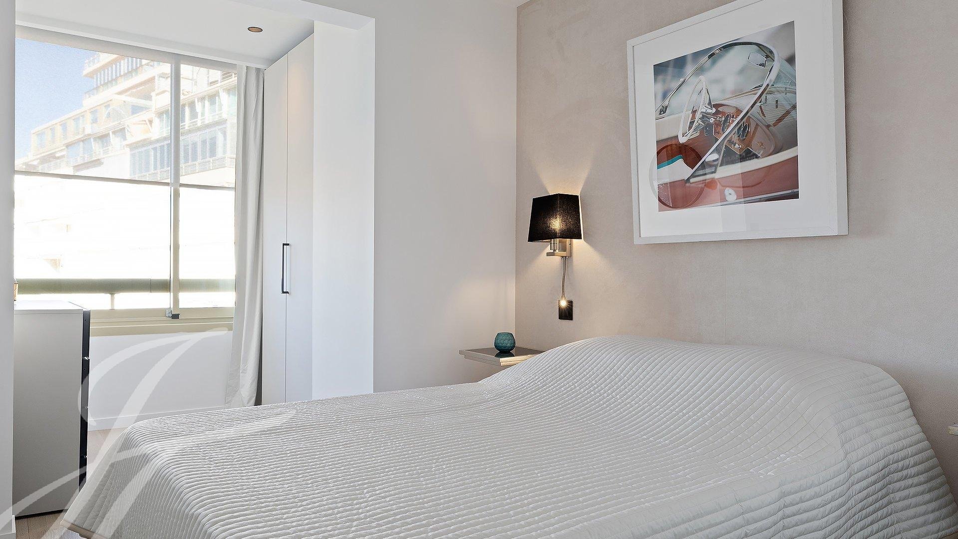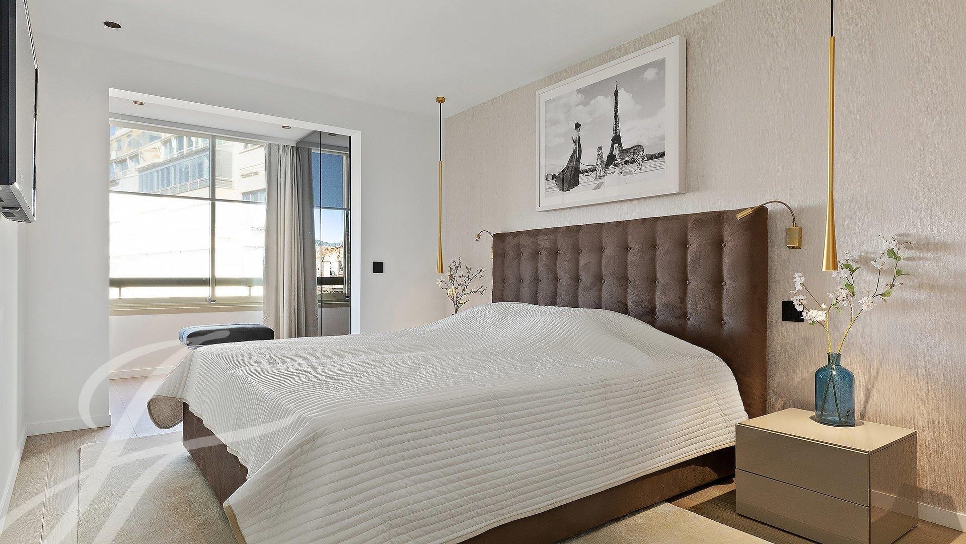 Красивая квартира с кондиционером, расположенная в самом сердце набережной Круазетт на 5-м этаже роскошной резиденции, с великолепным панорамным видом на Каннский залив, его пляжи, Дворец фестивалей и Эстерель.