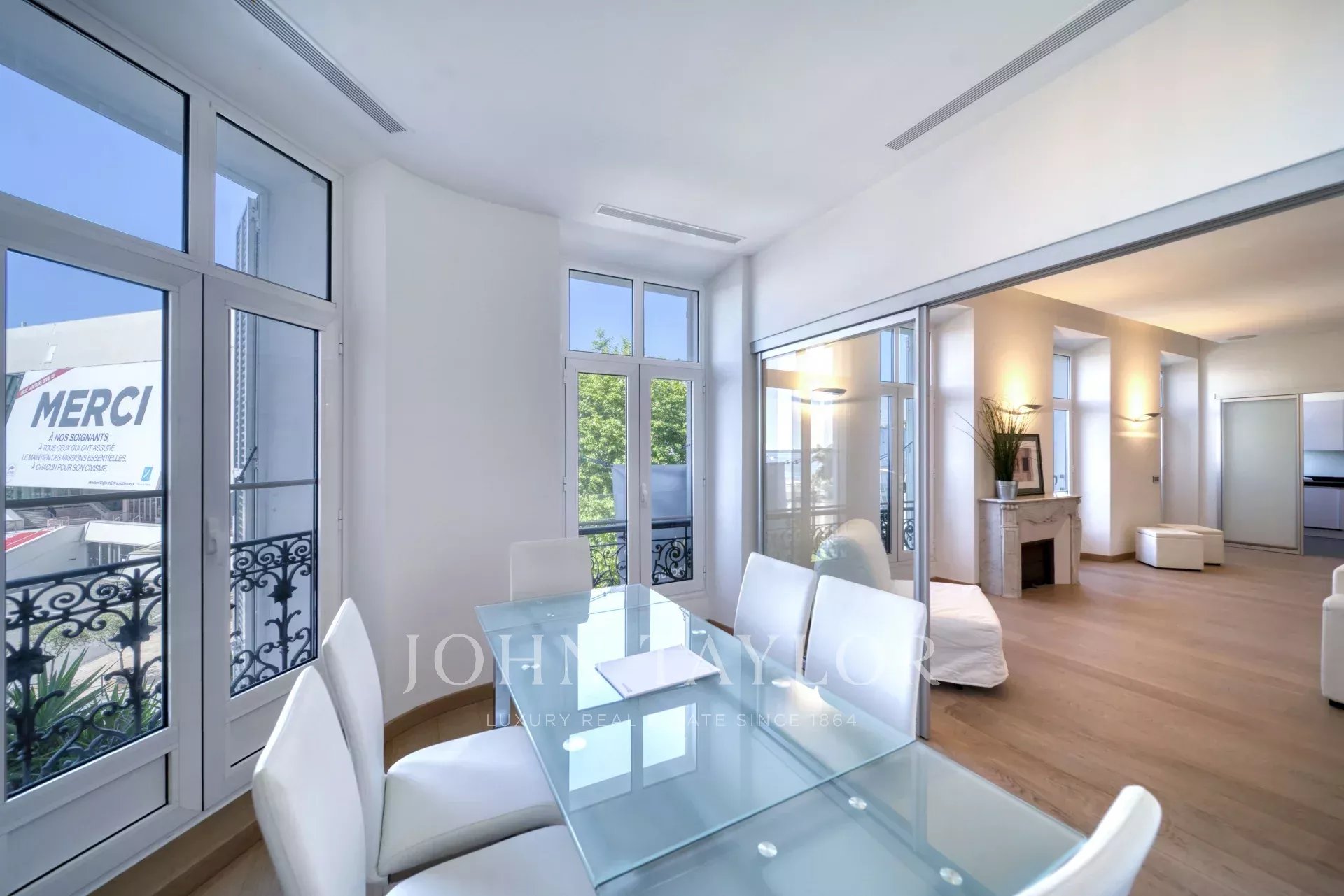 Выходящая на Дворец фестивалей большая гостиная с гостиной, столовой и оборудованной кухней открытого плана.