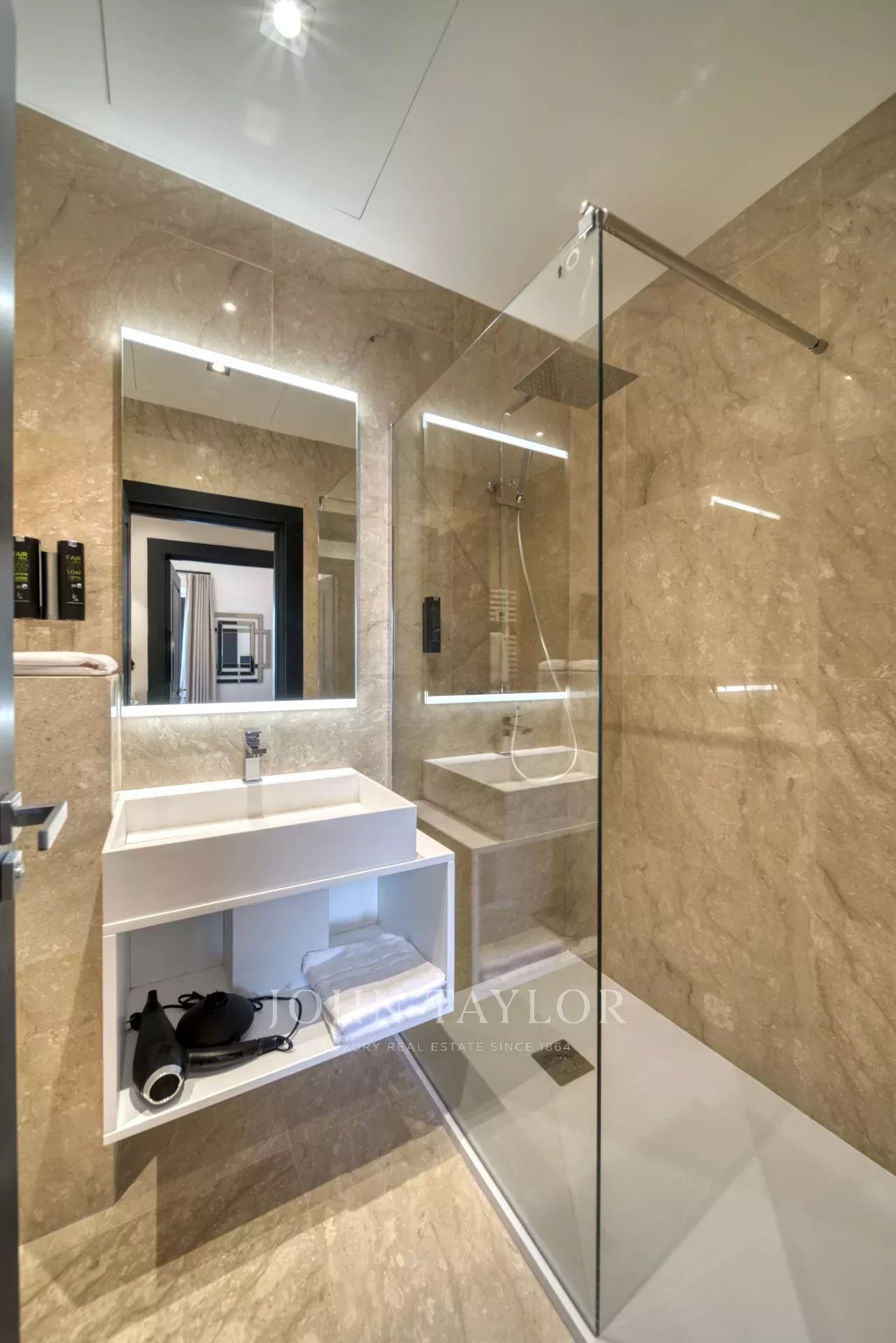 На 3-м этаже здания среднего класса, напротив Дворца фестивалей и пляжей Круазетт, в 1 минуте от улицы Антиб, полностью отремонтированная современная квартира с кондиционером и жилой площадью 195 м2: