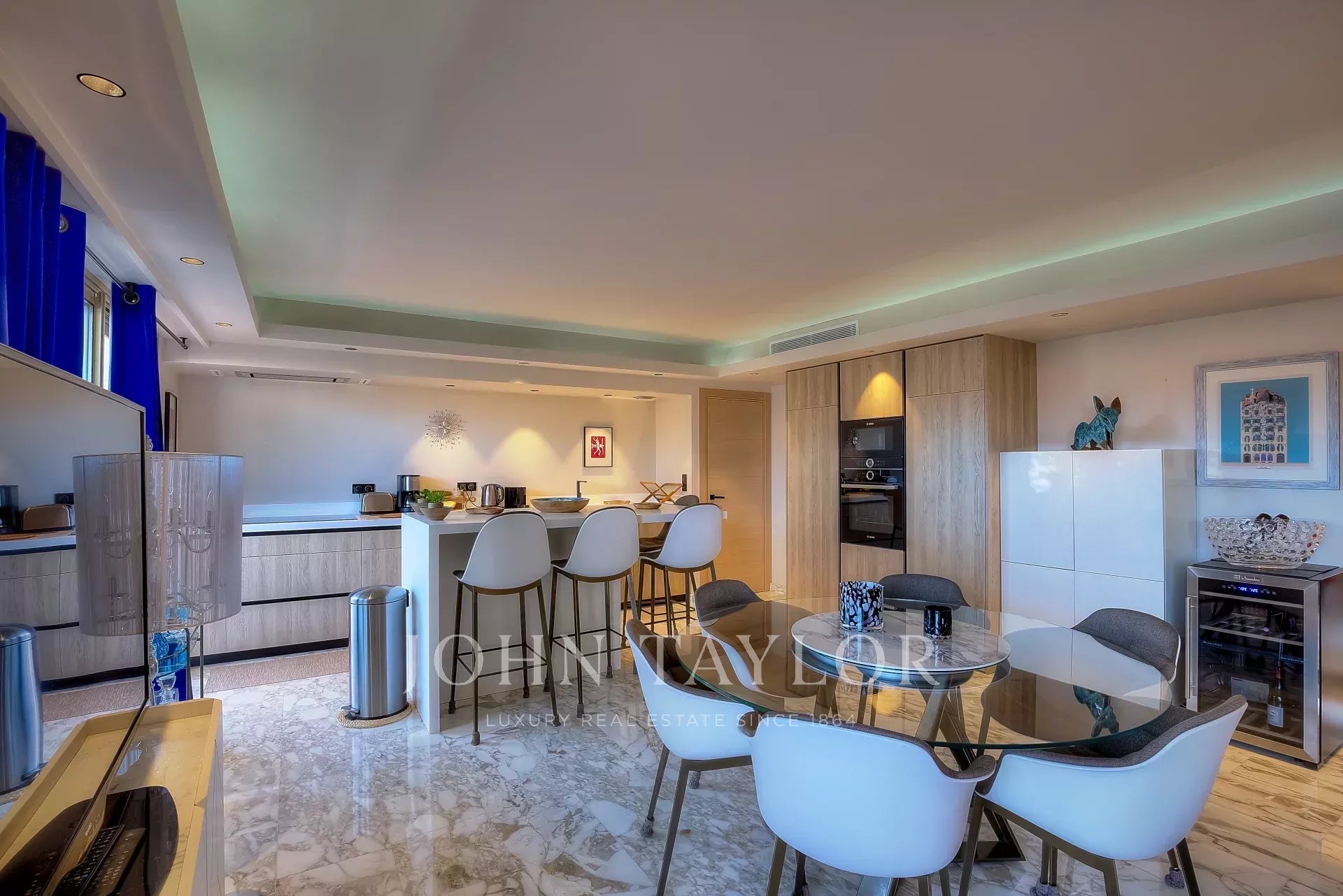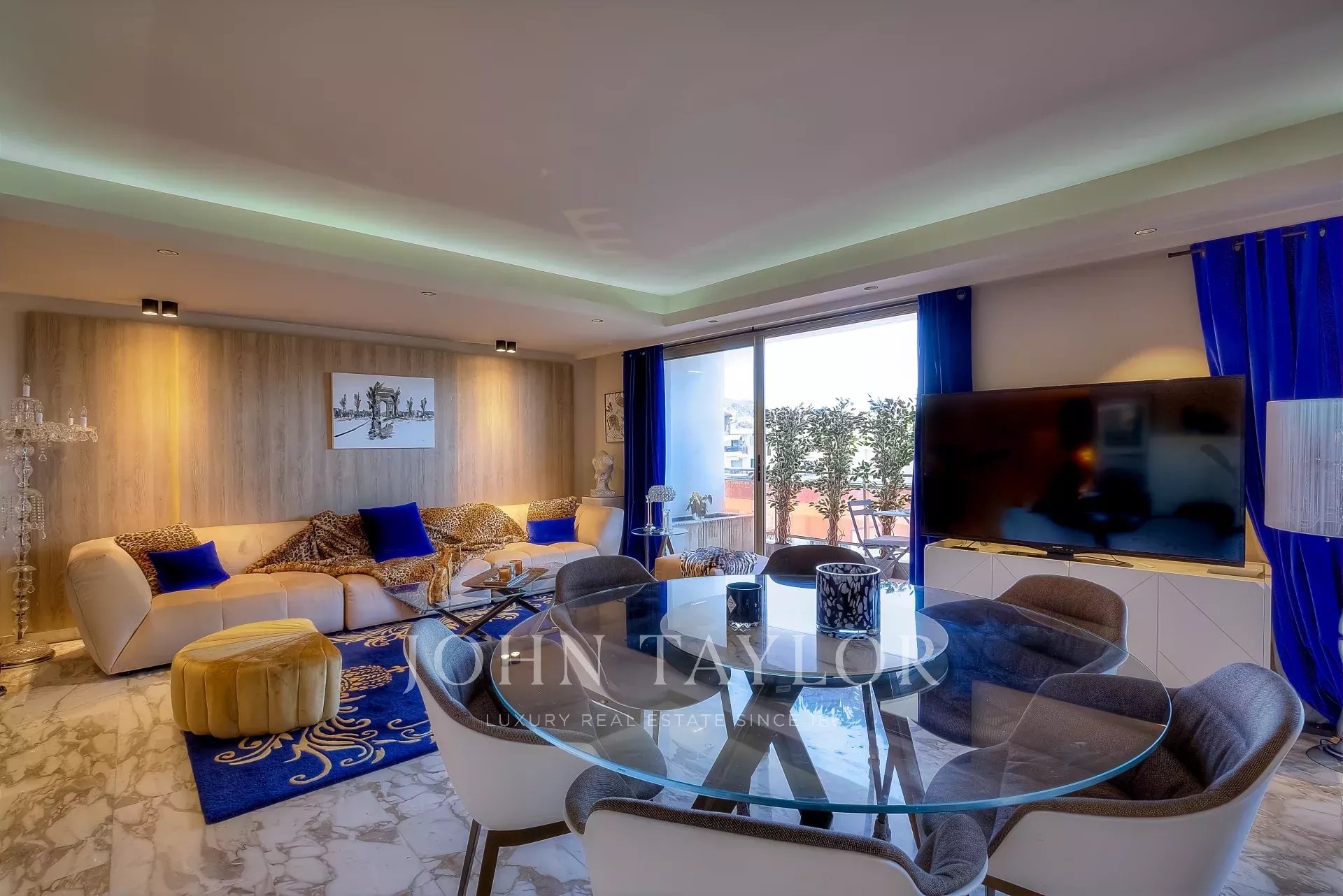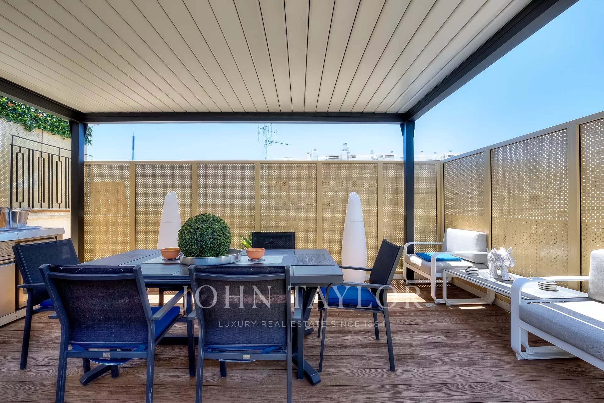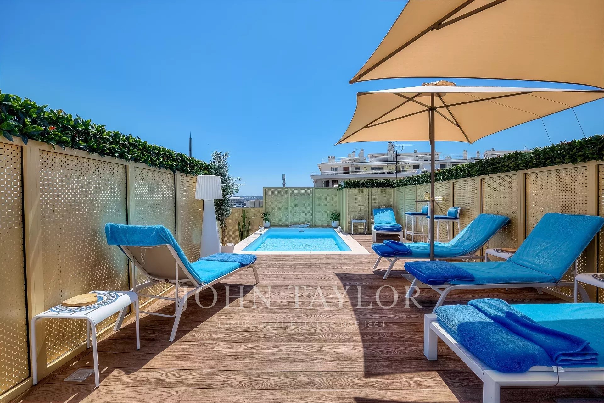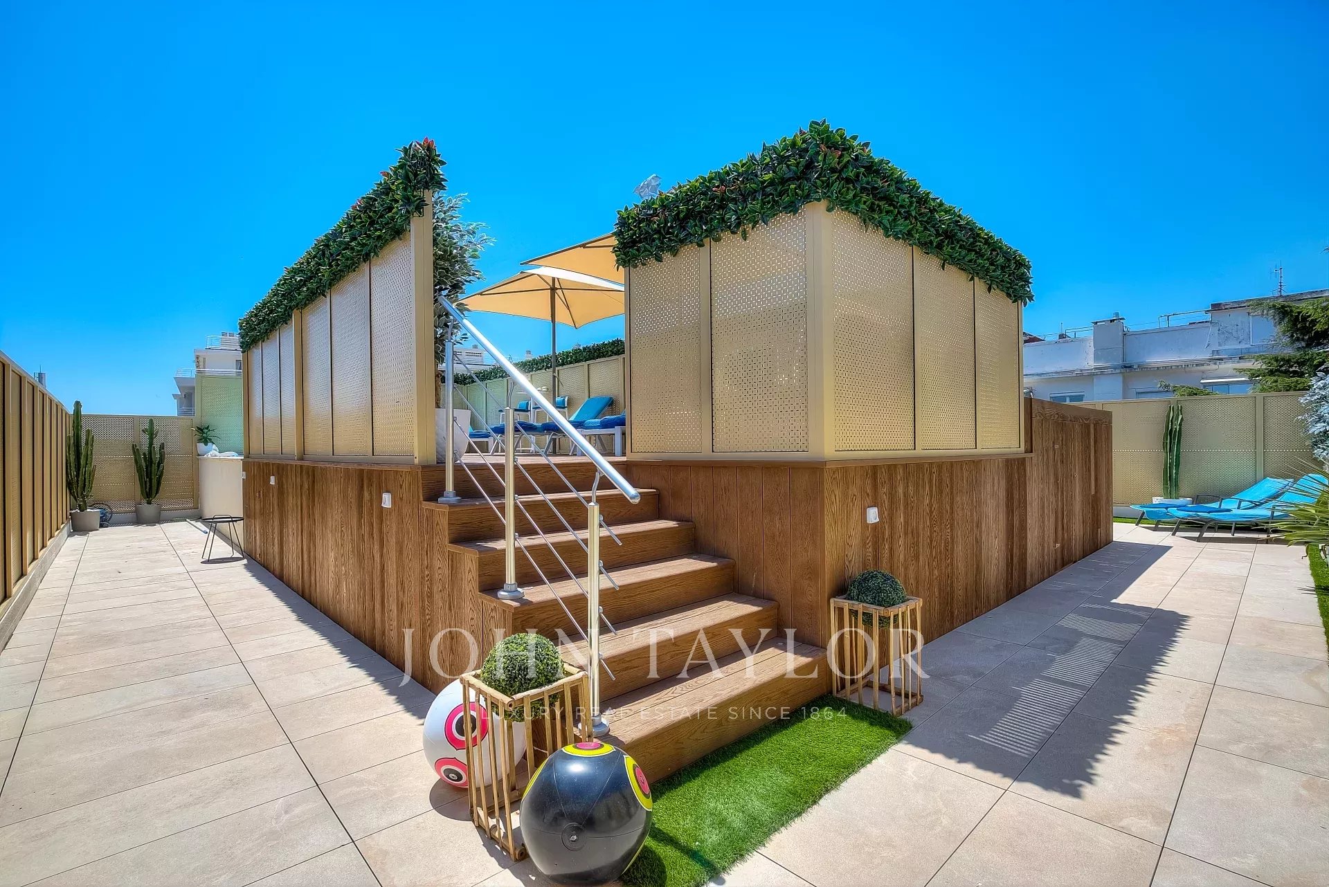В роскошной резиденции, во 2-м ряду набережной Круазетт, превосходная современная квартира площадью 100 м2 с террасой на крыше площадью 176 м2 с частным бассейном (5,5 м x 3 м), шезлонгами, гостиной, обеденной зоной и летней кухней с барбекю.