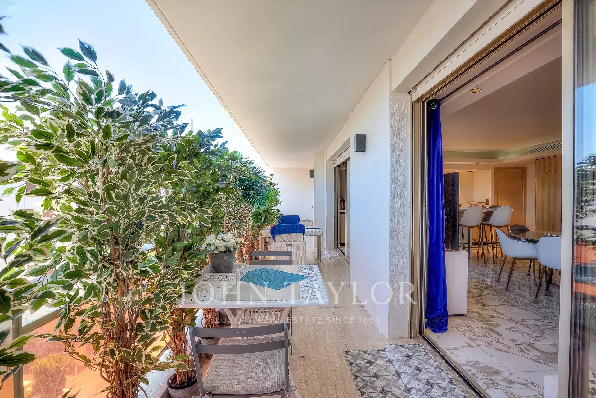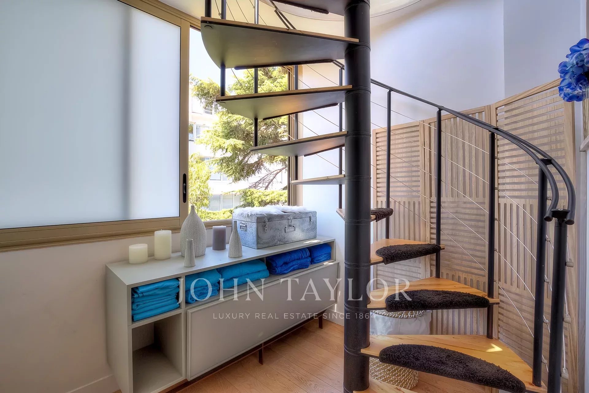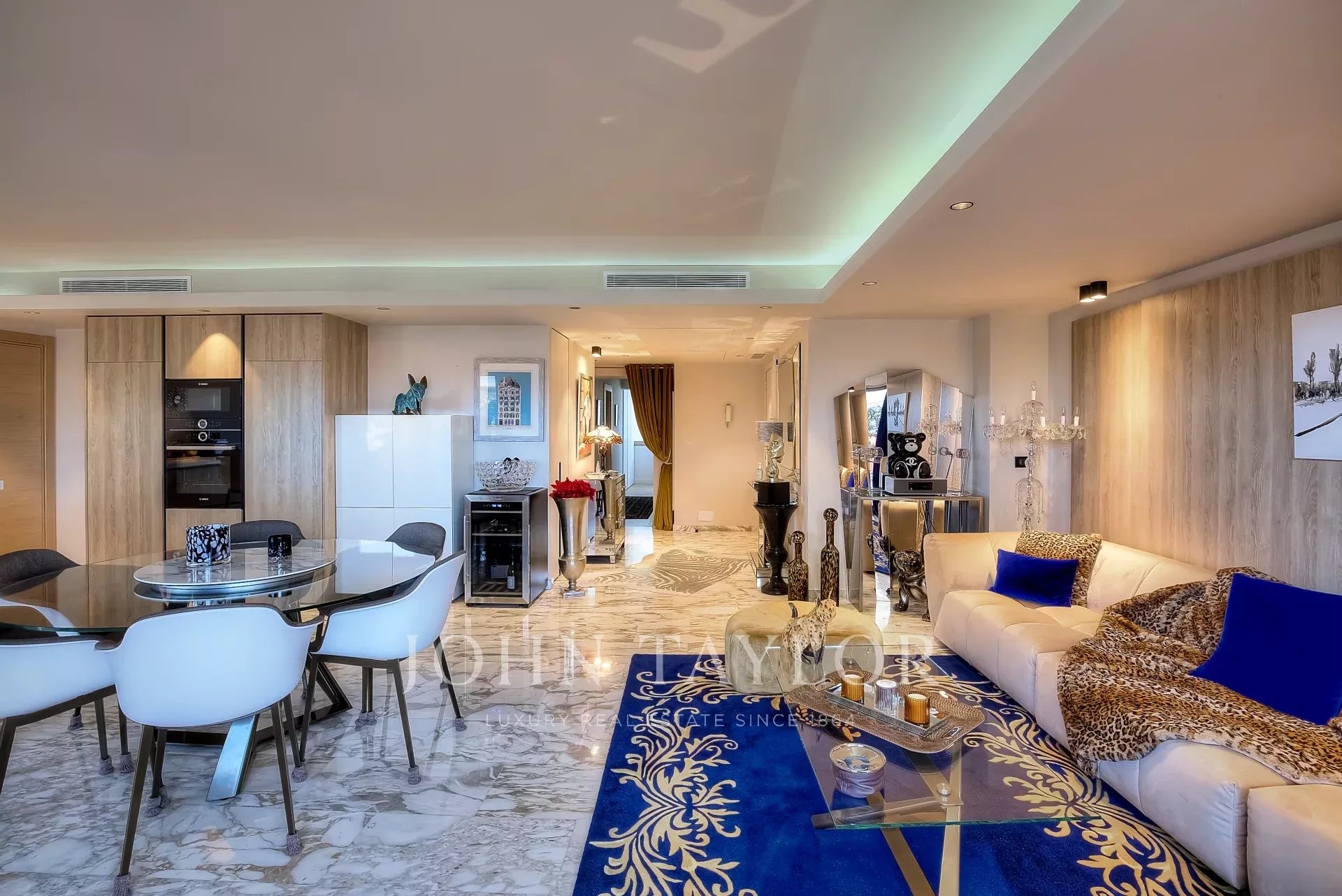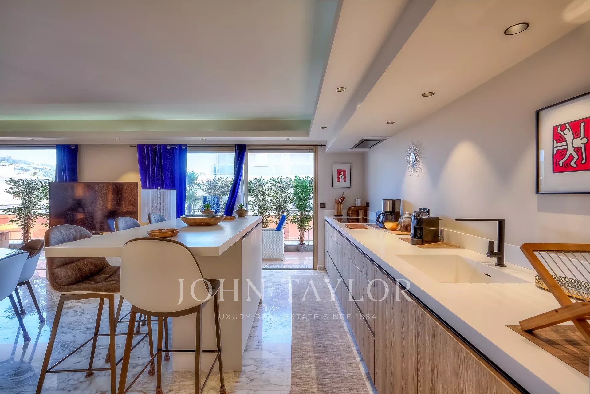 В роскошной резиденции, во 2-м ряду набережной Круазетт, превосходная современная квартира площадью 100 м2 с террасой на крыше площадью 176 м2 с частным бассейном (5,5 м x 3 м), шезлонгами, гостиной, обеденной зоной и летней кухней с барбекю.