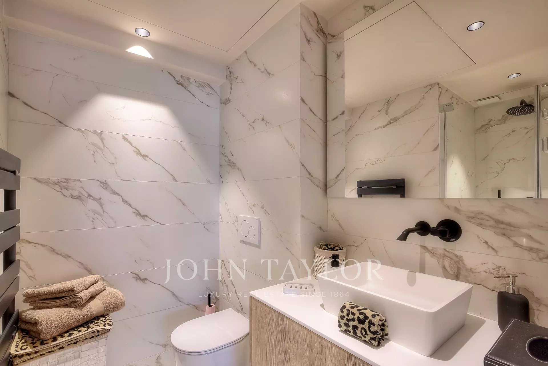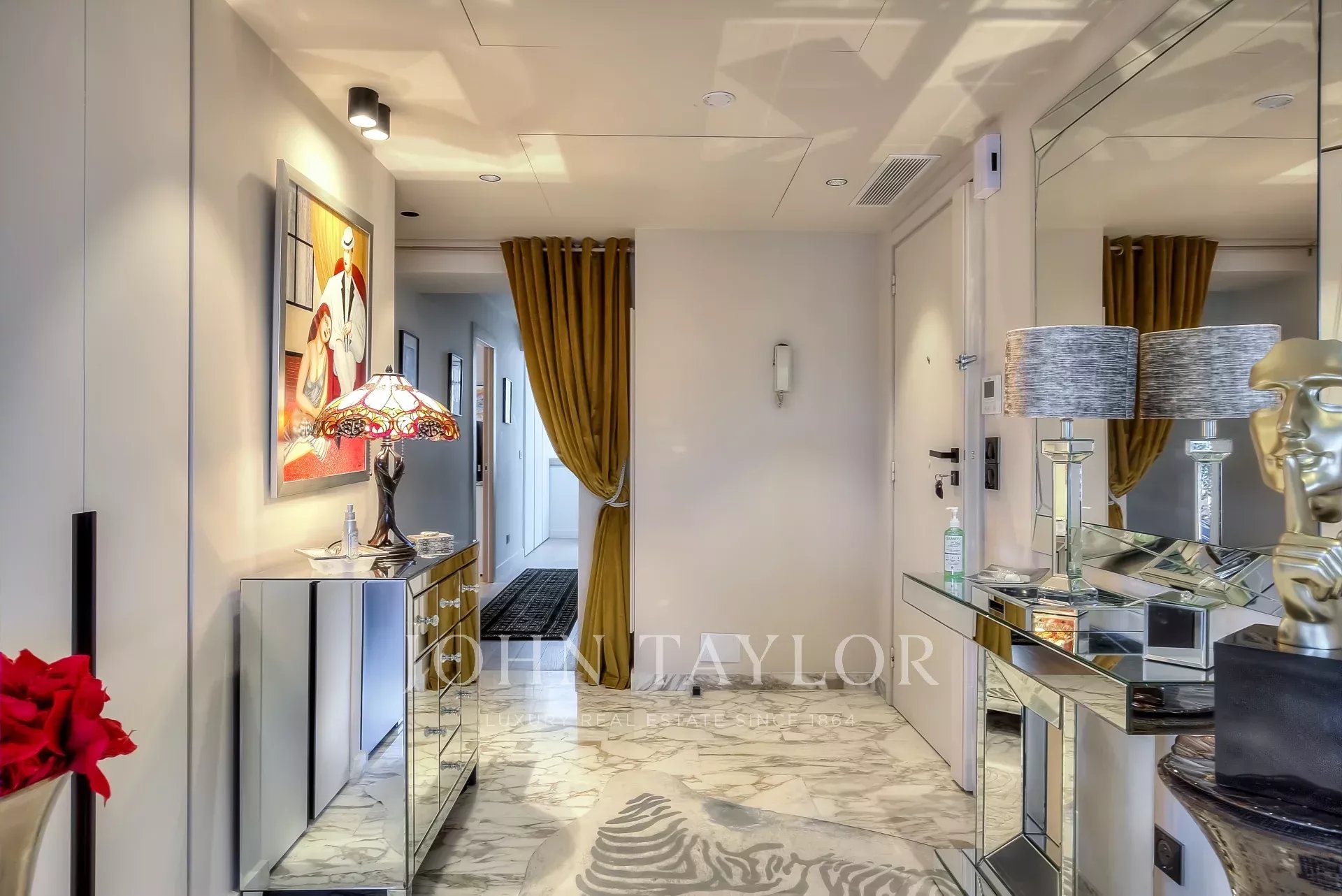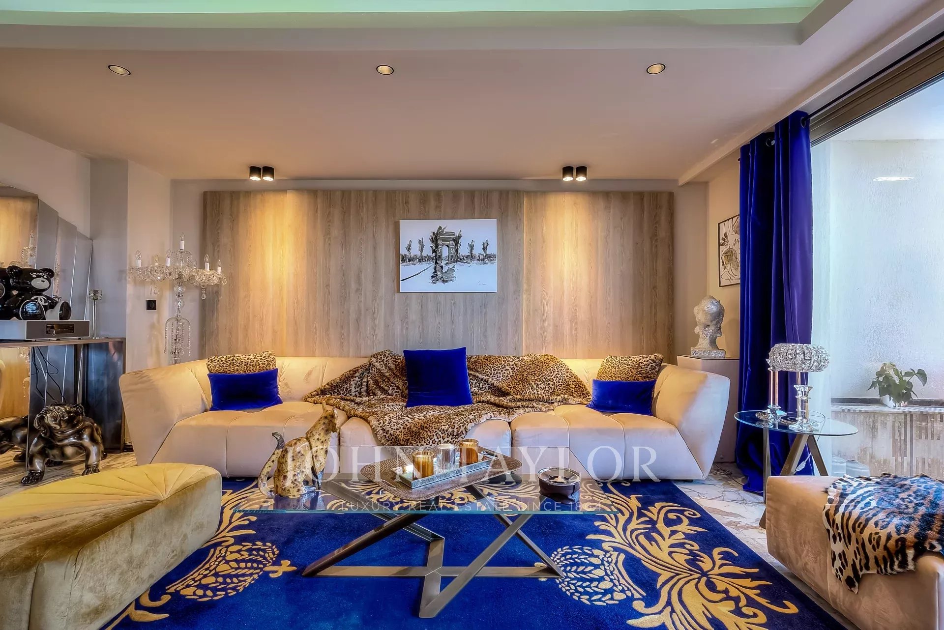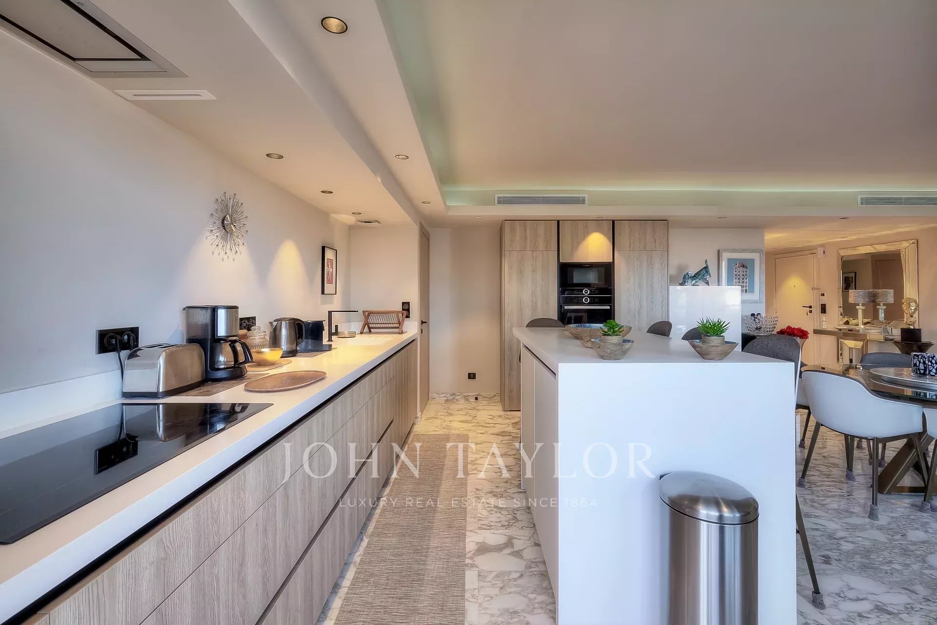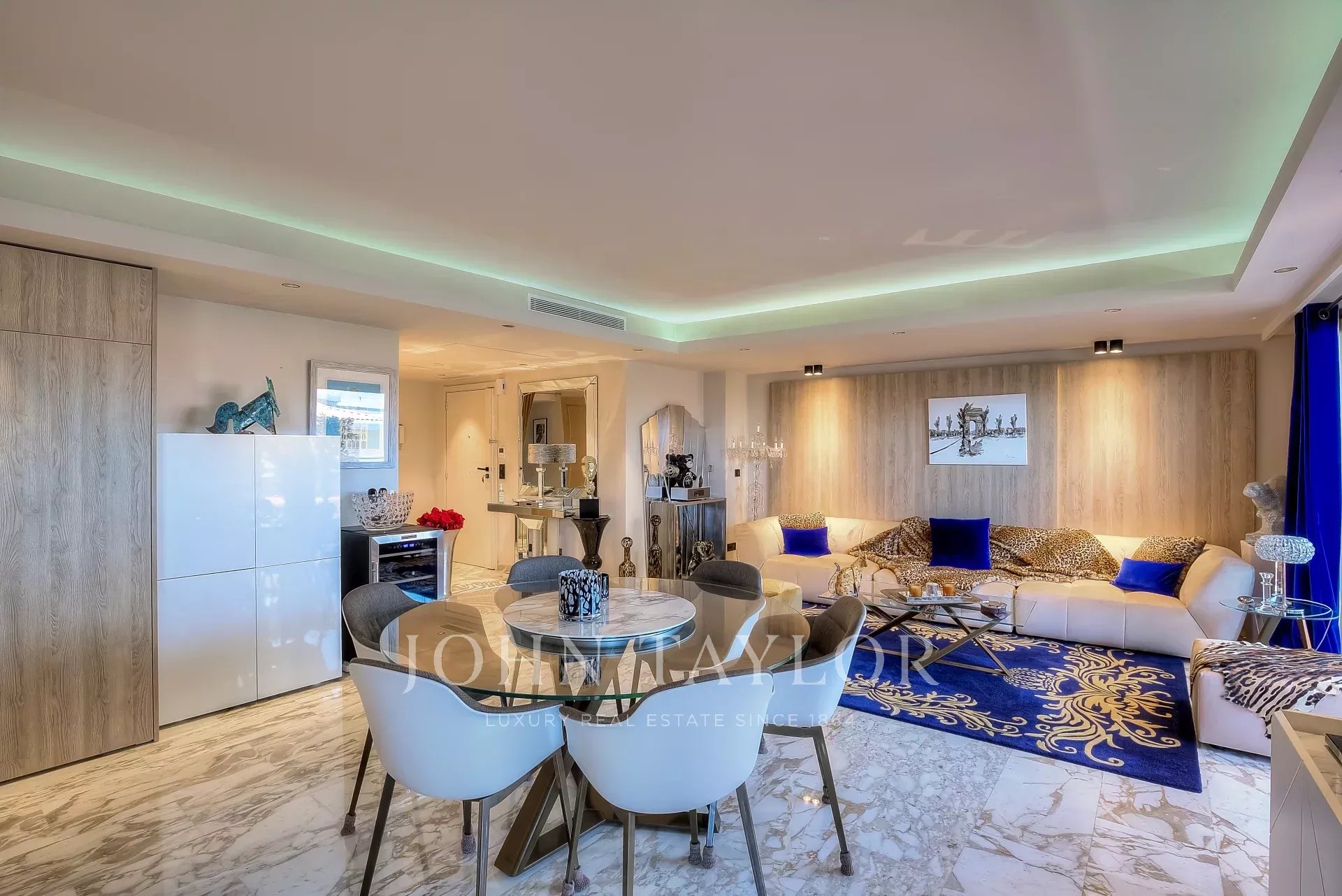 В роскошной резиденции, во 2-м ряду набережной Круазетт, превосходная современная квартира площадью 100 м2 с террасой на крыше площадью 176 м2 с частным бассейном (5,5 м x 3 м), шезлонгами, гостиной, обеденной зоной и летней кухней с барбекю.