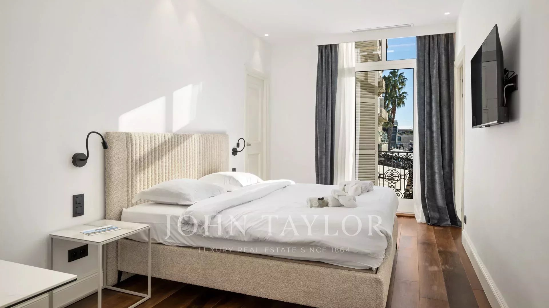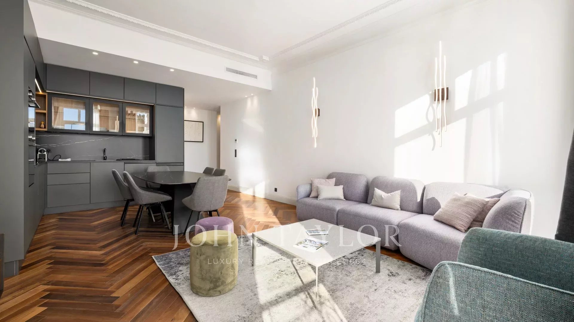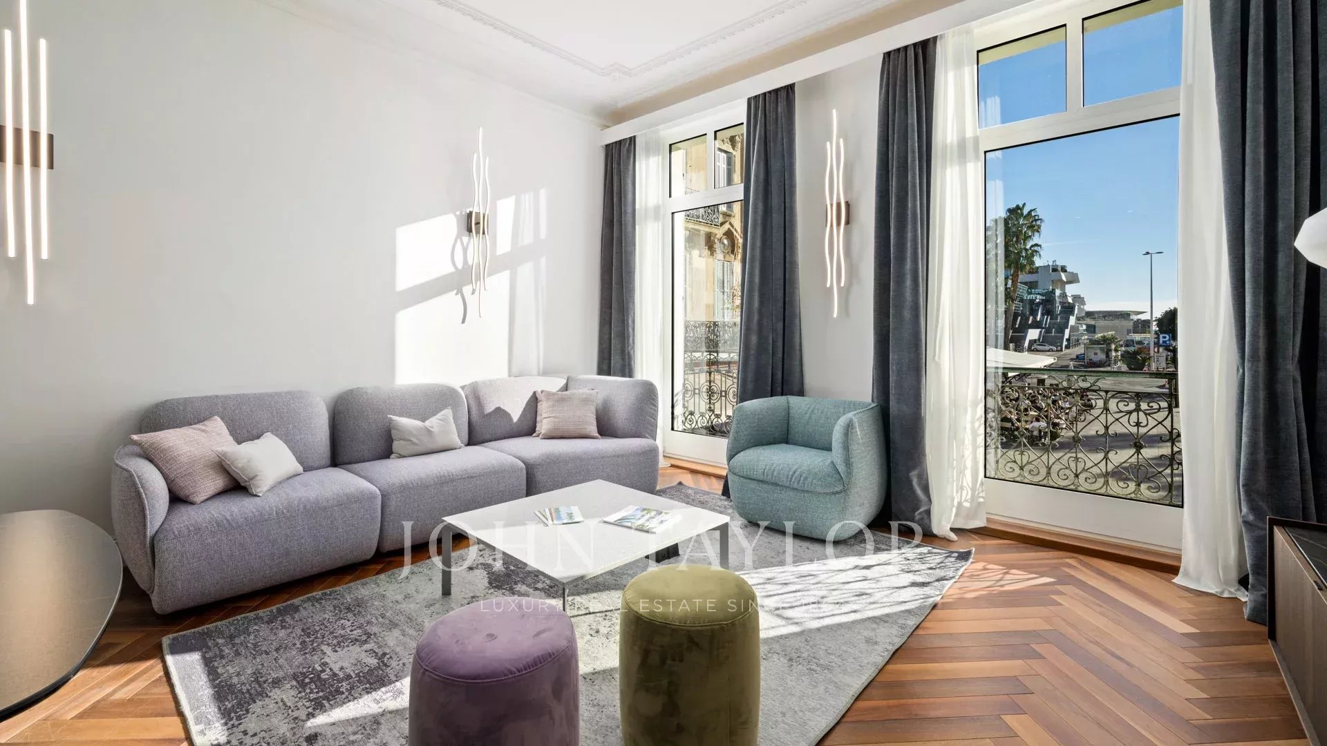 Идеально расположенная напротив Дворца фестивалей с беспрепятственным видом на площадь Шарля де Голля, старый порт Канн и Ле Сюке, эта современная квартира площадью 120 м² была полностью отремонтирована и оснащена кондиционером.