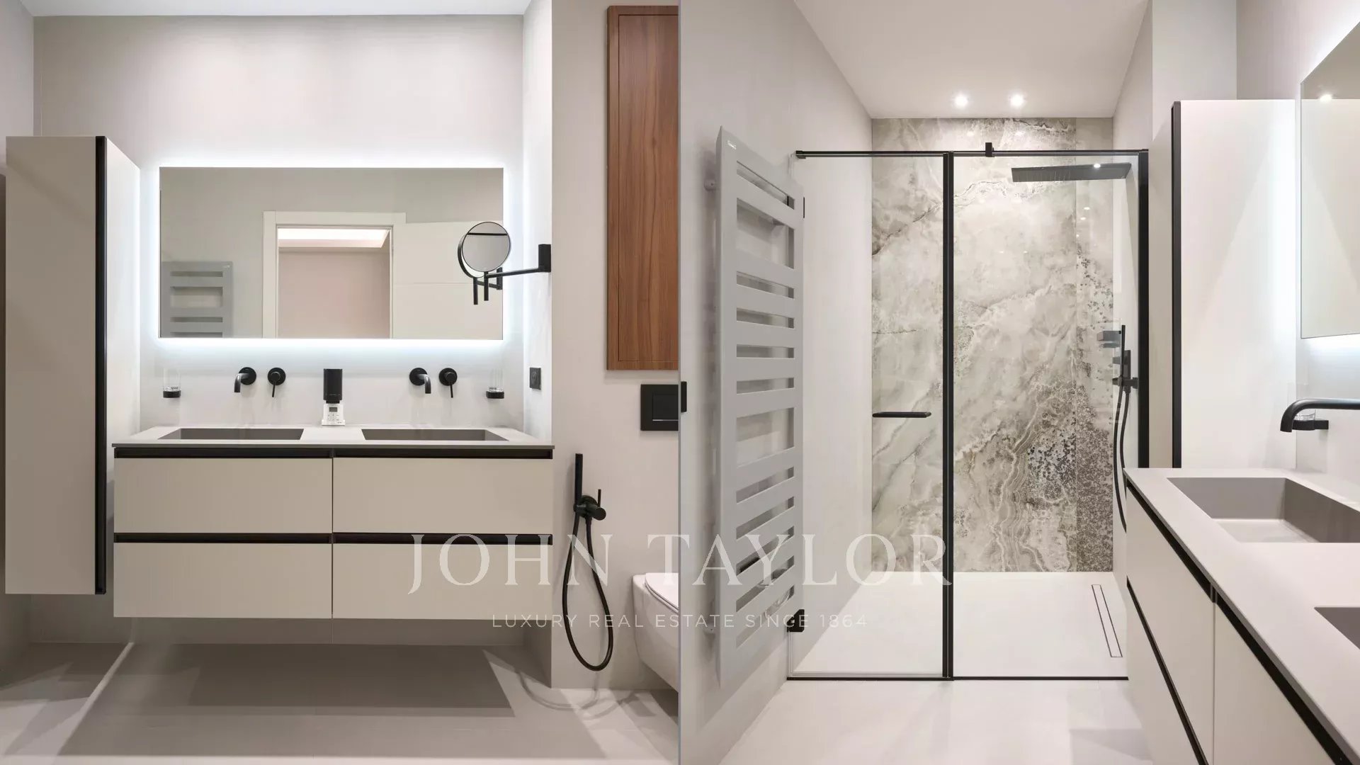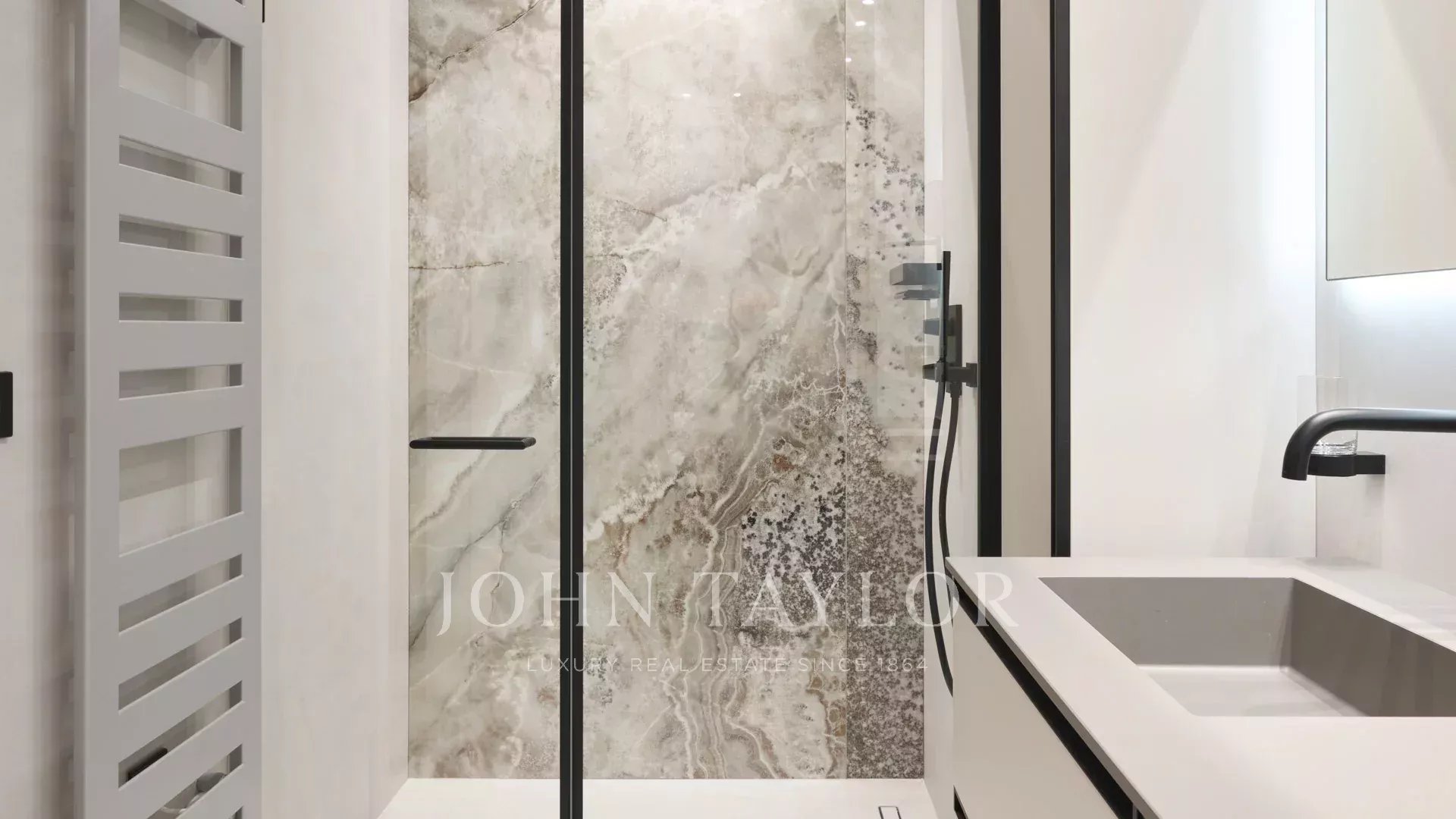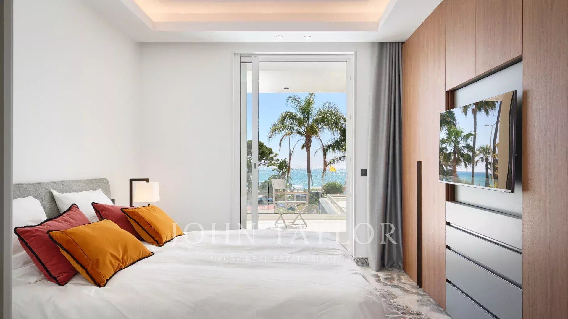 Полностью отремонтированная в 2023 году, квартира может похвастаться изысканным декором, высококлассными светильниками и фурнитурой, а также большой, красивой террасой на южной стороне площадью около 110 м2, полуприкрытой и оборудованной летними шезлонгами, с которой открывается вид на Каннский залив и набережную Круазетт.