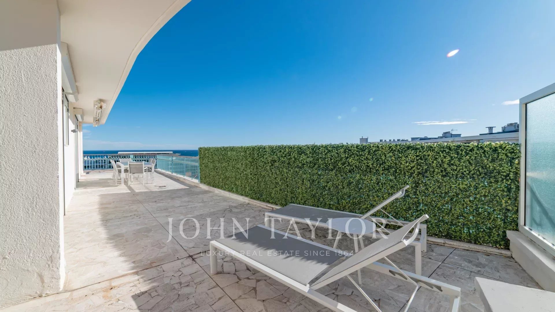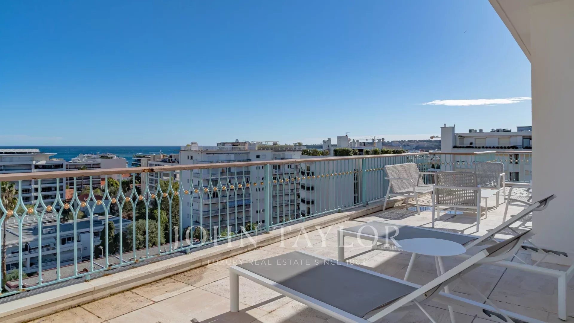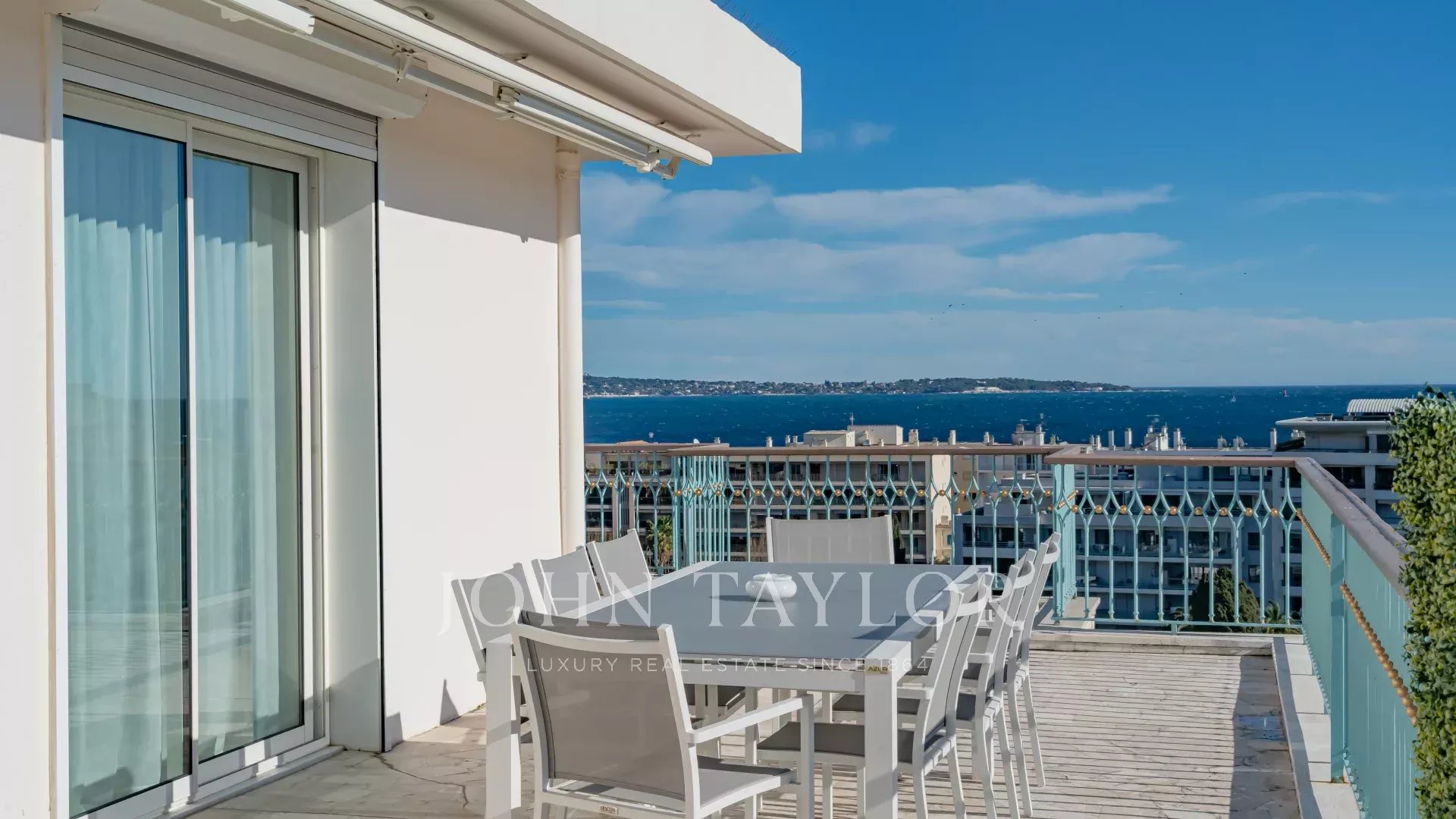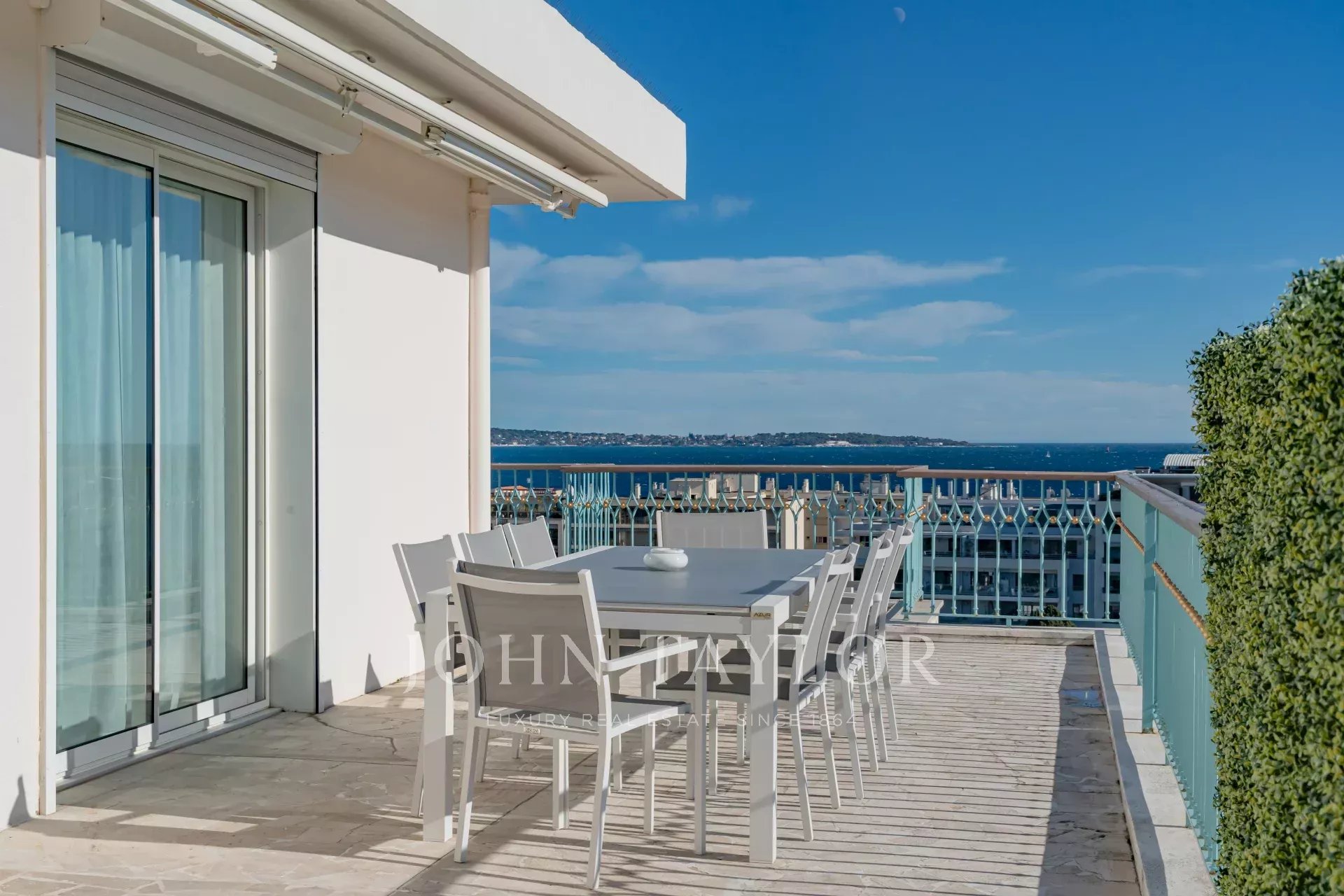 В одной из самых престижных резиденций на набережной Круазетт, в секторе Palm Beach - Pointe Croisette, с великолепным видом на Каннский залив, находится эта великолепная современная терраса на крыше площадью около 110 м2.