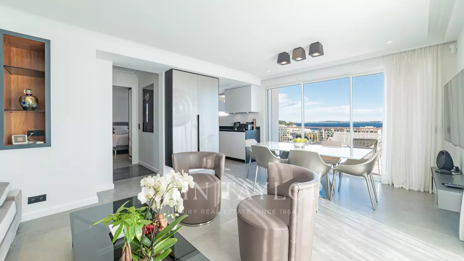 Большая гостиная, столовая и кухня открытой планировки, выходящая на террасу с видом на пляжи Муре Руж.