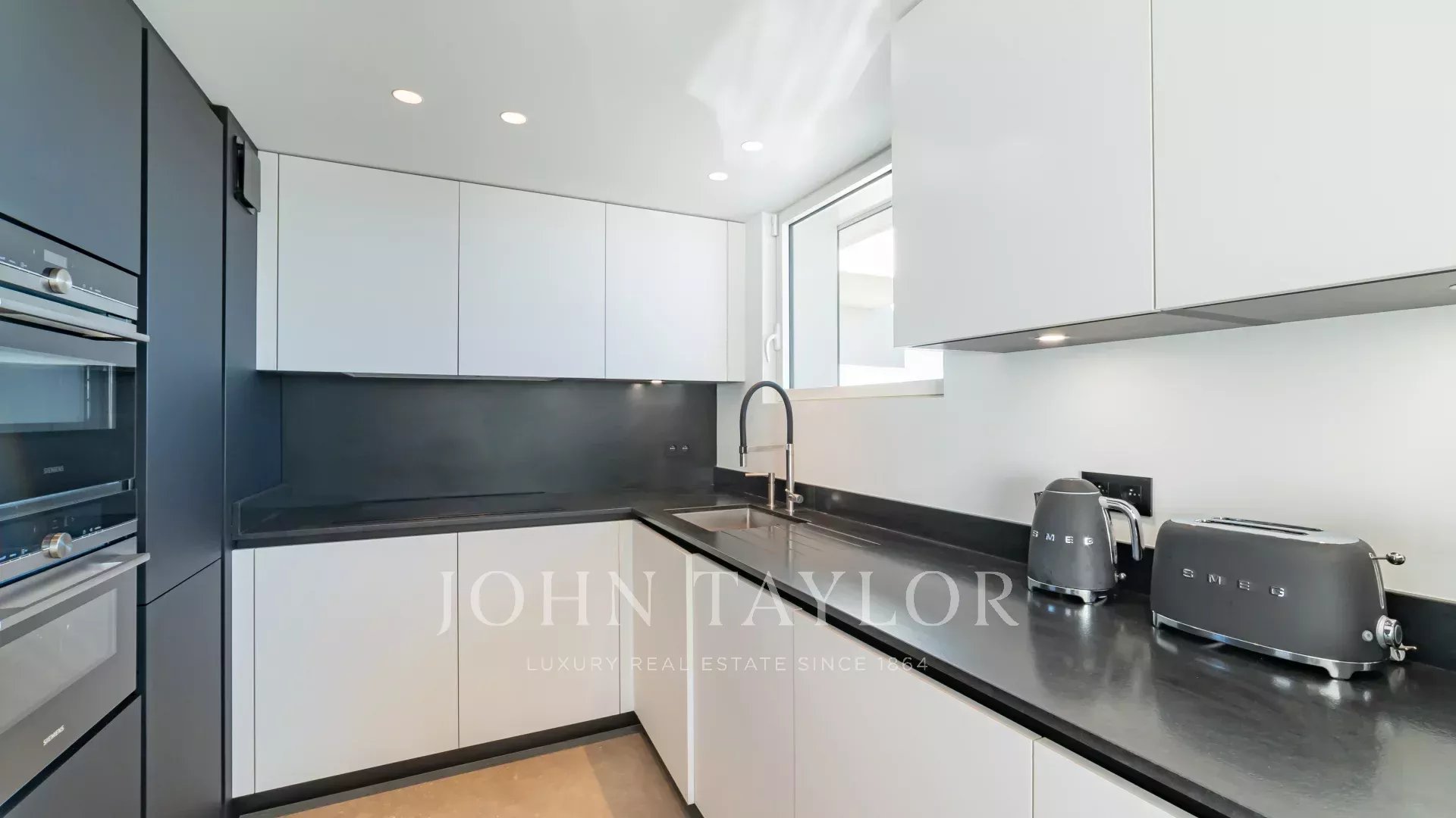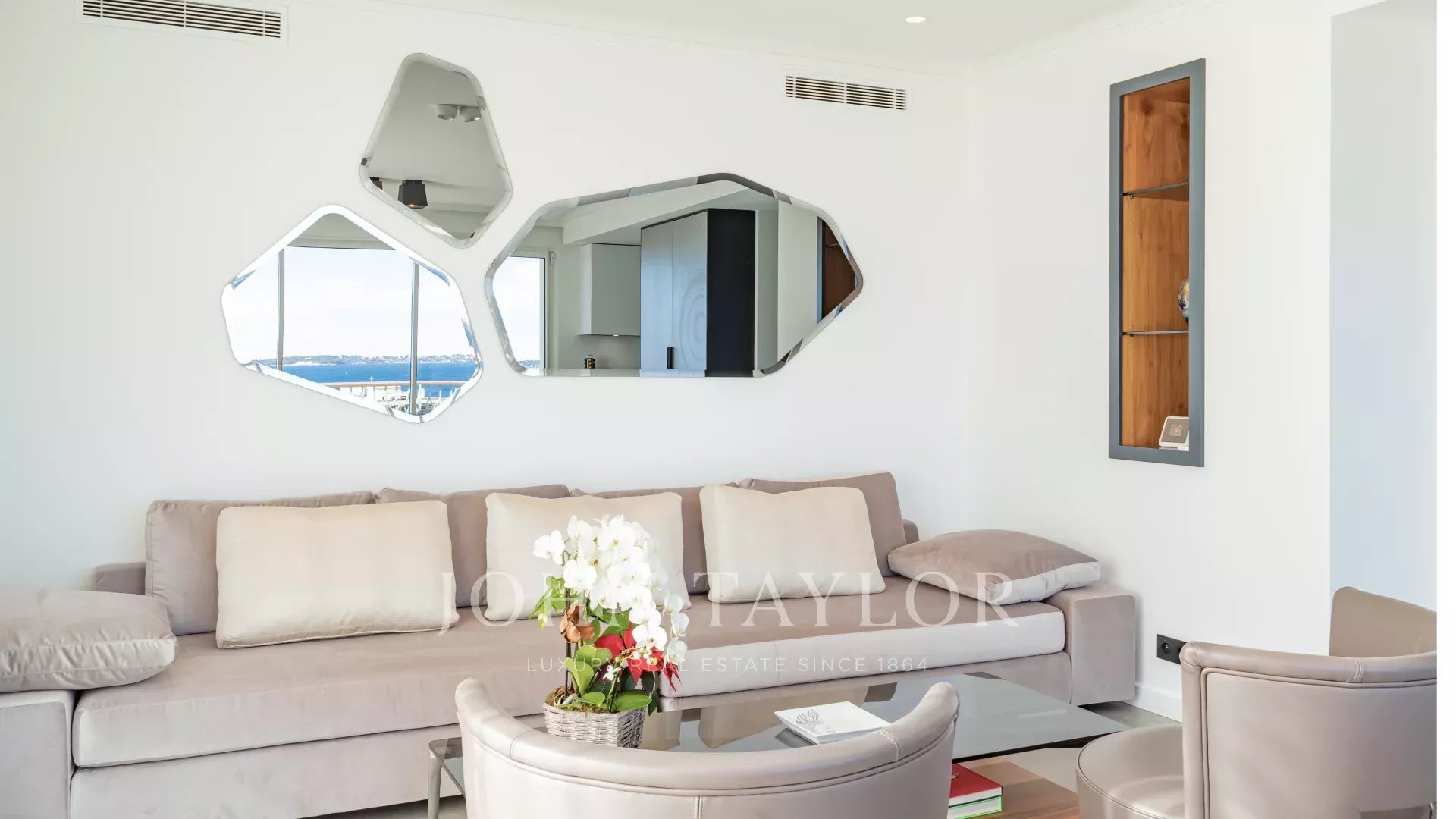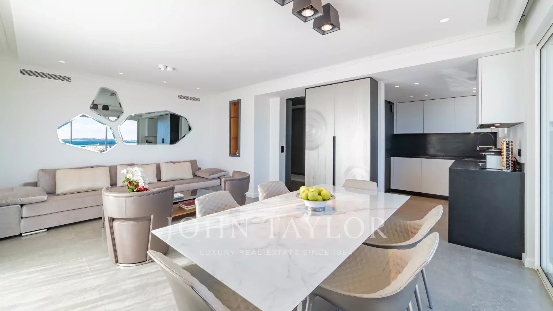Полностью отремонтированная, квартира отличается привлекательным дизайном интерьера, высококлассным оборудованием и большой красивой террасой площадью около 220 м2 с сидениями, шезлонгами и обеденным столом.