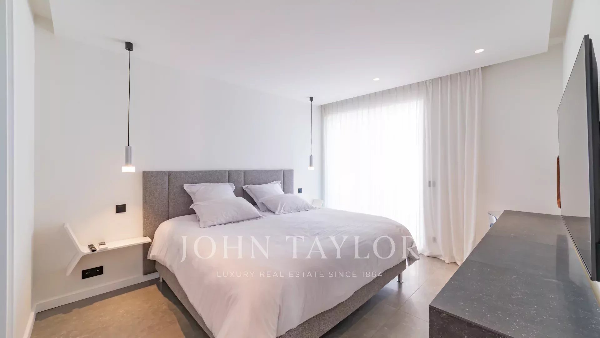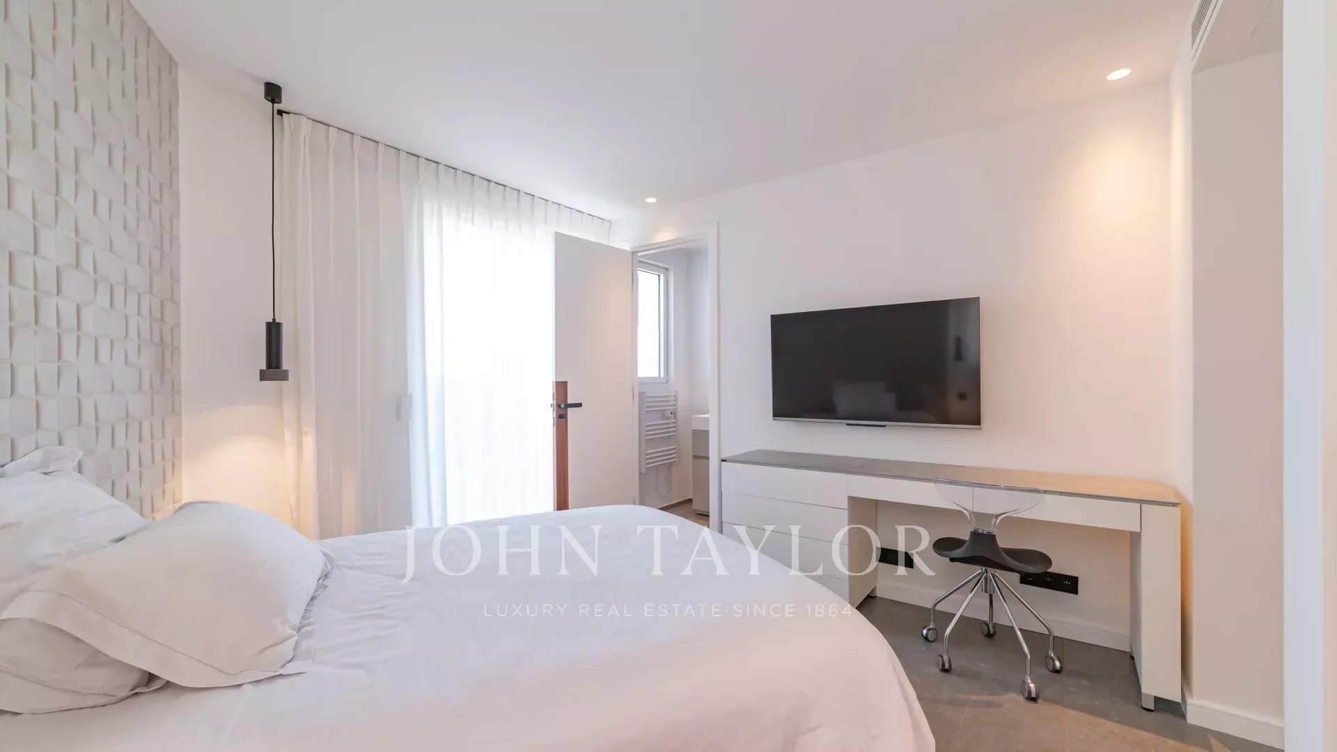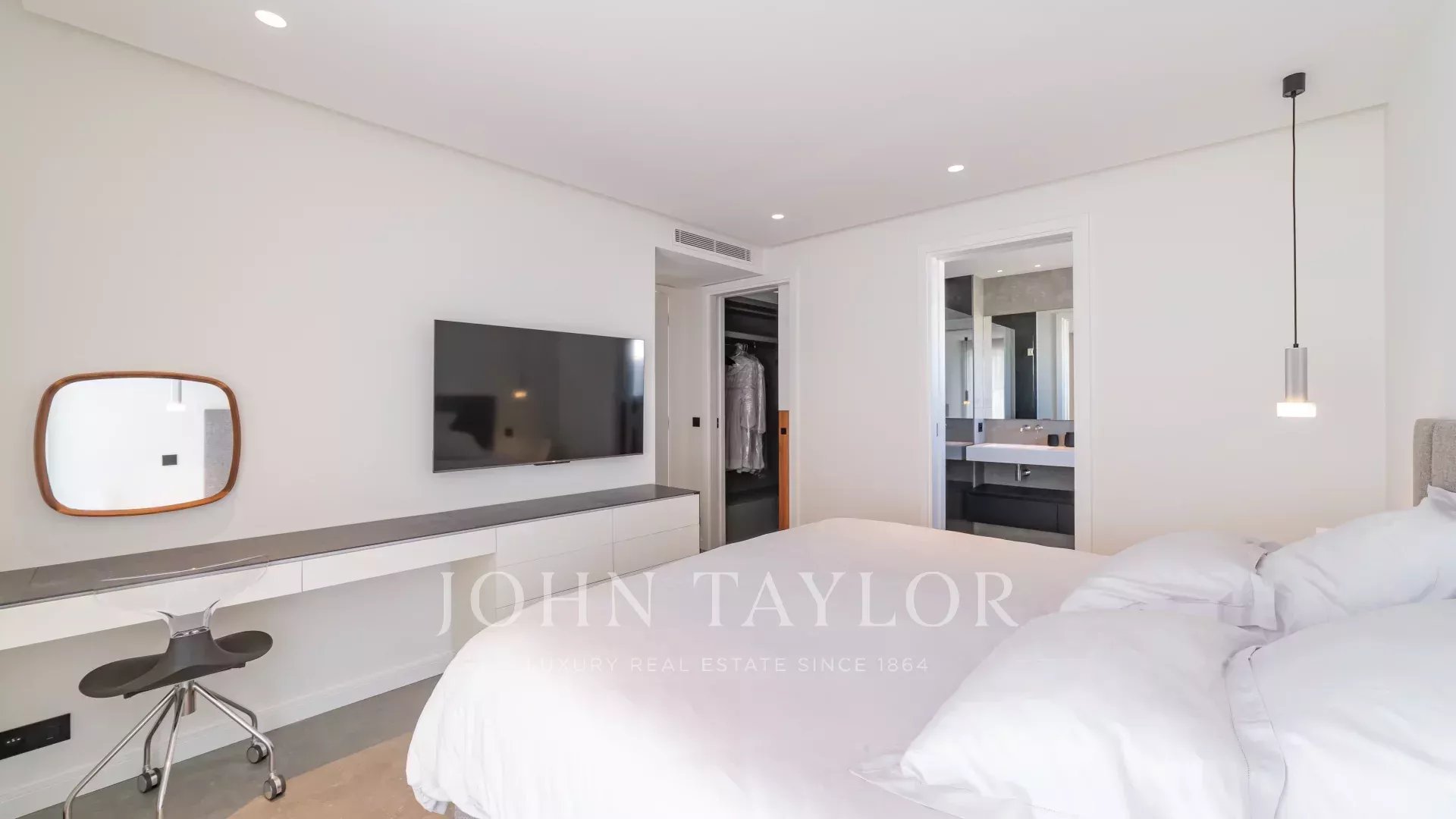 Главная спальня с телевизором, гардеробной и ванной комнатой