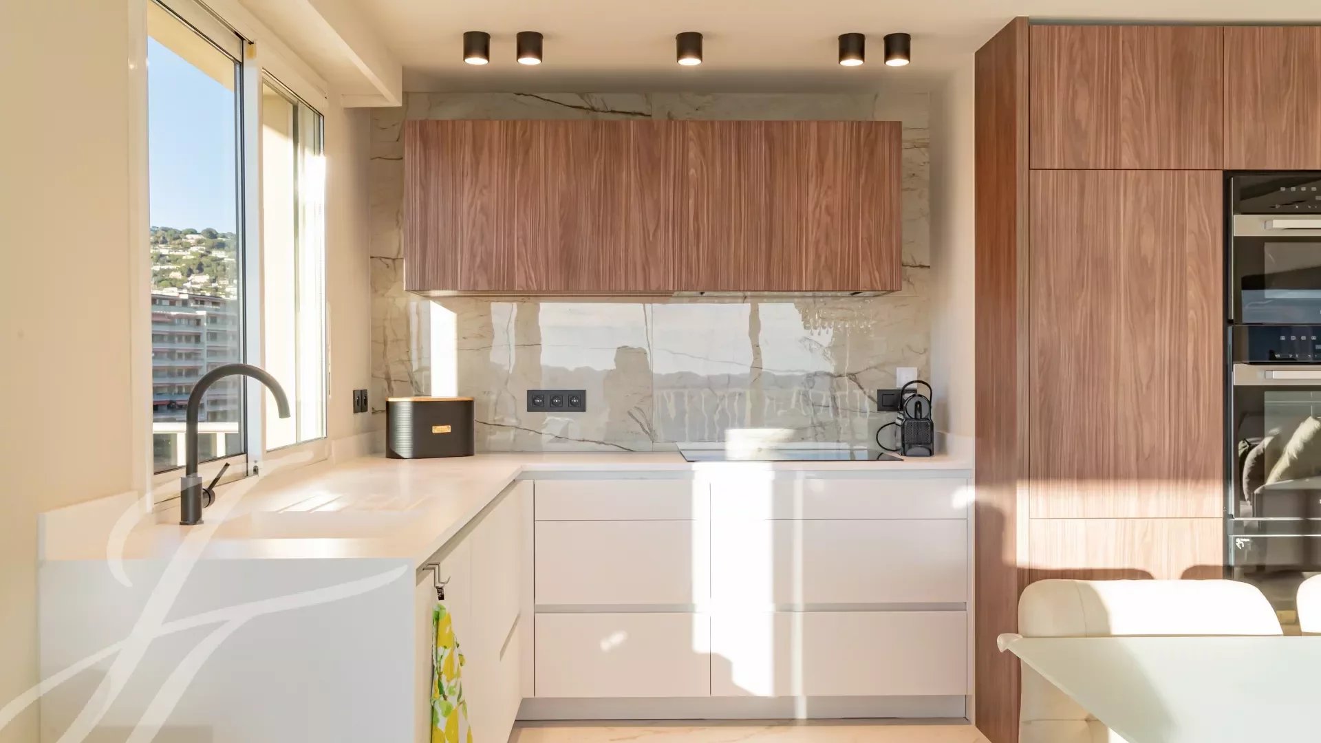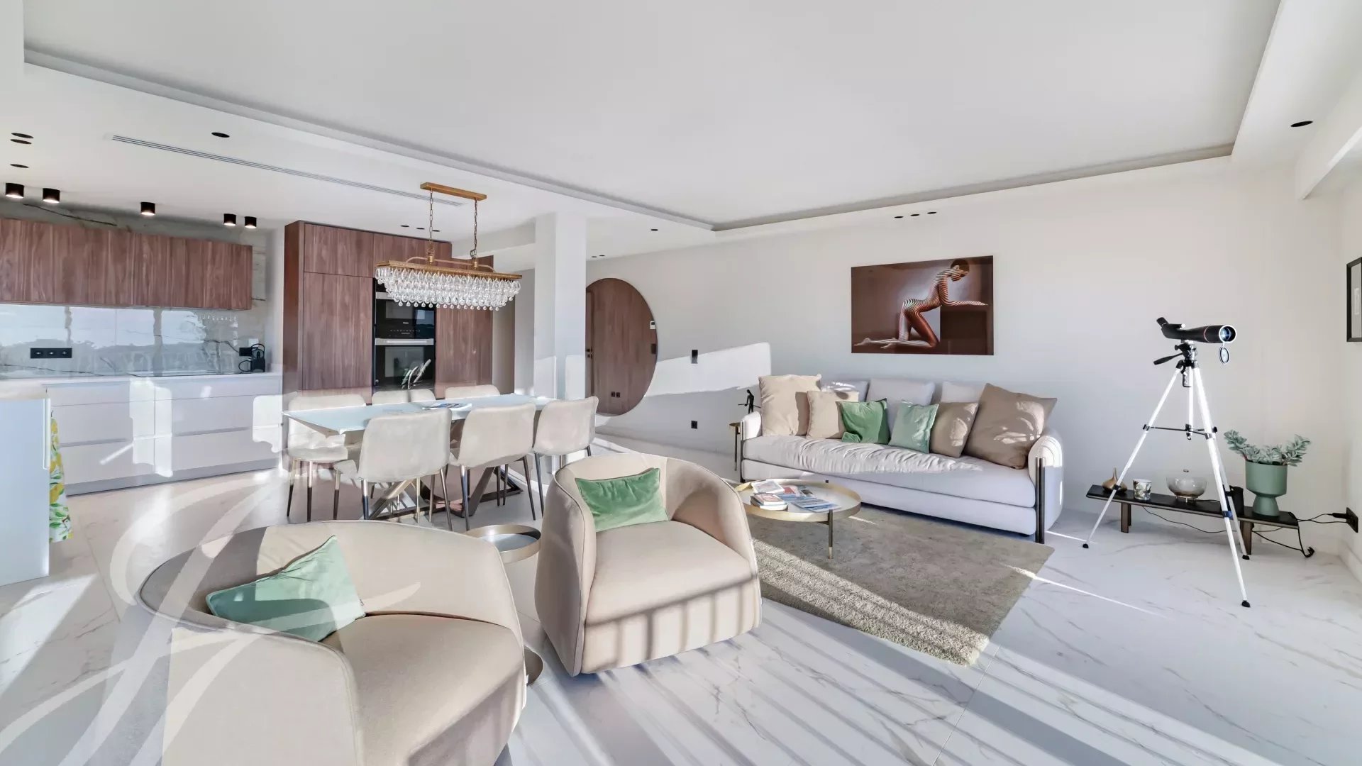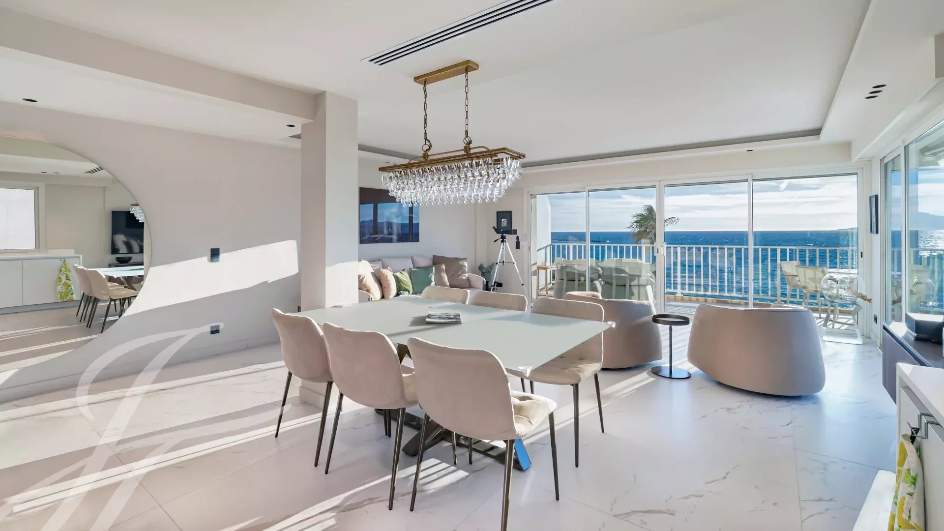 Гостиная, столовая и кухня открытого плана, все выходят на террасу с видом на море.