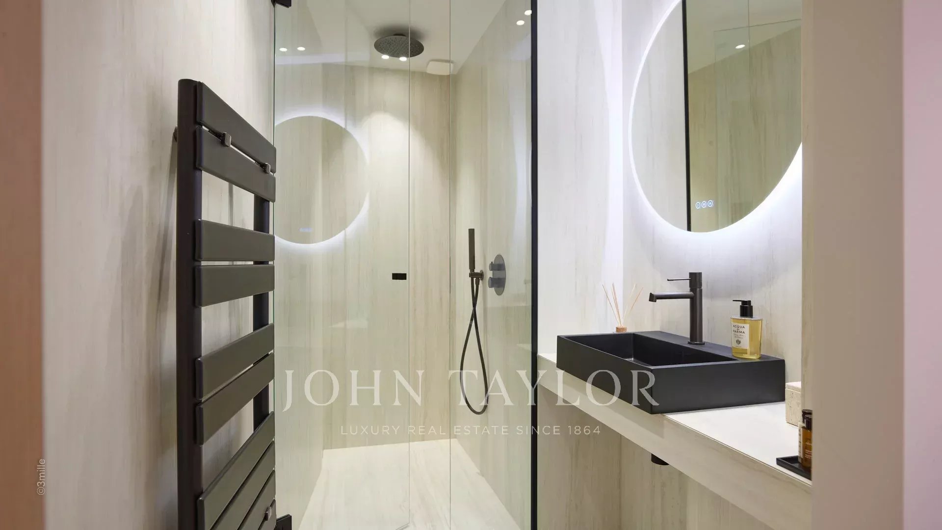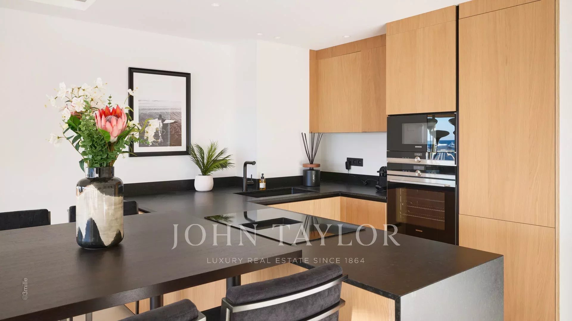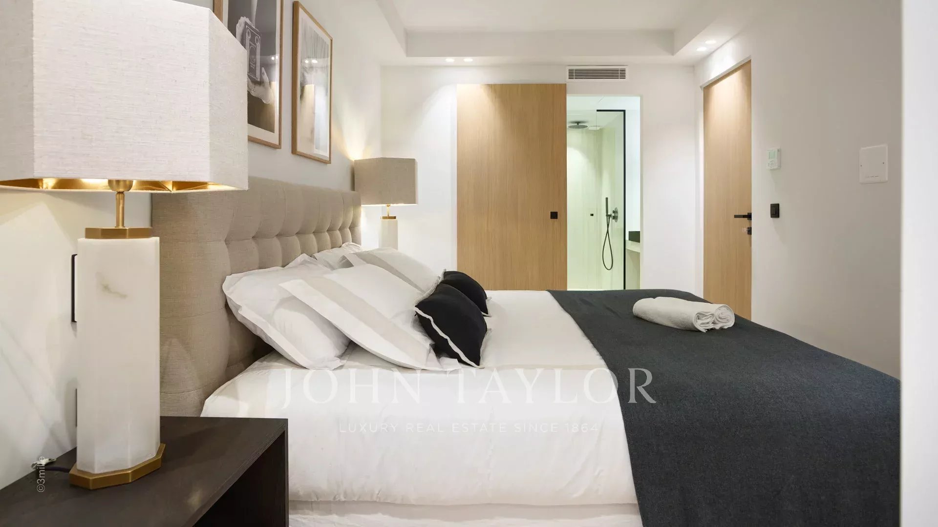 Квартира состоит из гостиной с кухней, двух спален с ванными комнатами и террасы площадью 10 м².