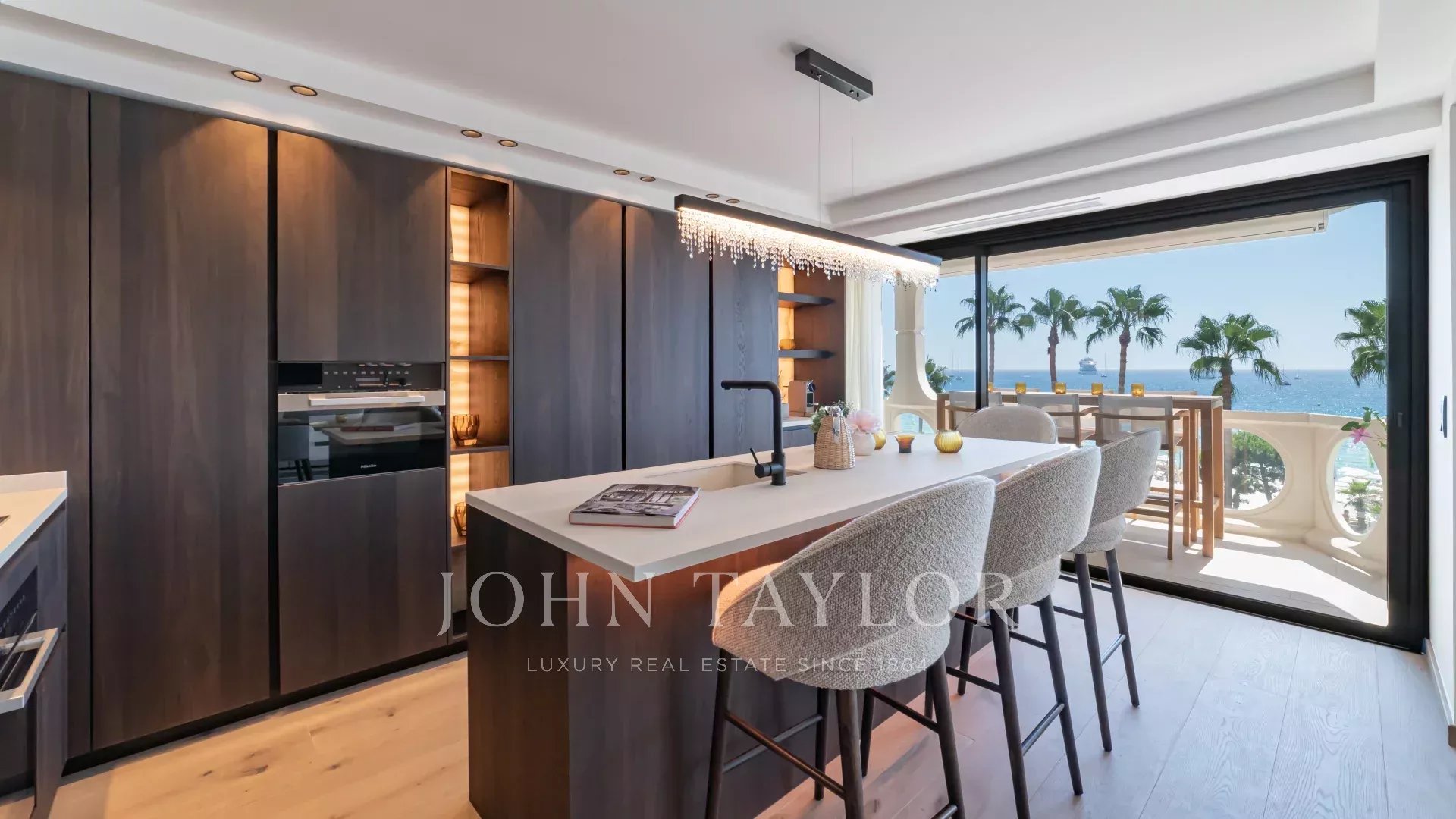 Тройная зона отдыха, состоящая из элегантной гостиной, столовой и кухни открытой планировки с центральным островом, выходящей на просторную террасу с видом на море