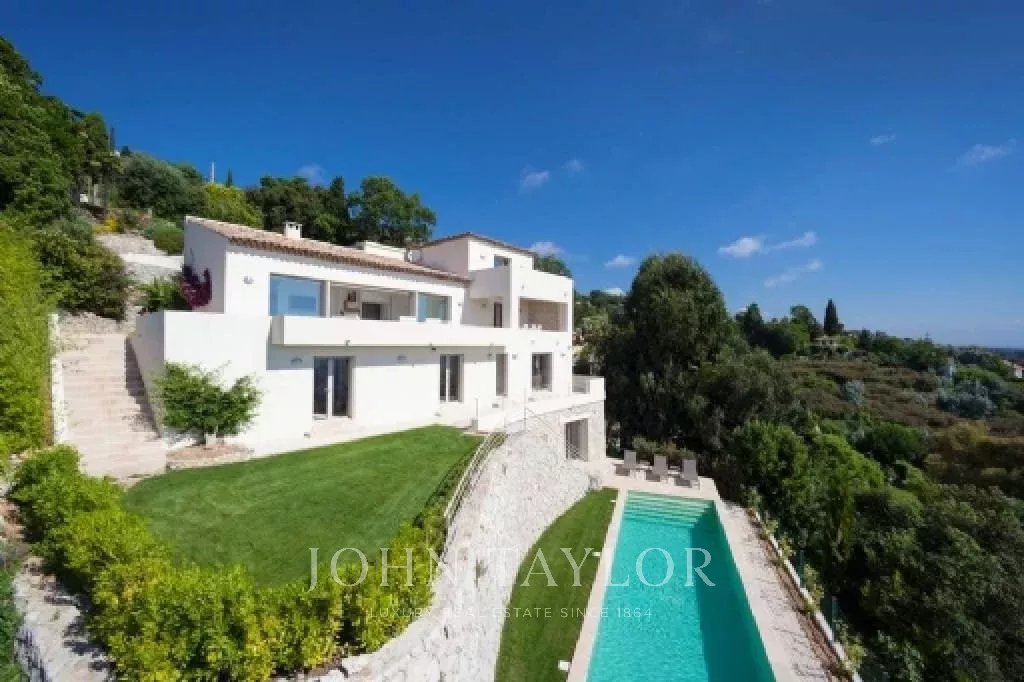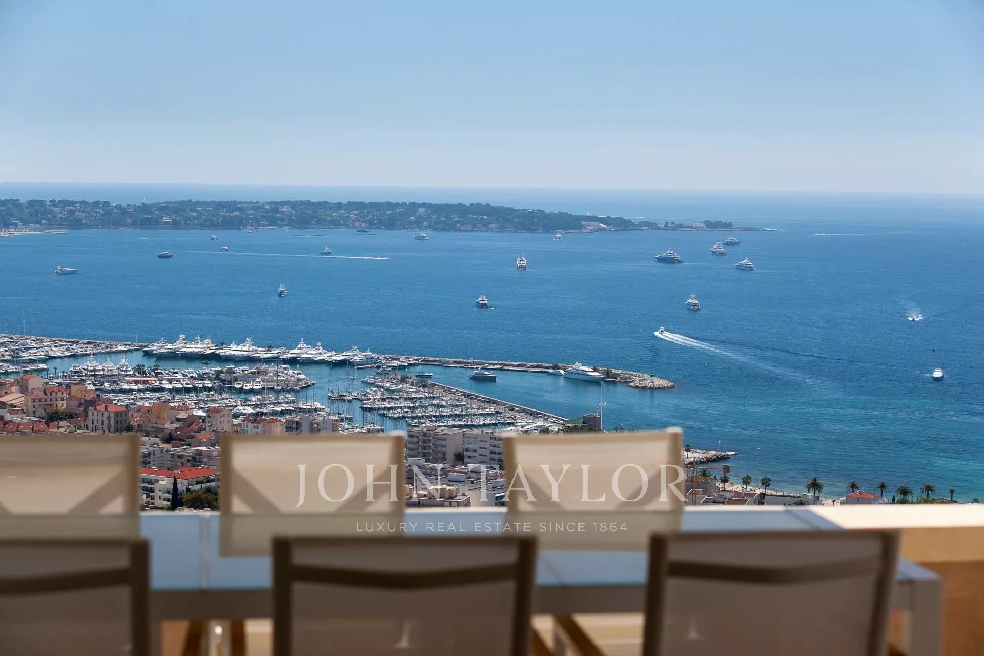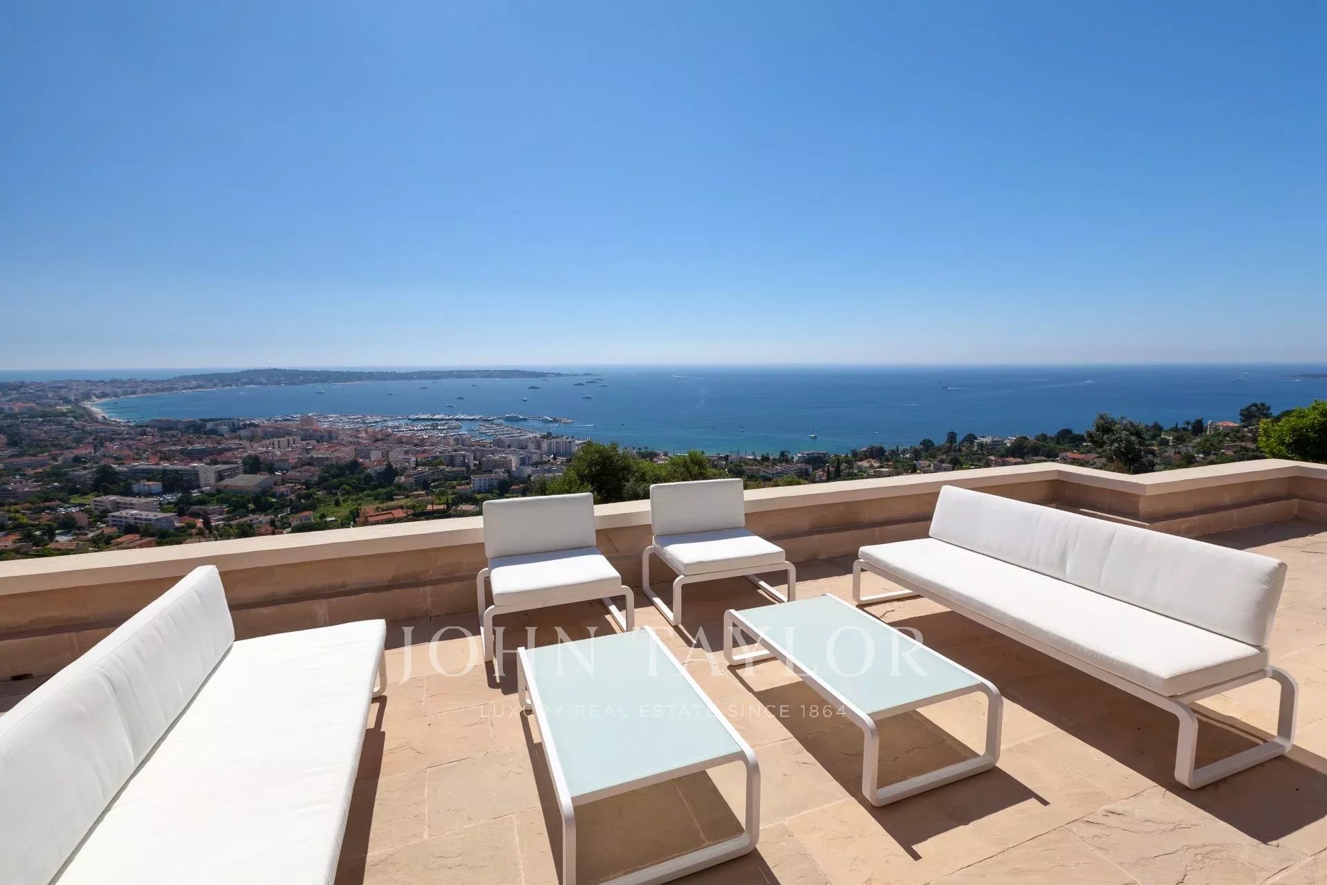 На возвышенности Канн, в самом сердце сада площадью 2 000 м2 с видом на юго-восток, великолепная вилла в современном стиле, полностью отремонтированная и оснащенная кондиционерами, с великолепным видом на море до Кап д'Антиб.