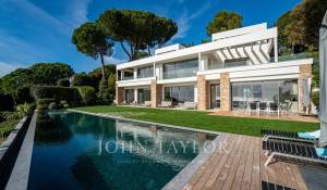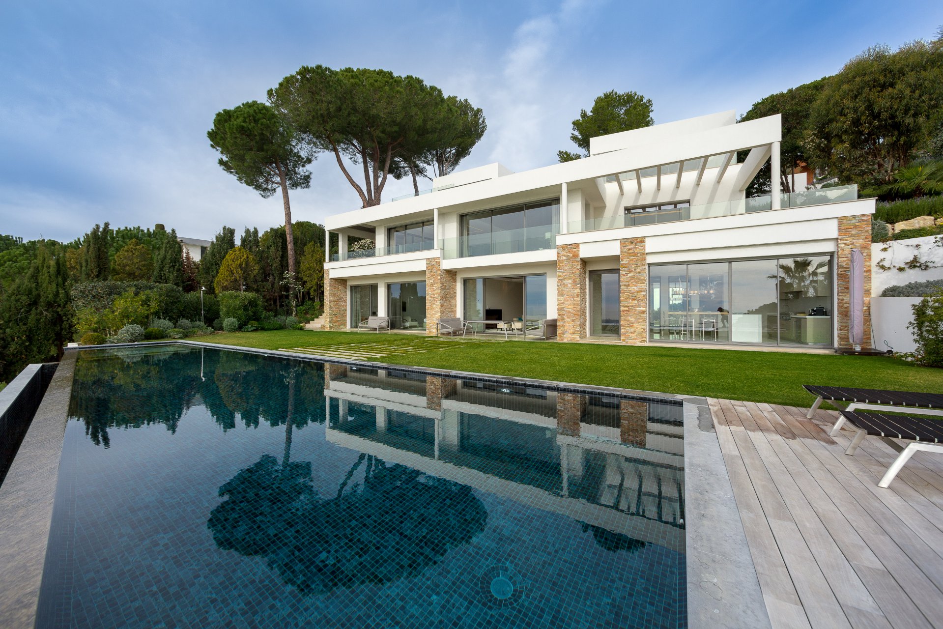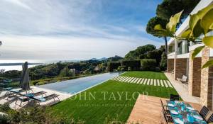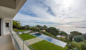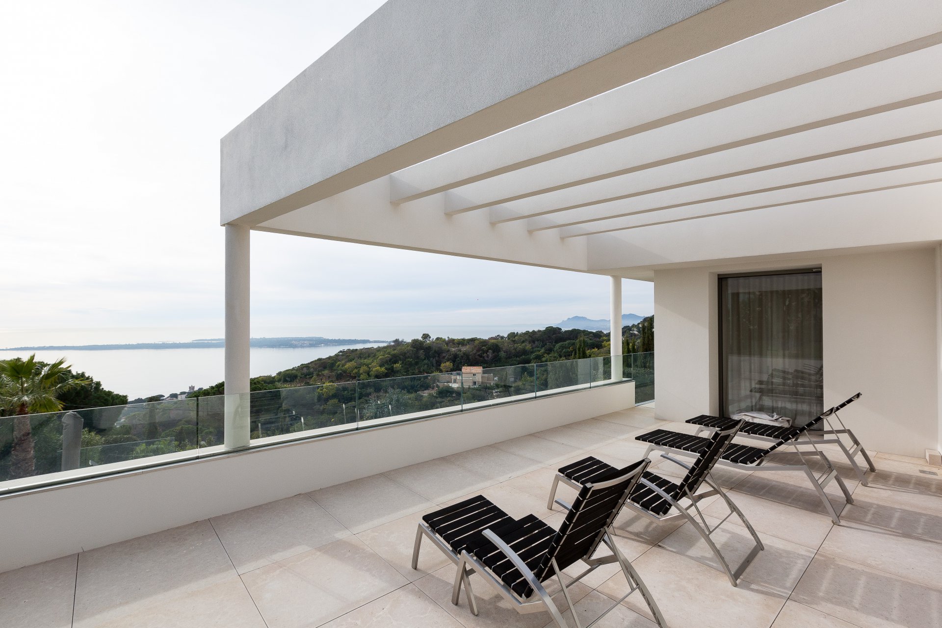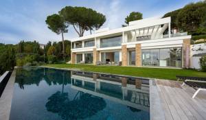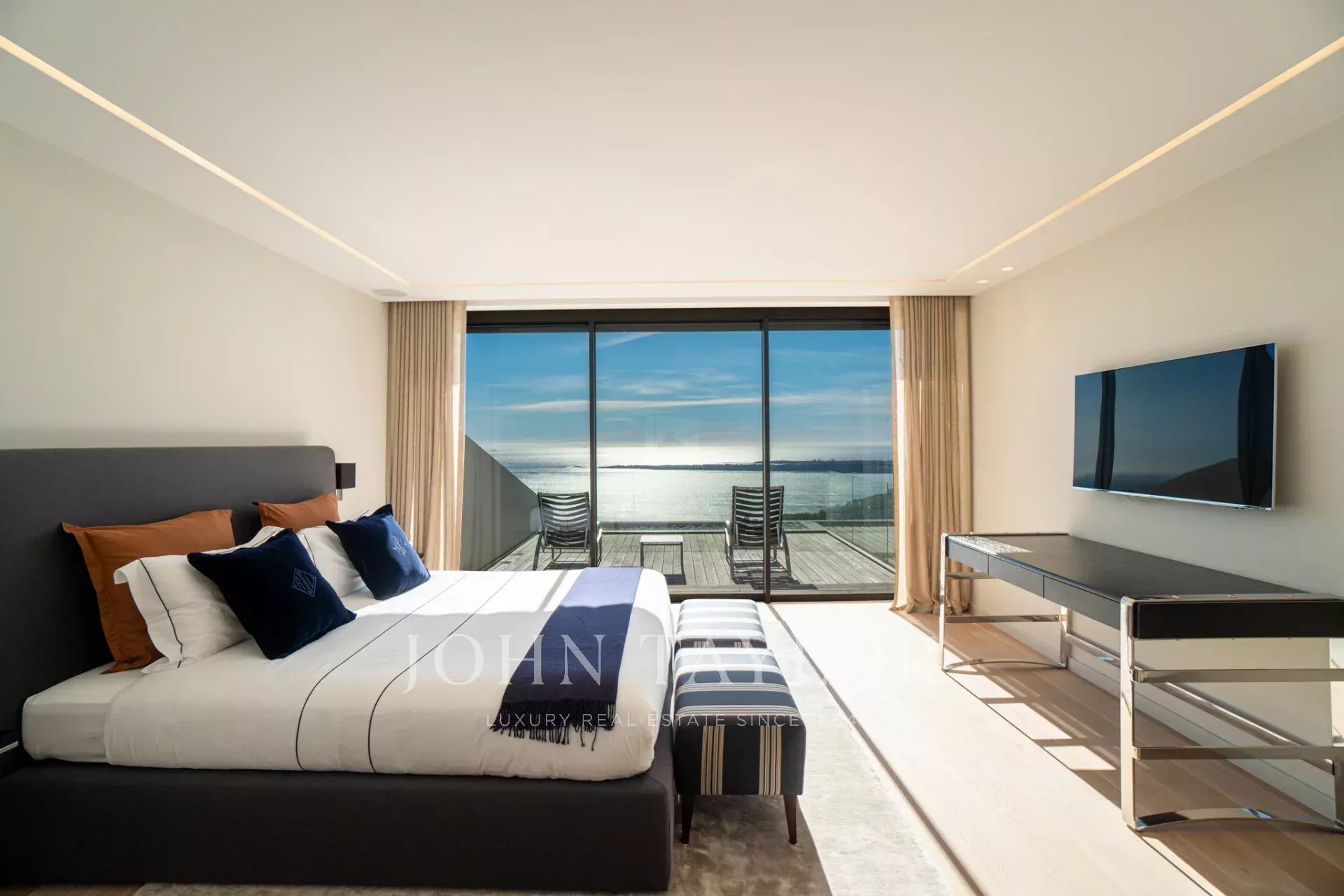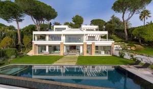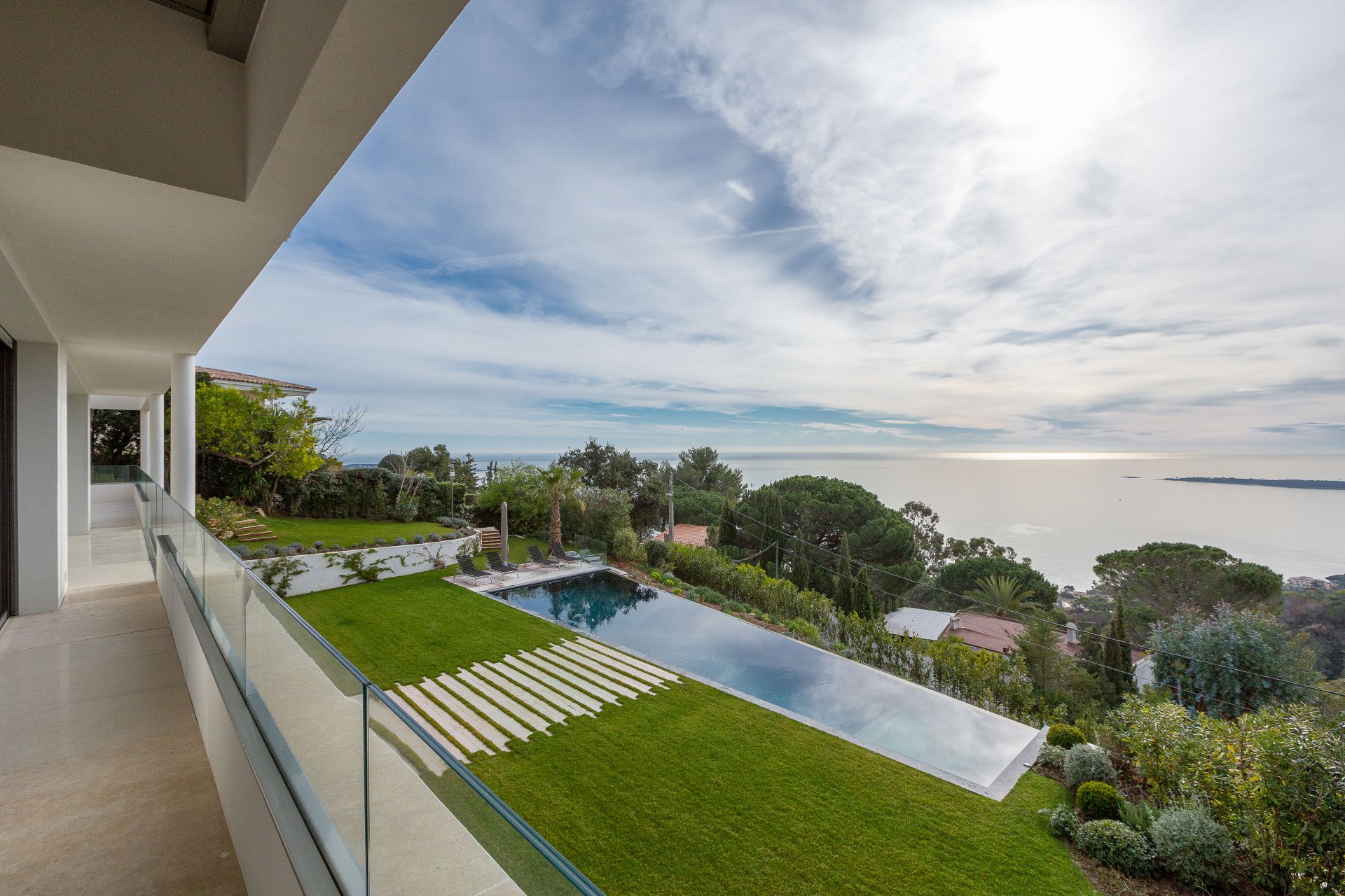 На возвышенности Канн, в доминирующем положении с панорамным видом на море, Леринские острова, Кап д'Антиб и массив Эстерель, новая красивая вилла в современном стиле с кондиционером и высококачественным оборудованием, площадью около 630 м² на прекрасном участке площадью 2 000 м².