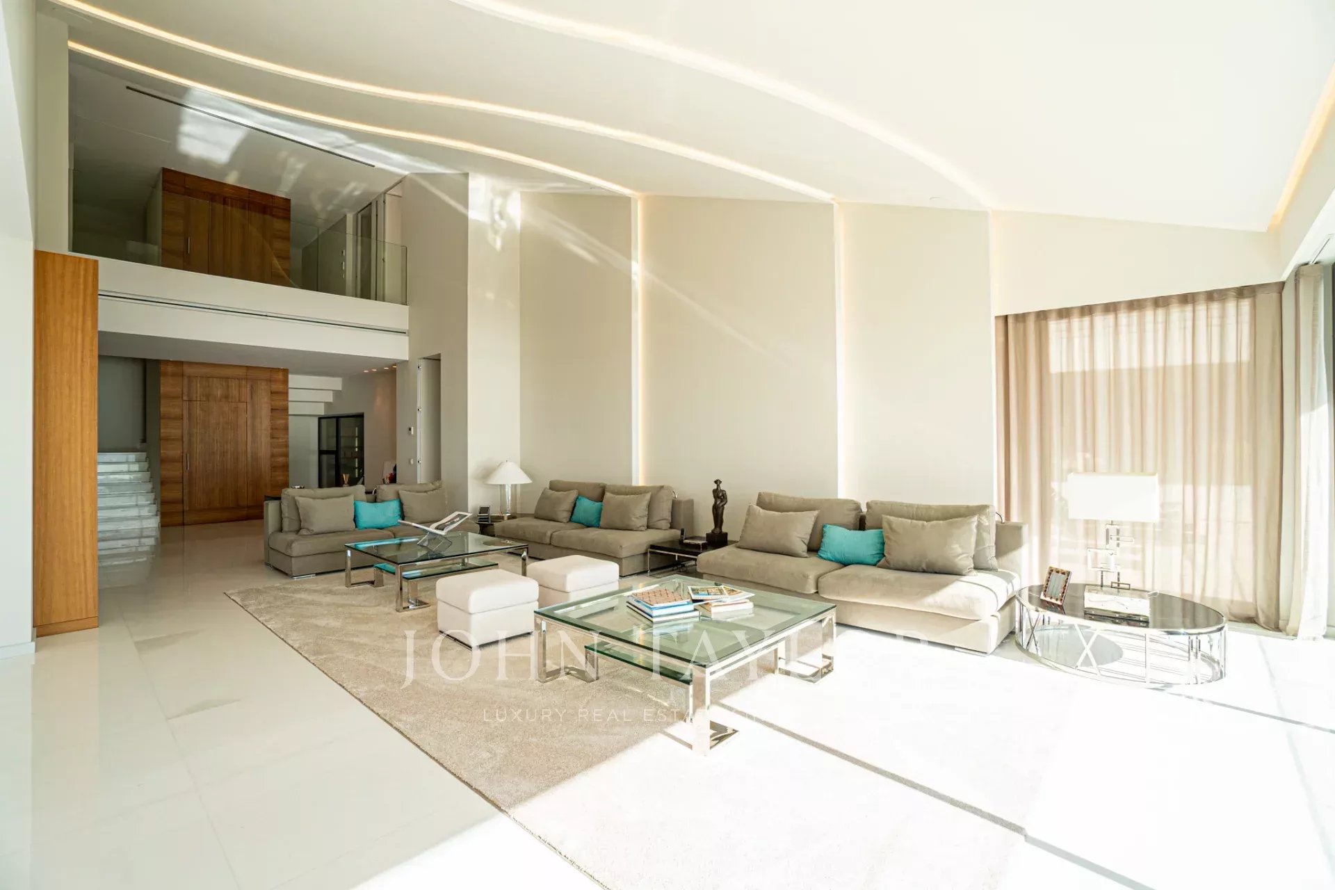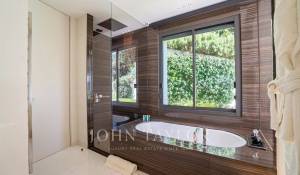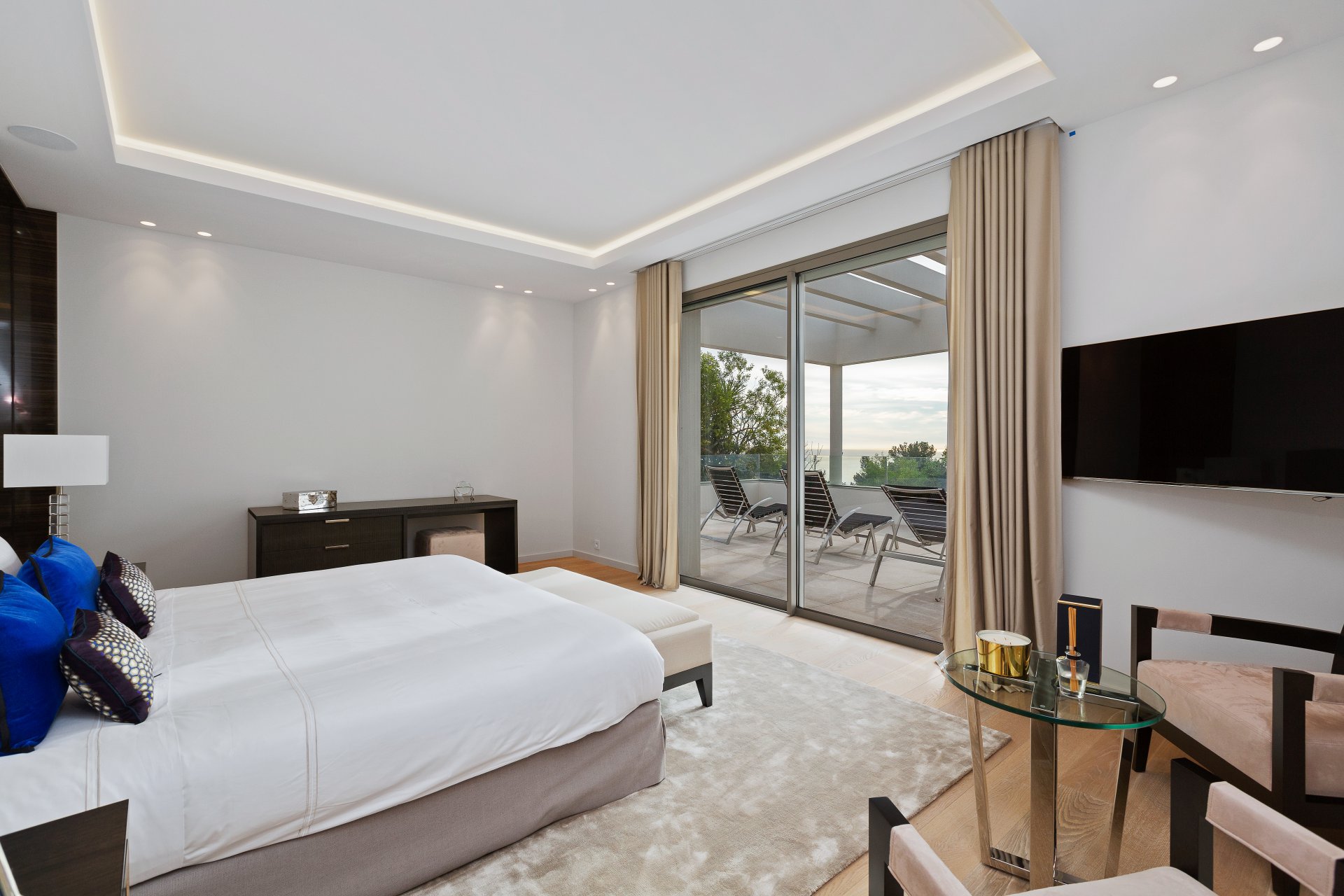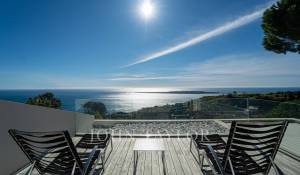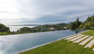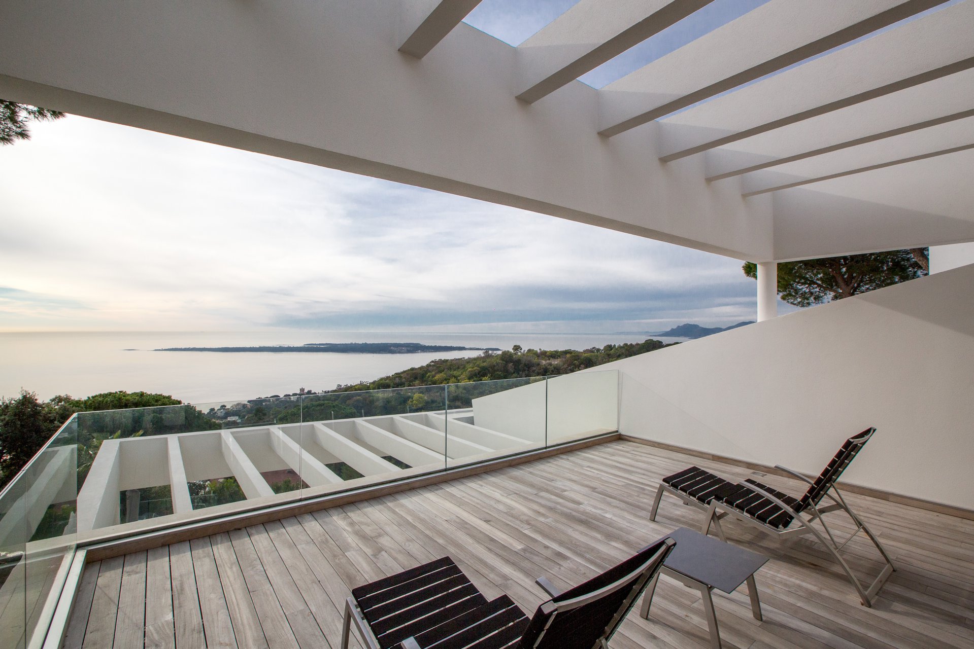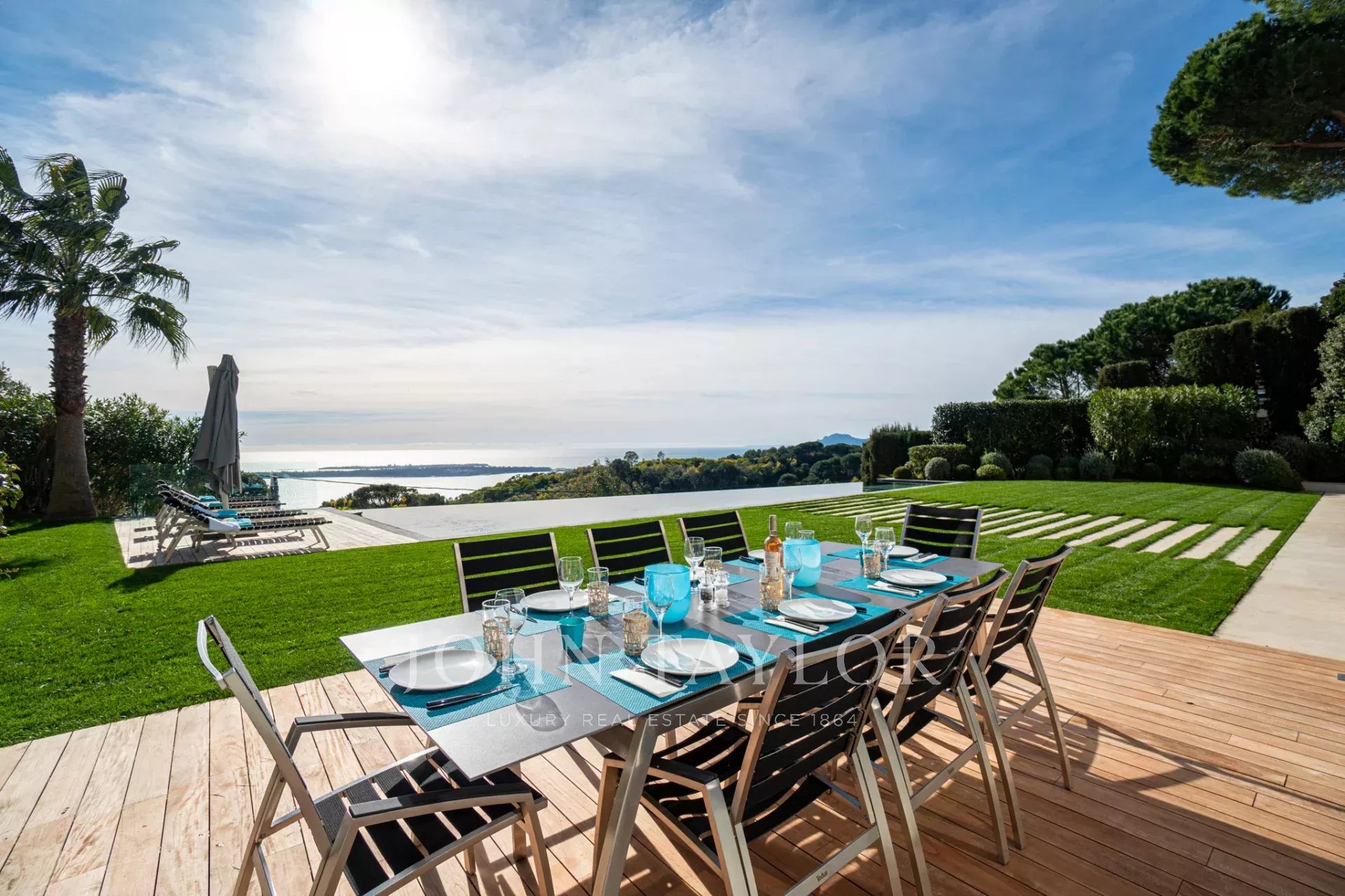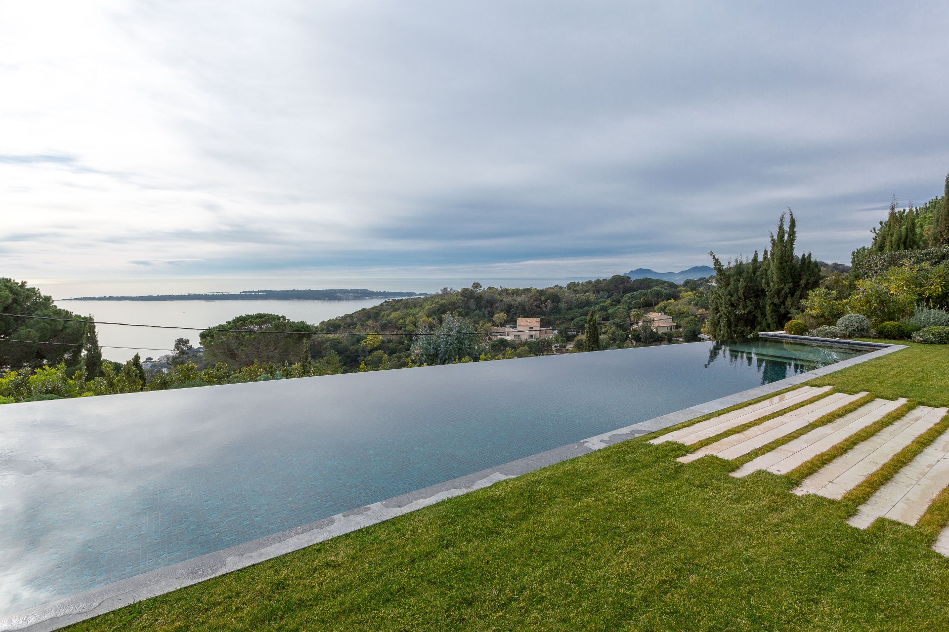 На возвышенности Канн, в доминирующем положении с панорамным видом на море, Леринские острова, Кап д'Антиб и массив Эстерель, новая красивая вилла в современном стиле с кондиционером и высококачественным оборудованием, площадью около 630 м² на прекрасном участке площадью 2 000 м².