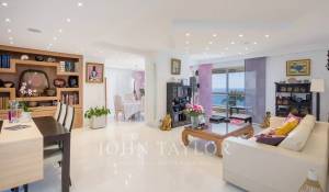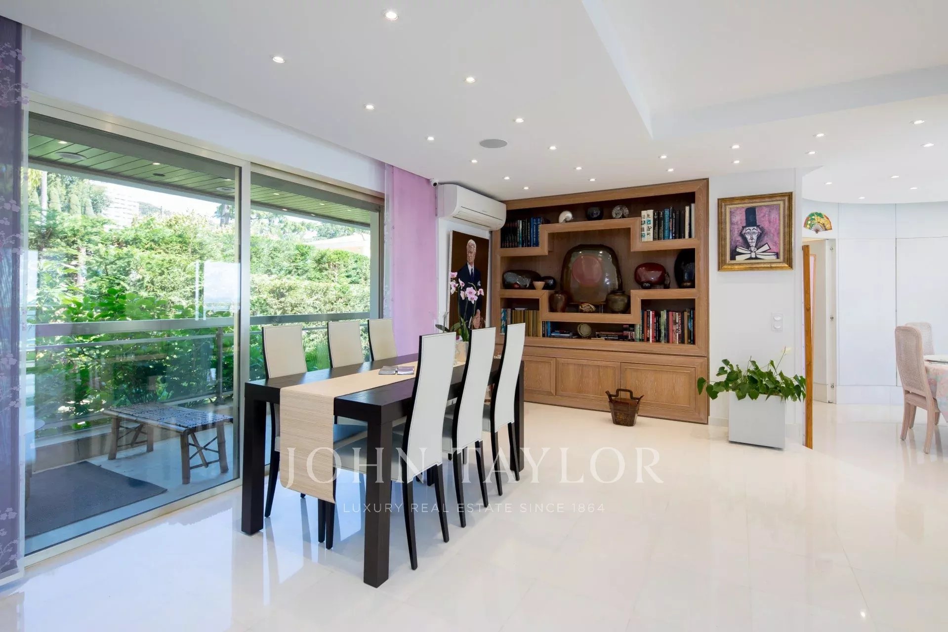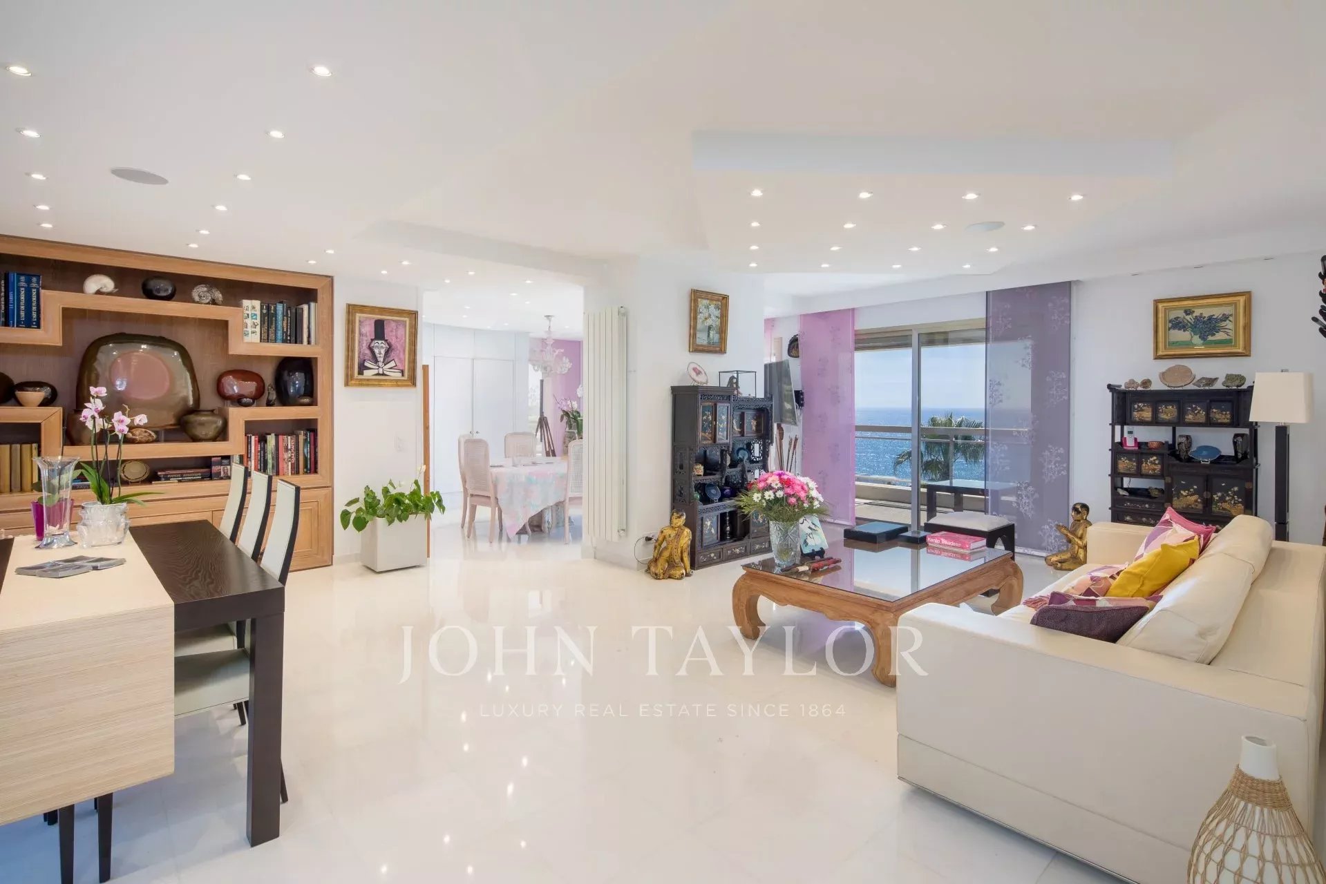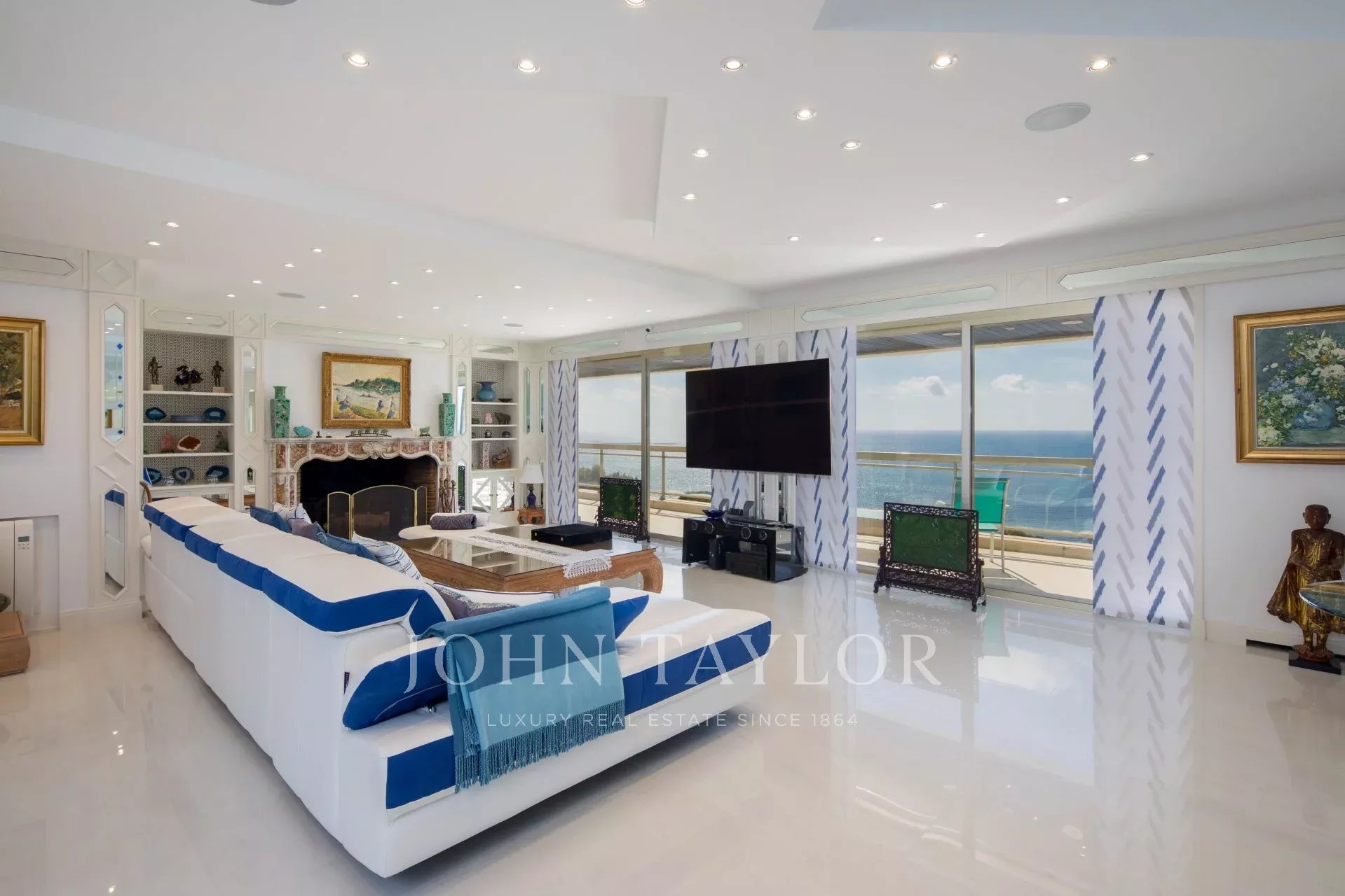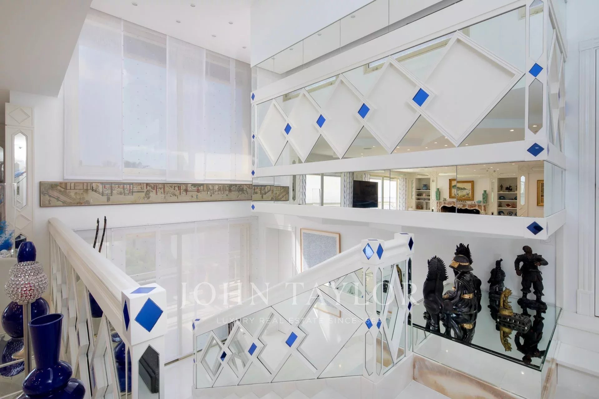 Прихожая, ведущая в двойную гостиную/столовую, выходящую на террасу с видом на Каннский залив и Леринские острова.