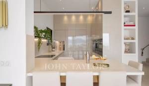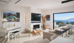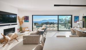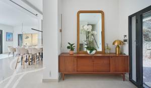 Прихожая, ведущая в гостиную, столовую и кухню открытого плана, выходящую на террасу и к бассейну с видом на море.