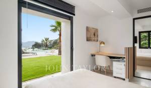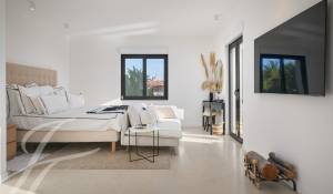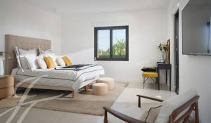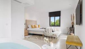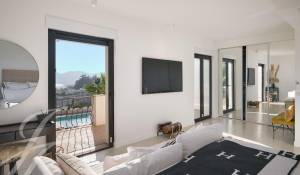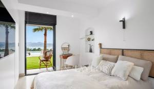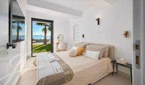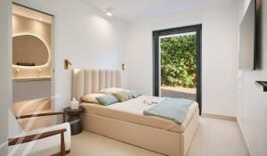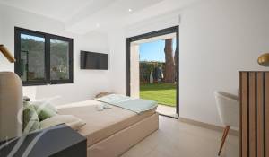 Спальня (двуспальная кровать) с телевизором, выходящая в сад и к бассейну, вид на море.
