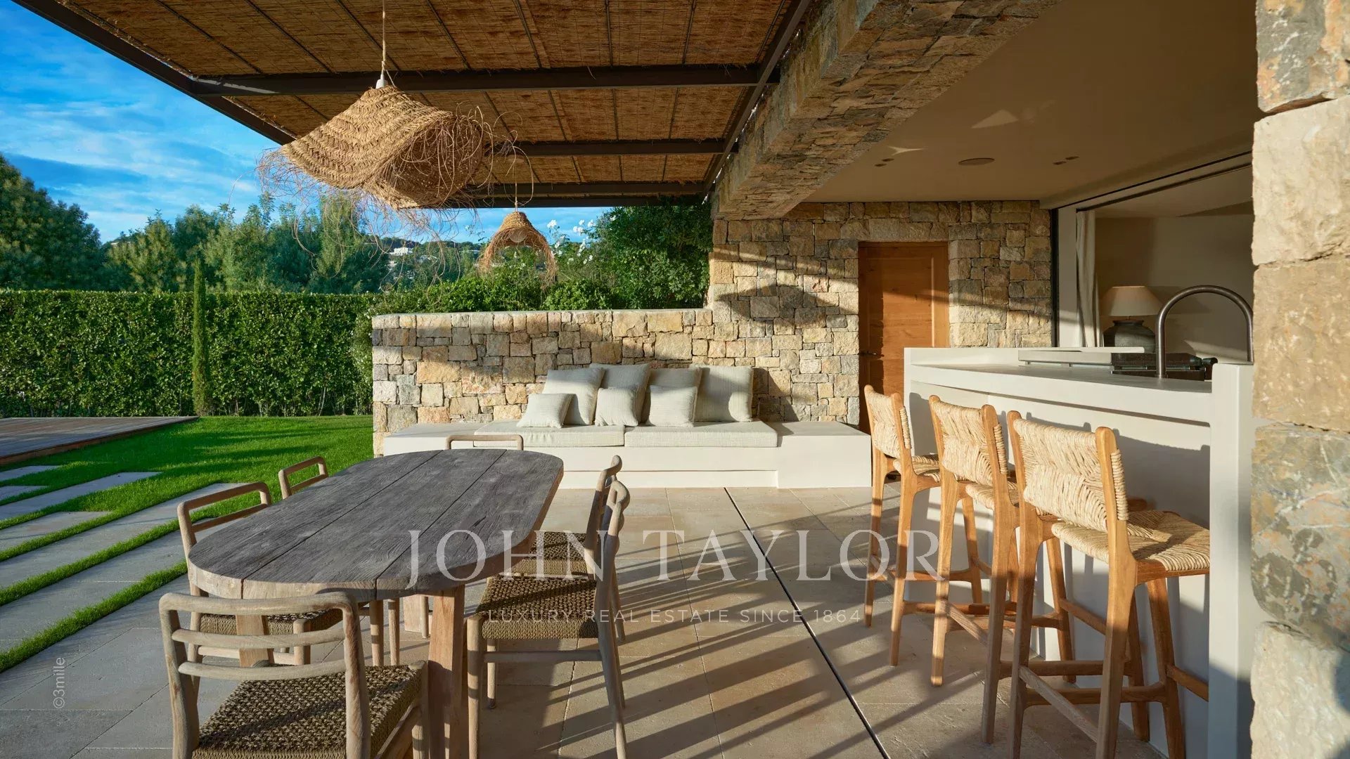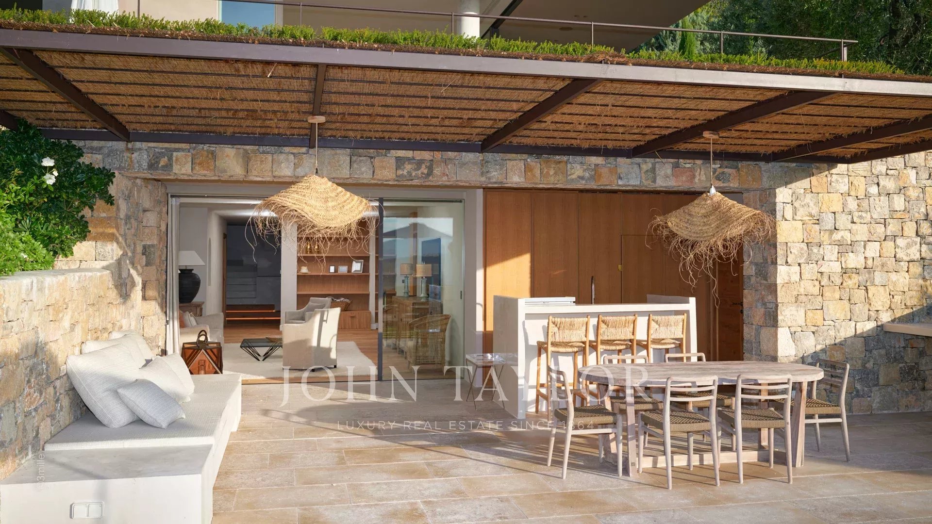 Большая ТВ-гостиная, выходящая на крытую террасу с летней кухней / баром / столовой с газовым барбекю, плитой, посудомоечной машиной и холодильником