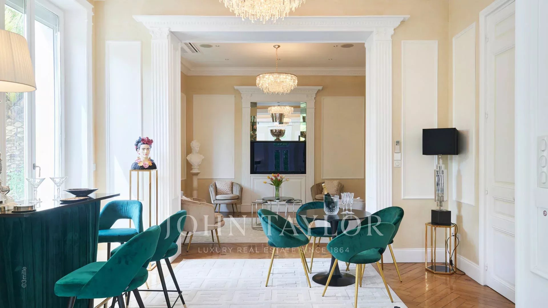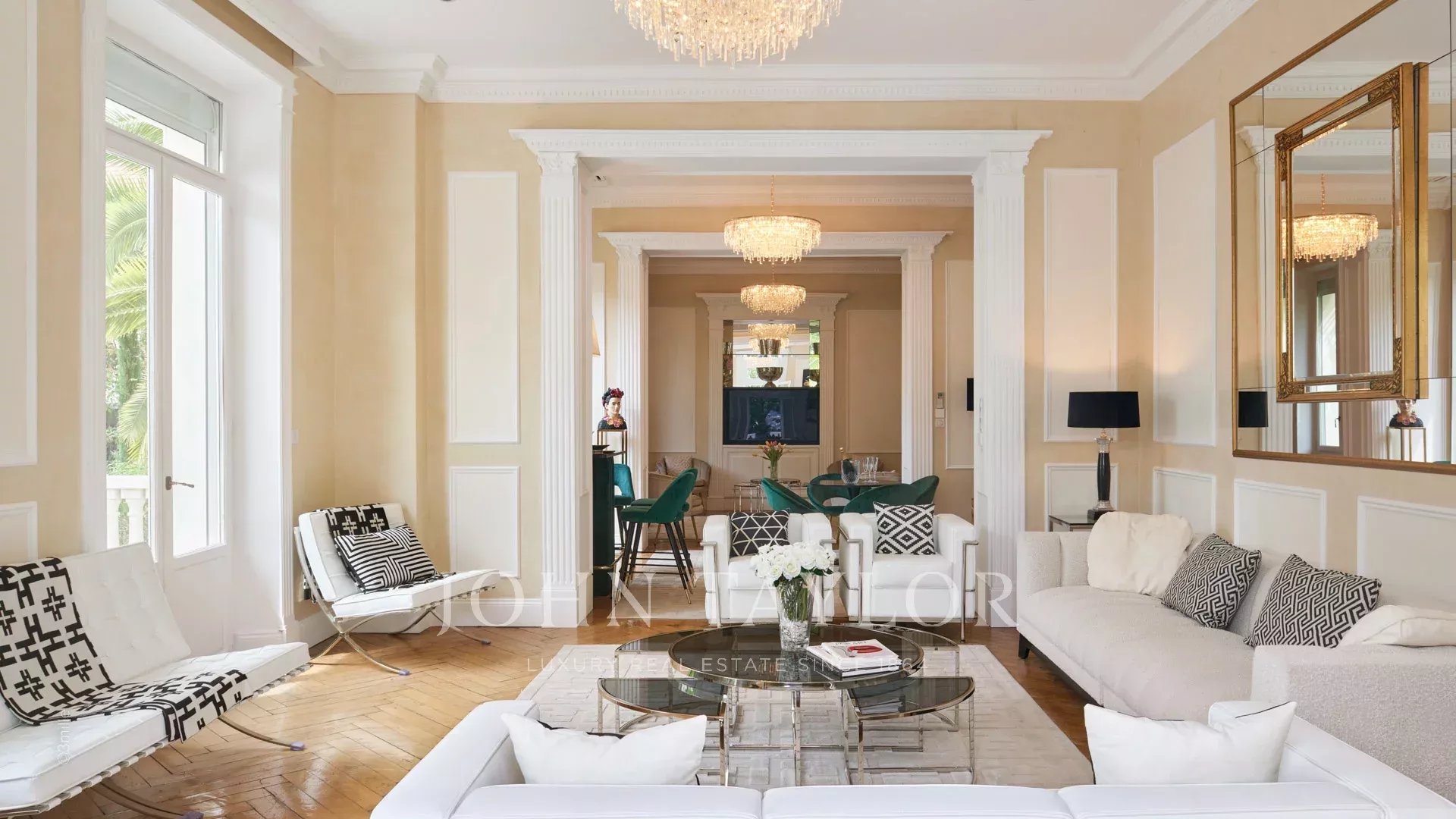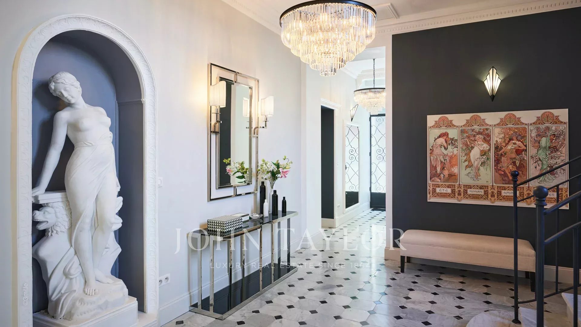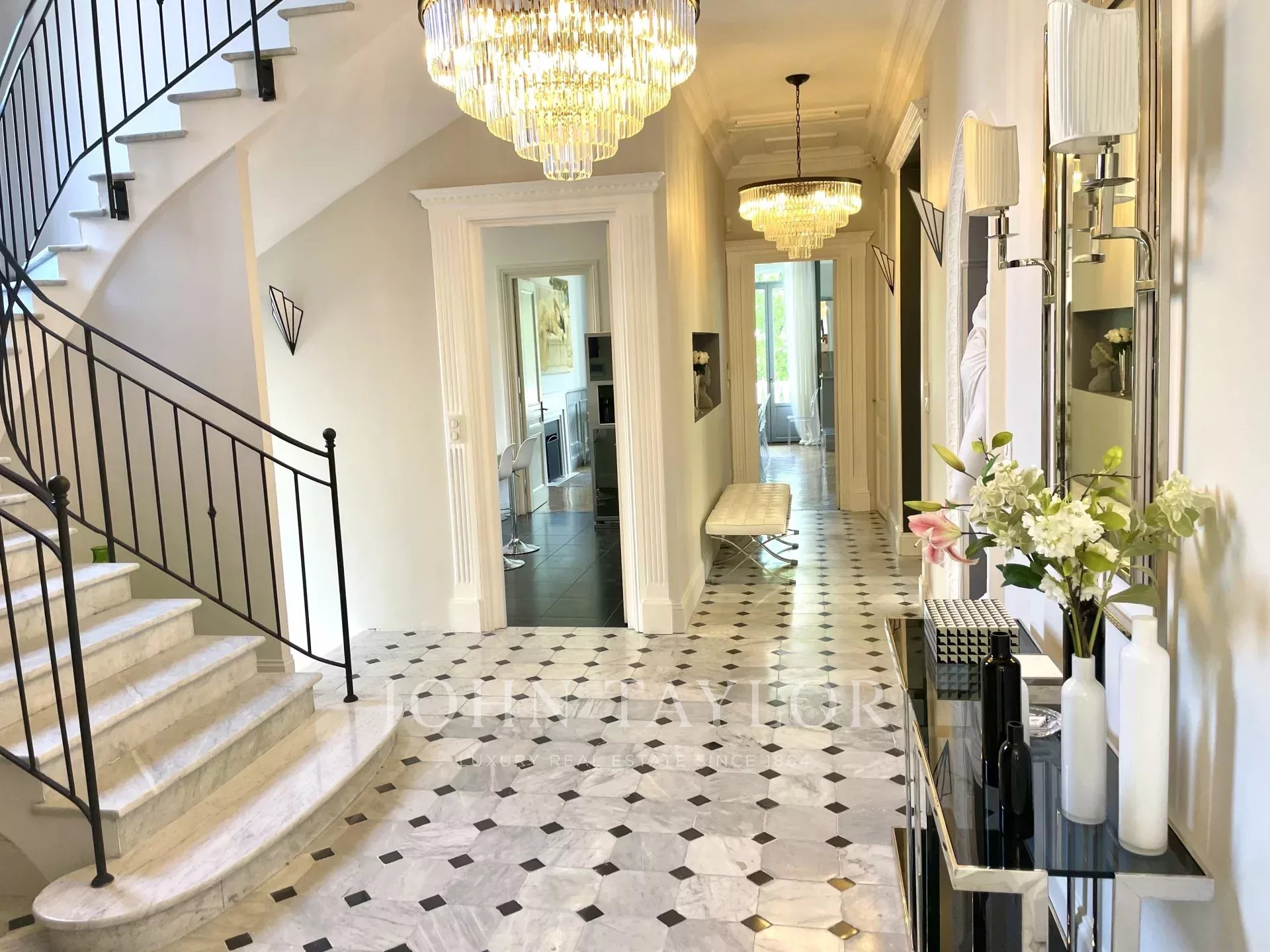 Элегантная прихожая, ведущая в тройную гостиную, выходящую на террасу площадью 60 м2 с видом на бассейн.