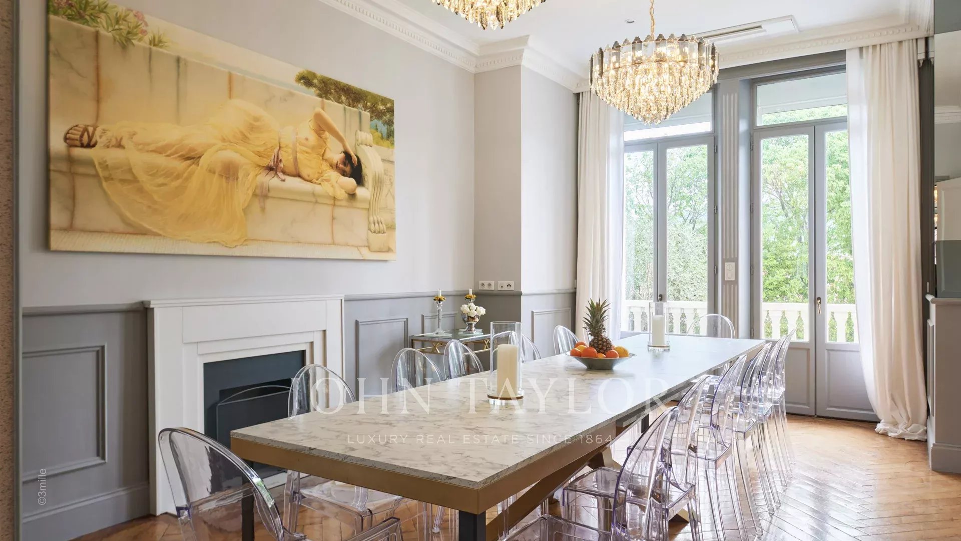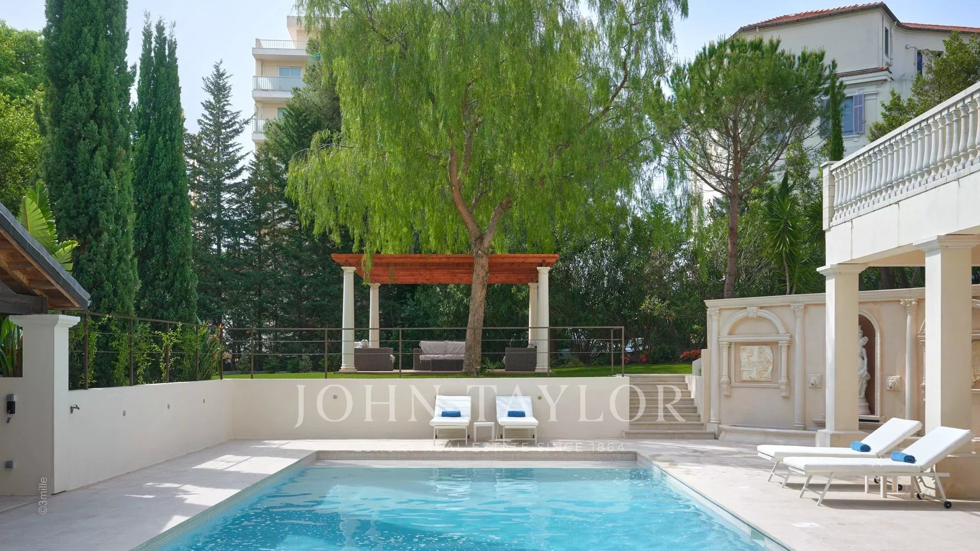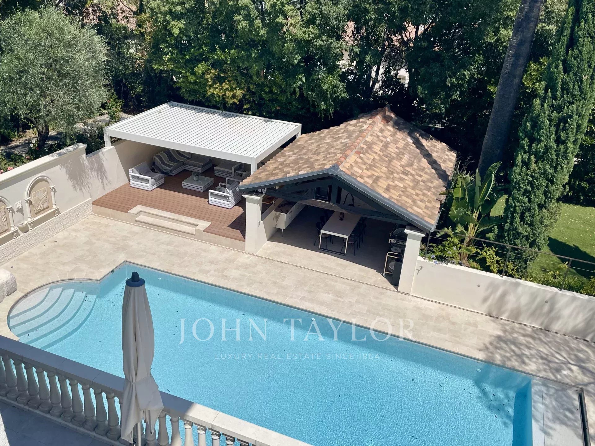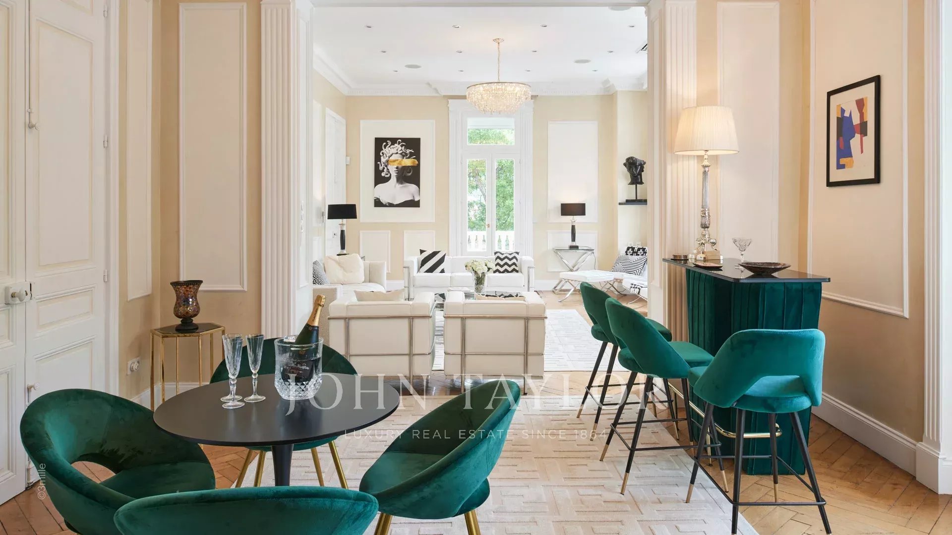 Элегантная прихожая, ведущая в тройную гостиную, выходящую на террасу площадью 60 м2 с видом на бассейн.